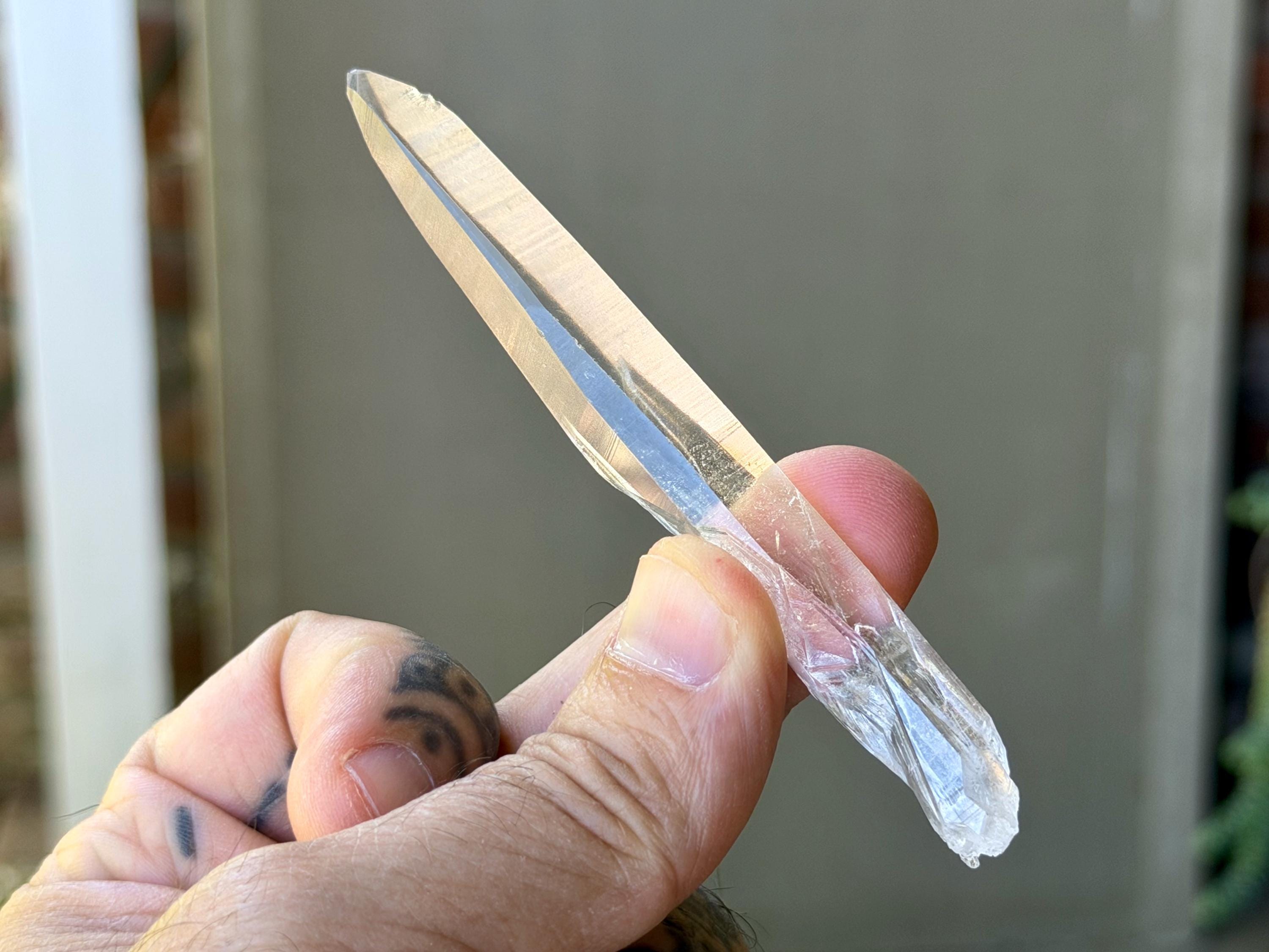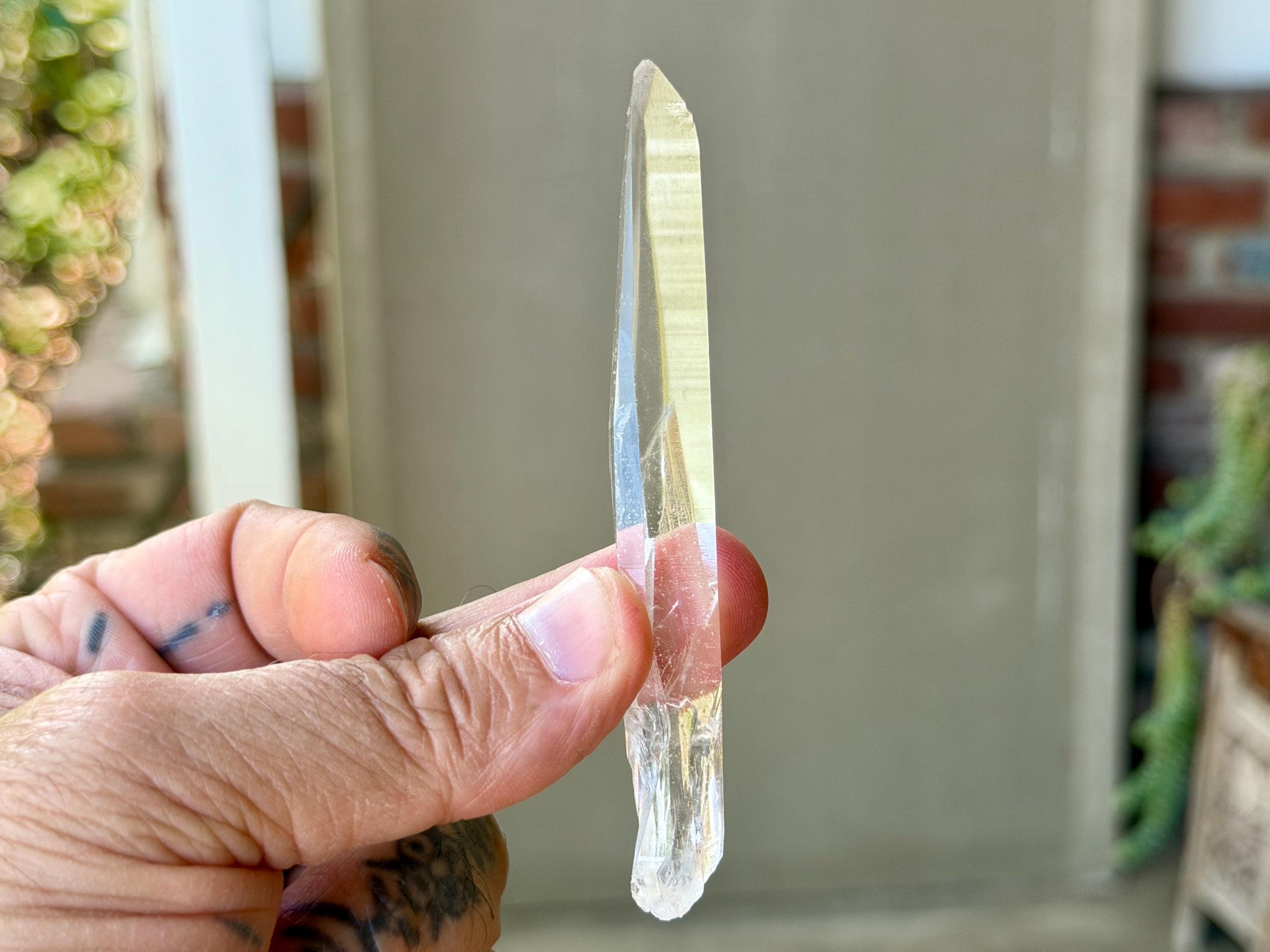 *Please note this crystal is clear and colorless. Any yellow hues in the photos are from the natural sunlight and surrounding environment reflecting off the crystal.