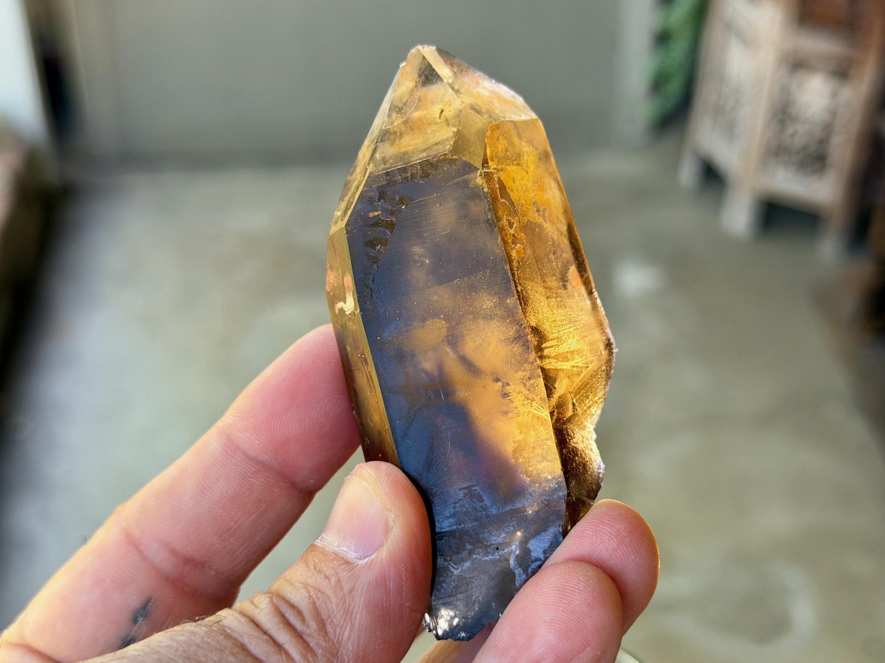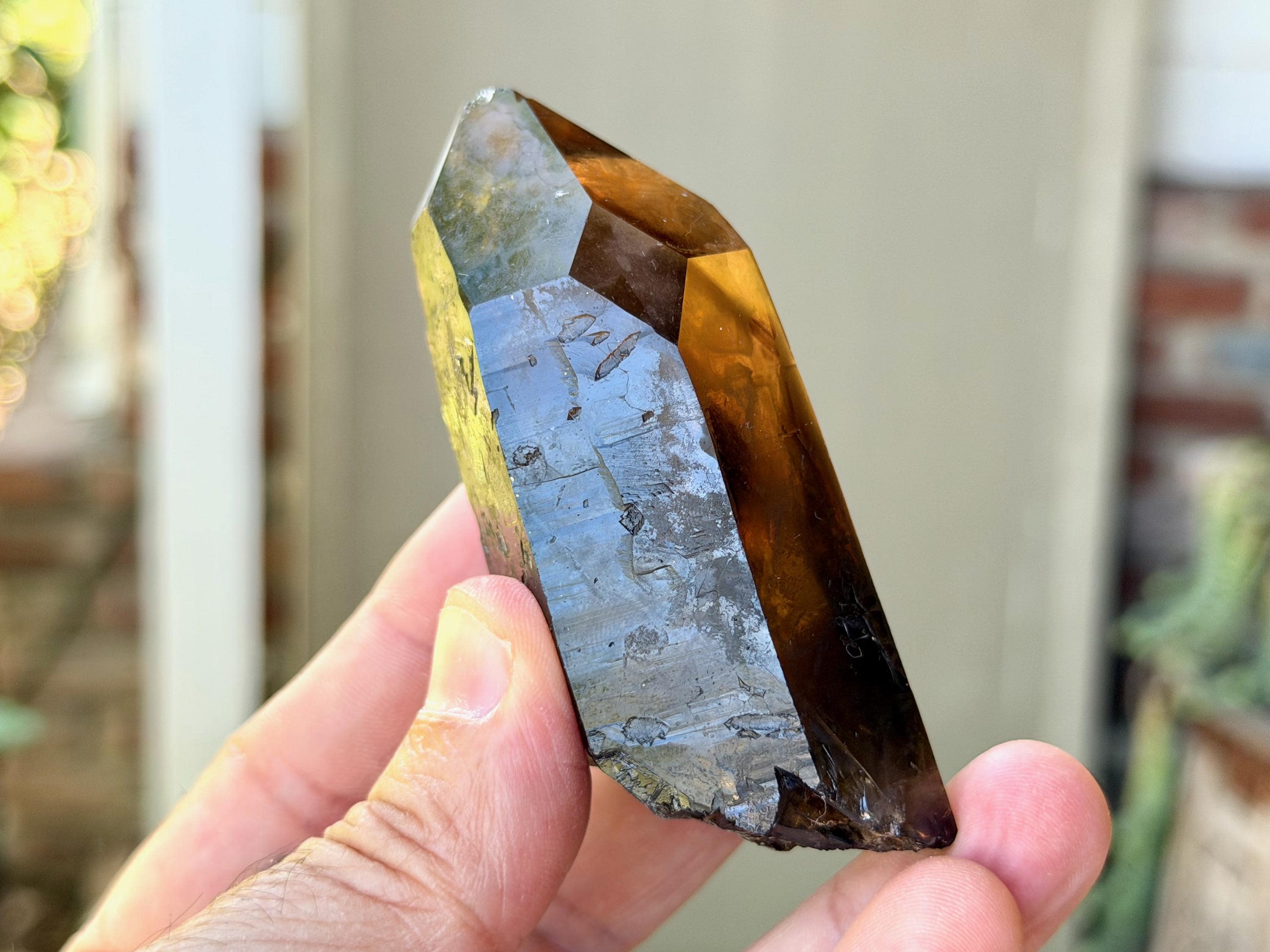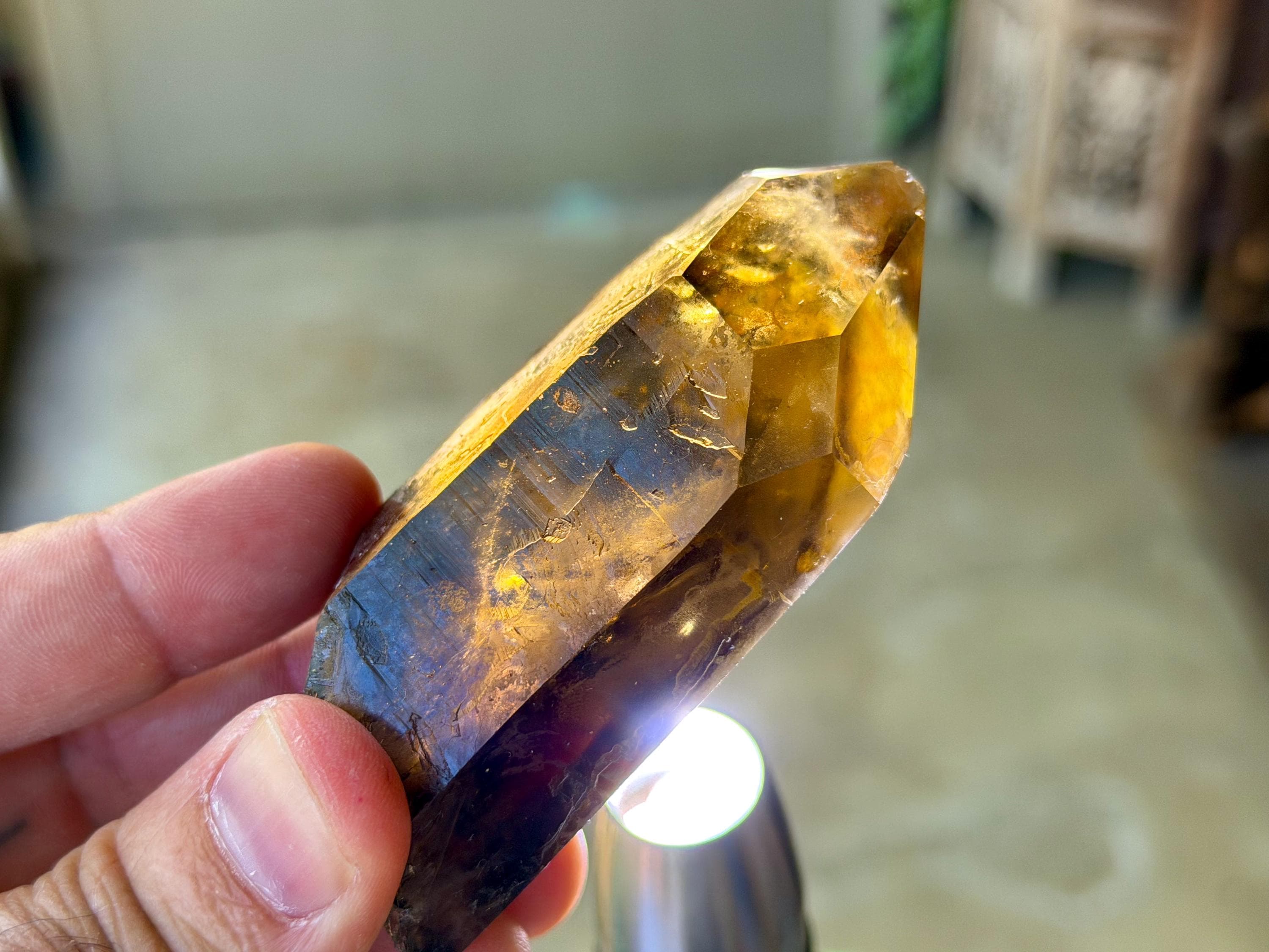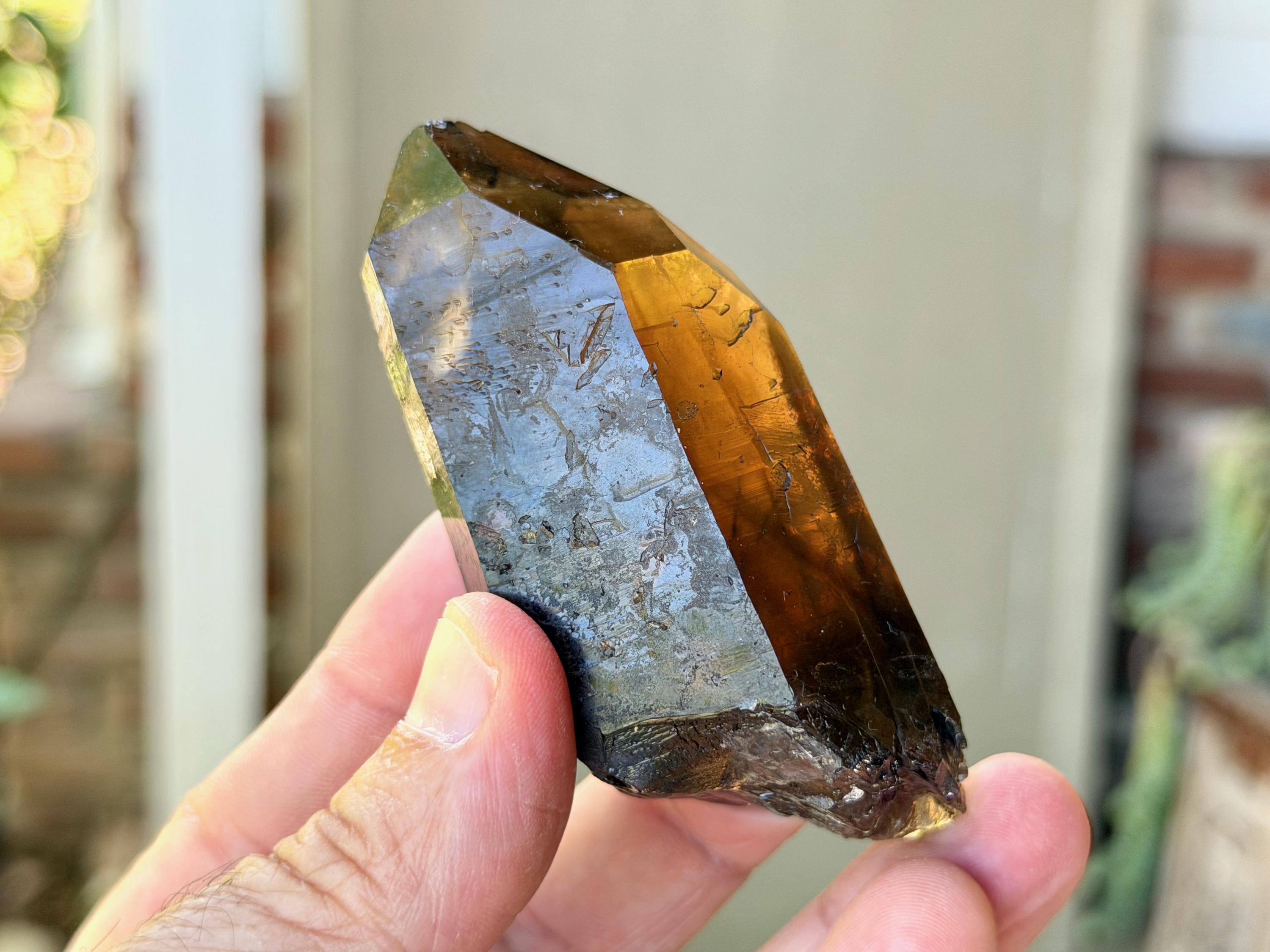 Handsome luster and a deep smoky-golden hue to this superb Pele's Dream Lemurian. This crystal exhibits the gradient color zoning we love to see on these crystals, with a darker smoky base that blends into a slightly clearer and more golden top portion. When backlit, as in Photos 3-5, we can see just how brilliantly it lights up.