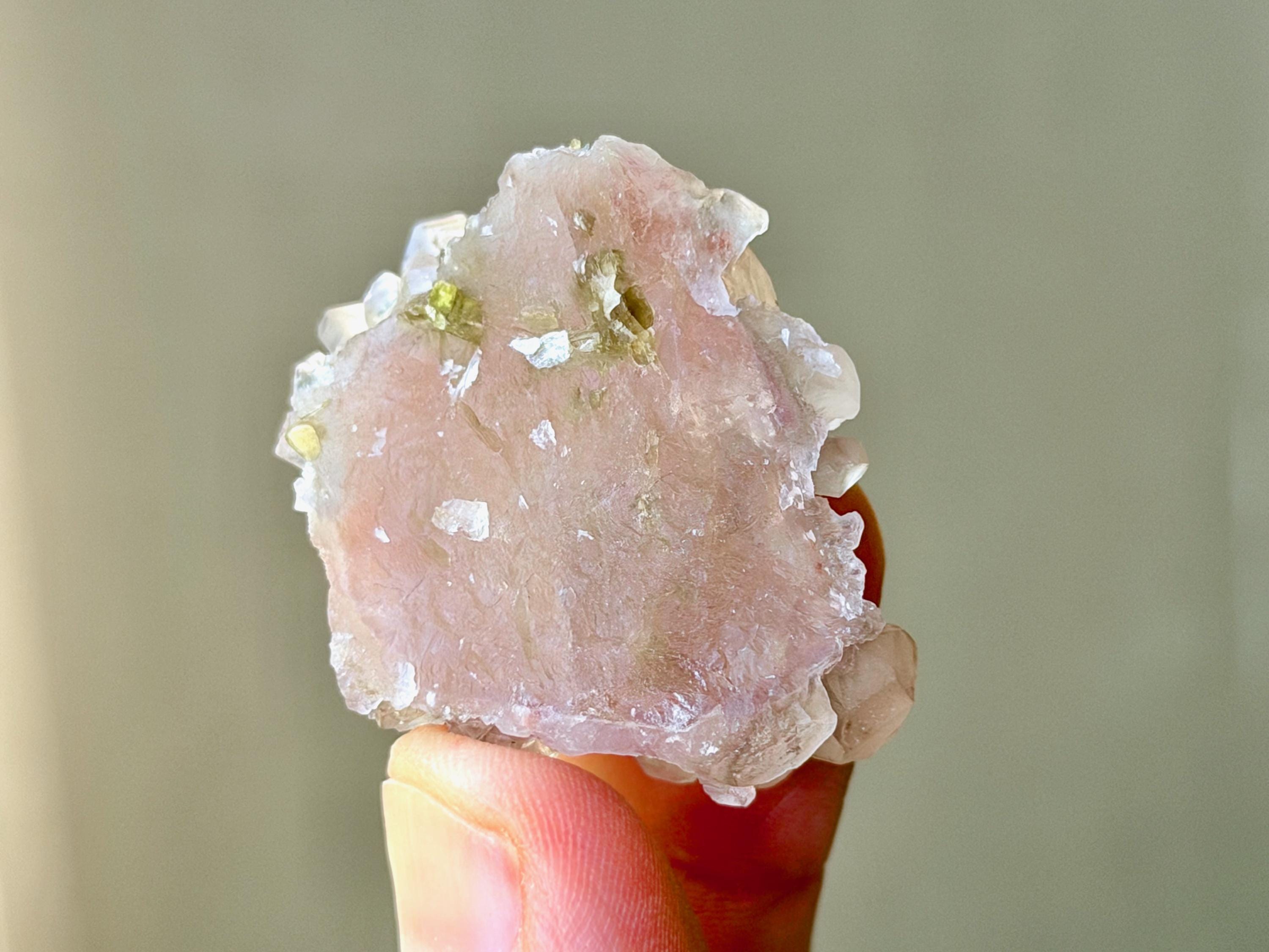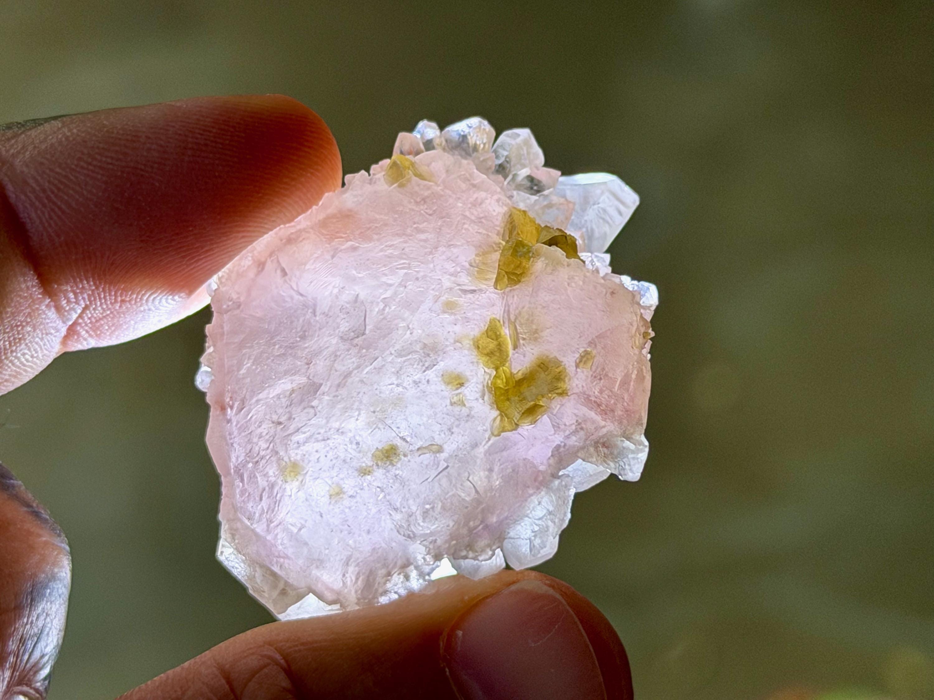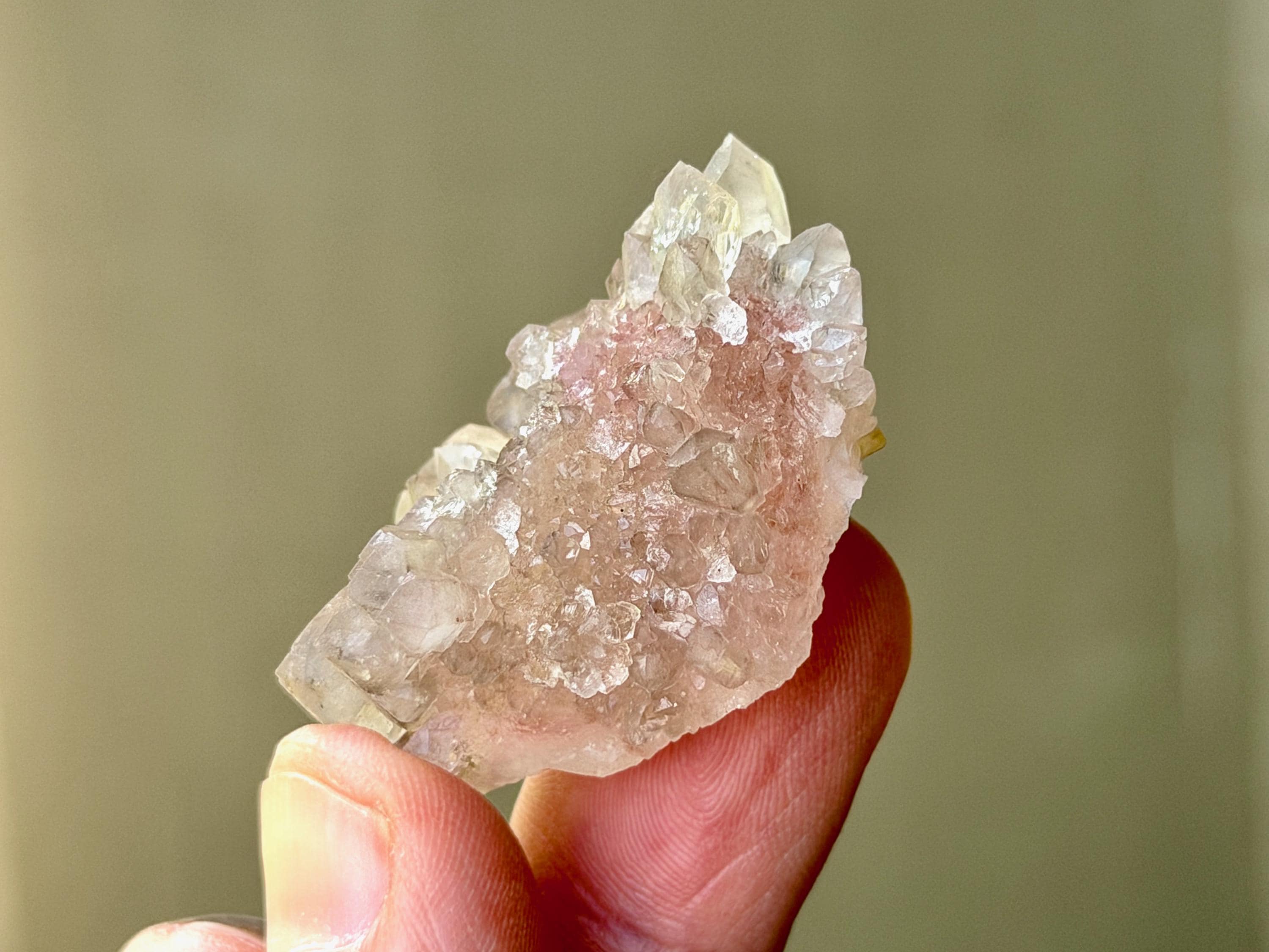 This crystal exhibits such a beautiful form, with so many individual points in an almost Elestial formation. In the center, the pink Canga Rose Quartz comes through beautifully like a heart. On the underside, we see some sparkling Golden Mica inclusions.