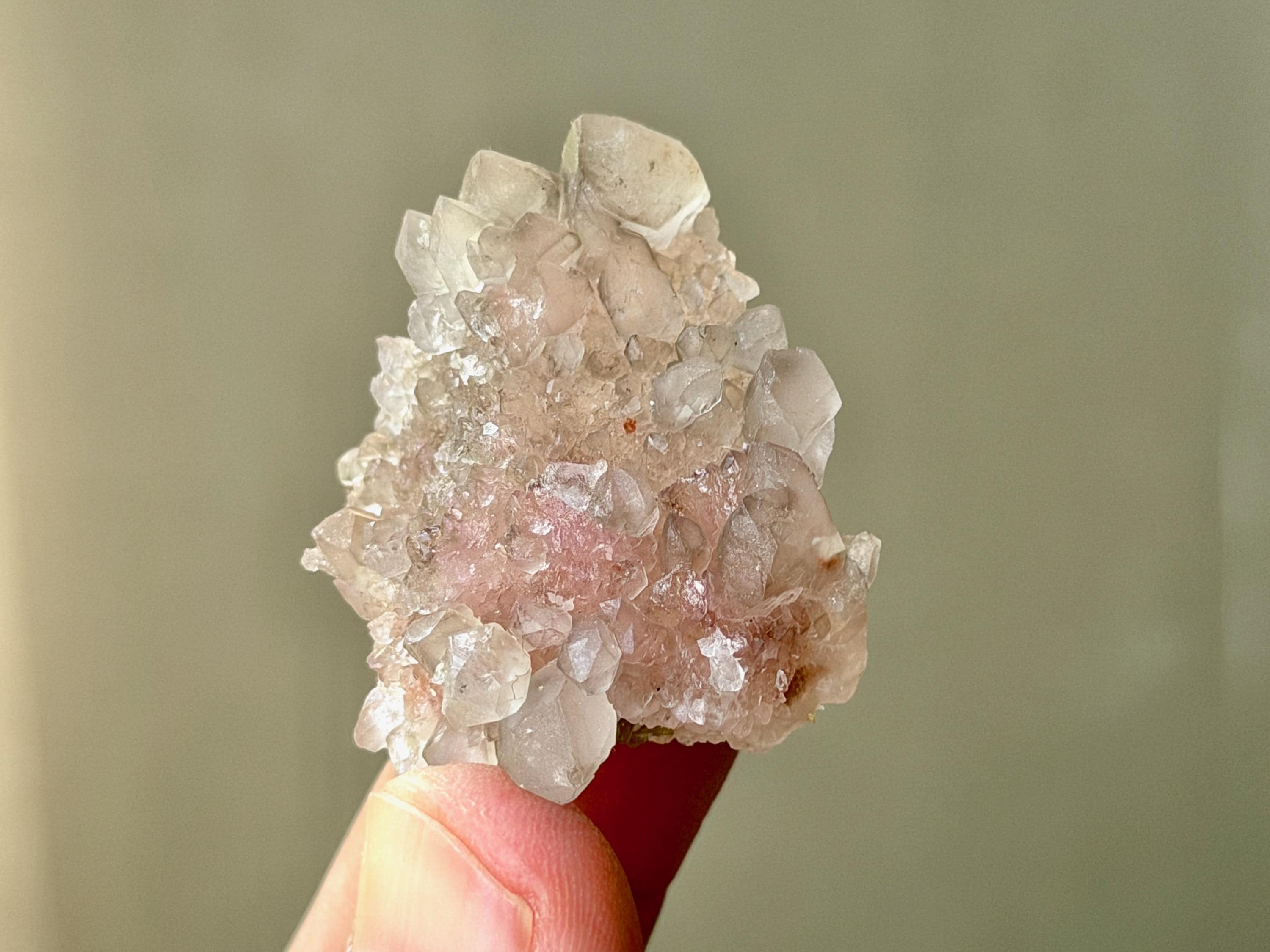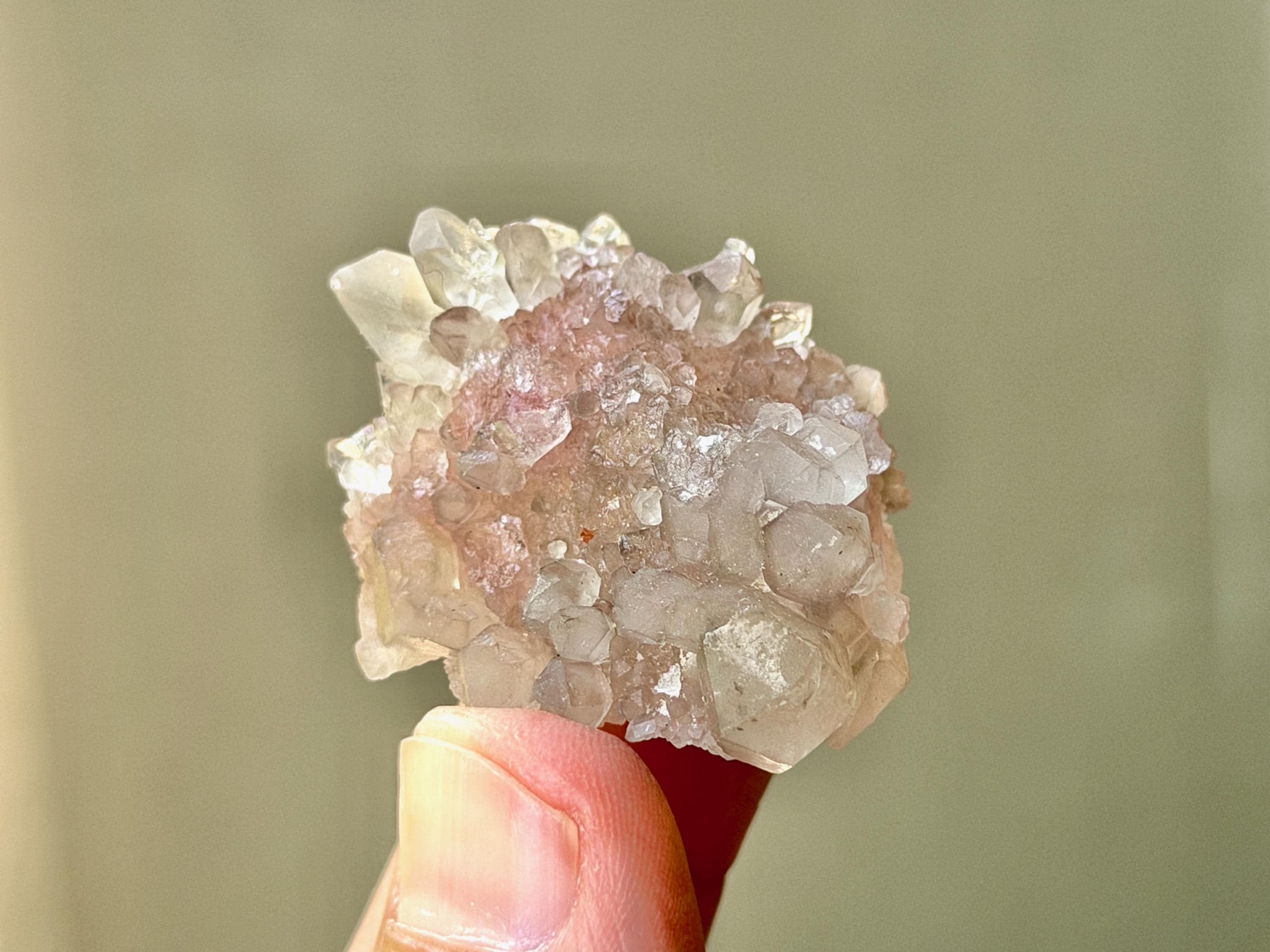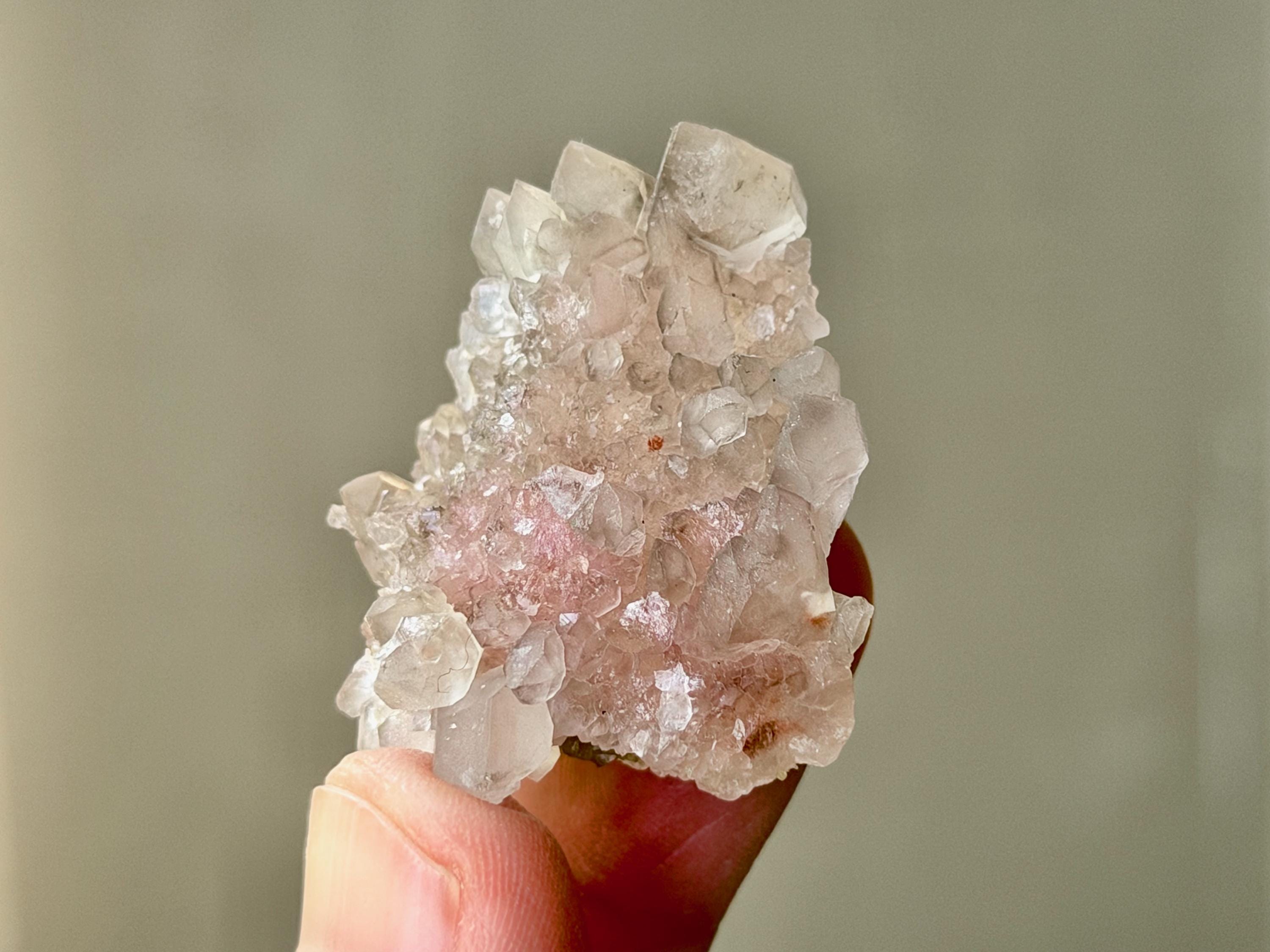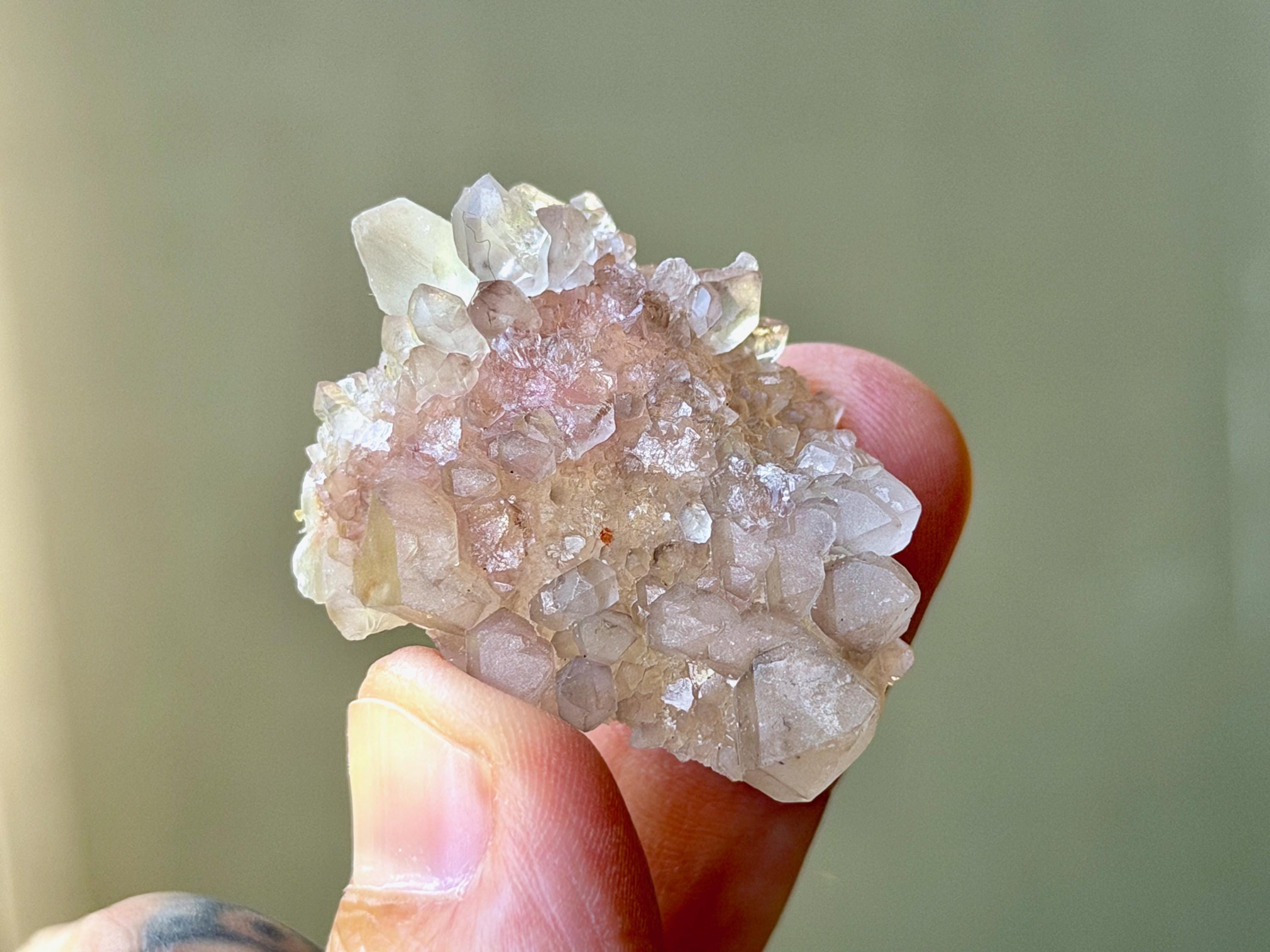 This crystal exhibits such a beautiful form, with so many individual points in an almost Elestial formation. In the center, the pink Canga Rose Quartz comes through beautifully like a heart. On the underside, we see some sparkling Golden Mica inclusions.