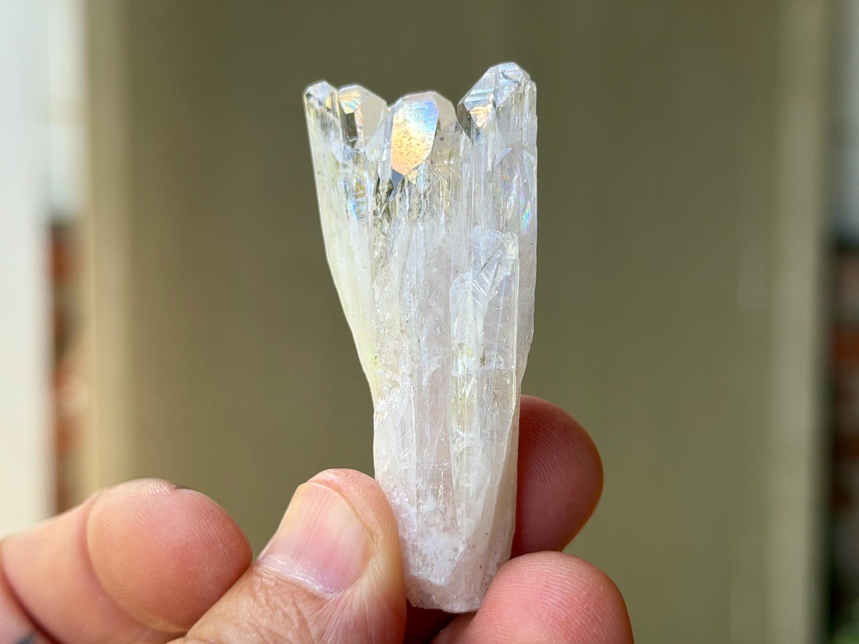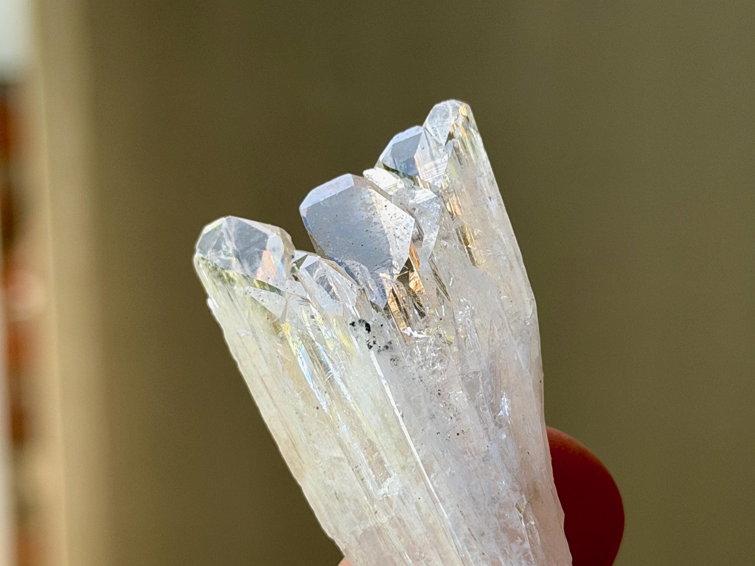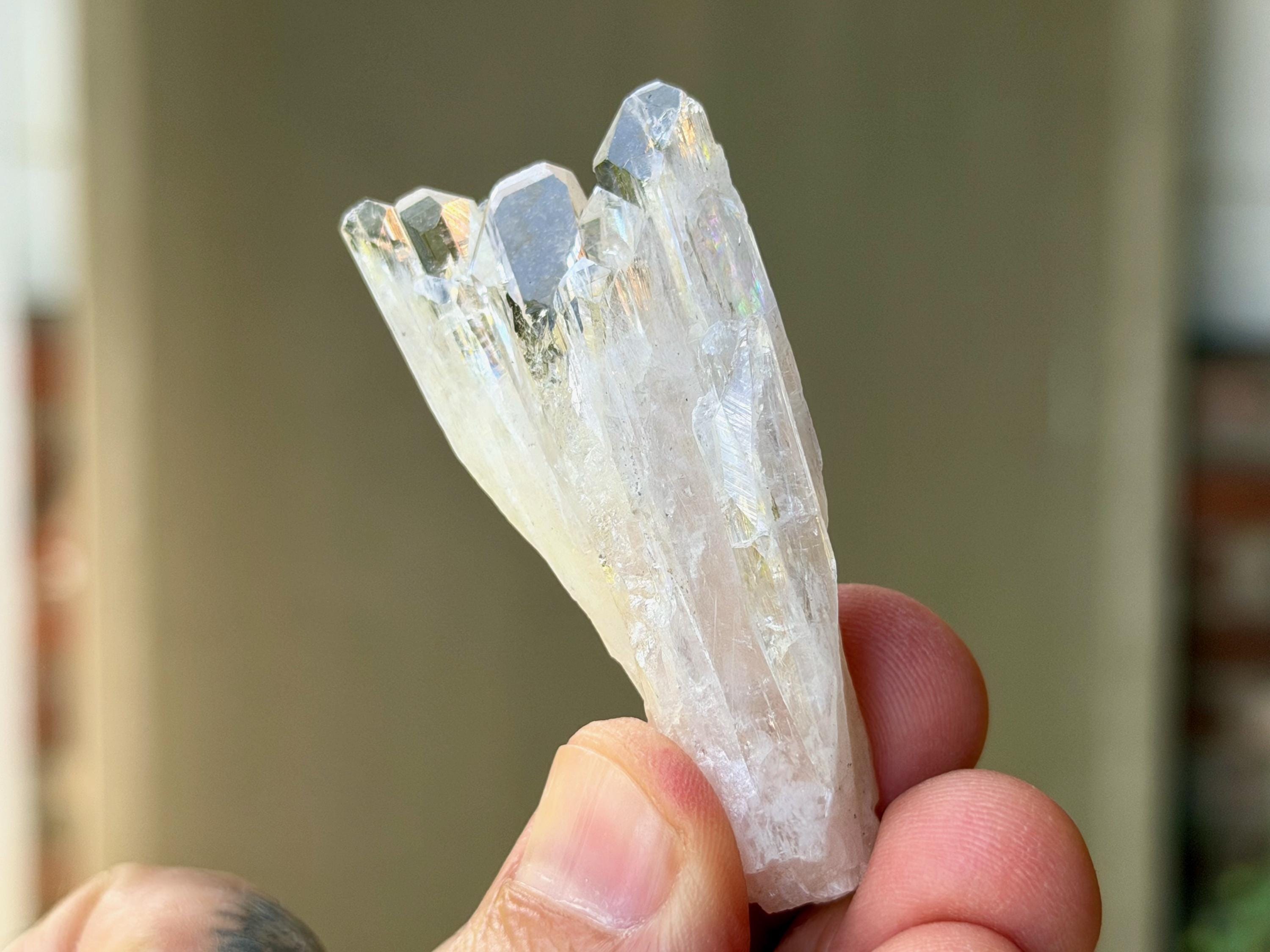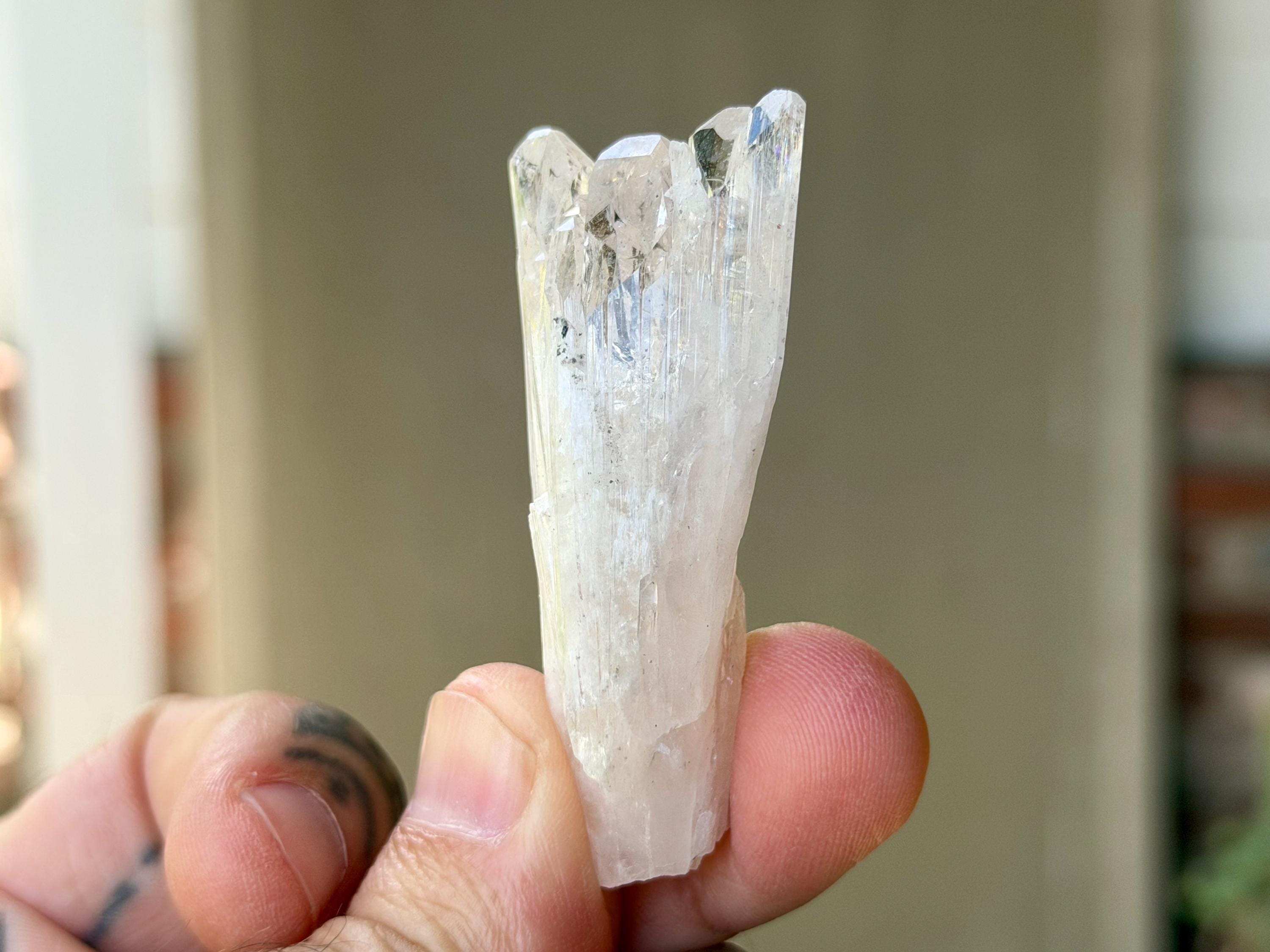 The elongated formation "blooms" at the top with a broad main facet area, that includes several individual facets. The complexion is glassy. While its hard to see in the photos, if you hold this crystal against a white background, you will notice the *slightest* pinkish tinge. And there's even a lovely sparkling rainbow on the left side near the top.