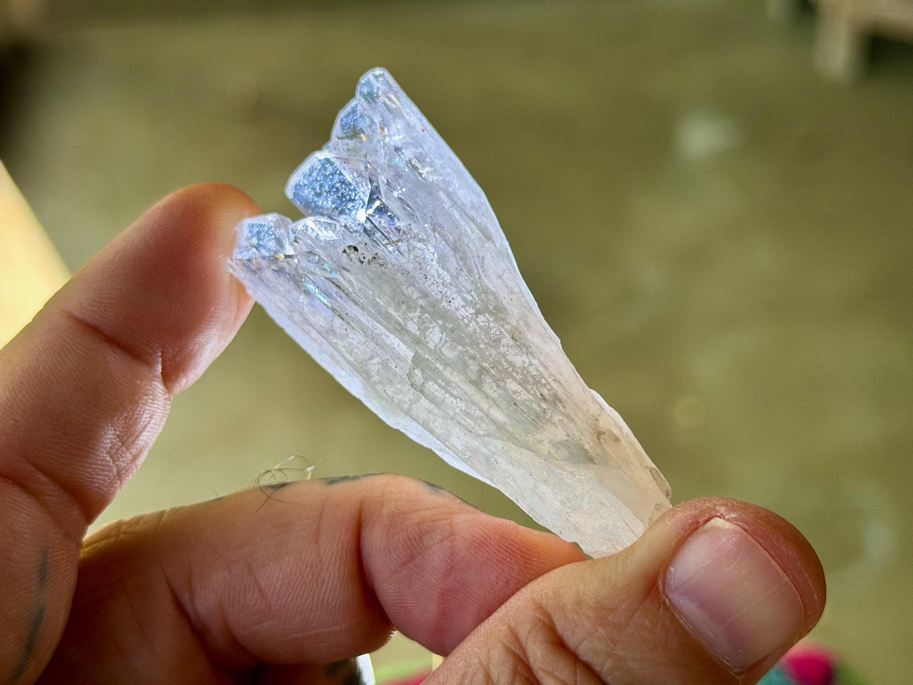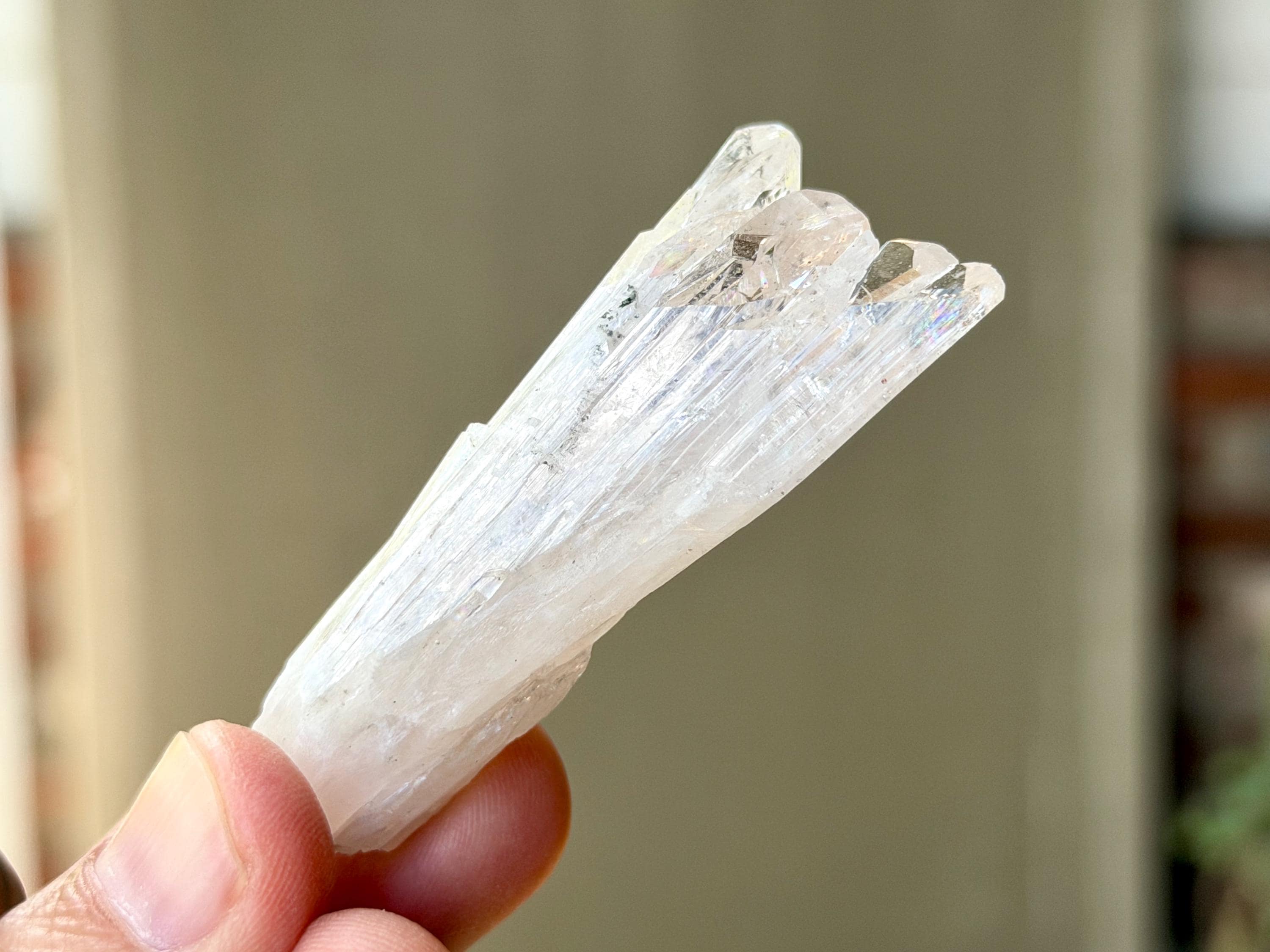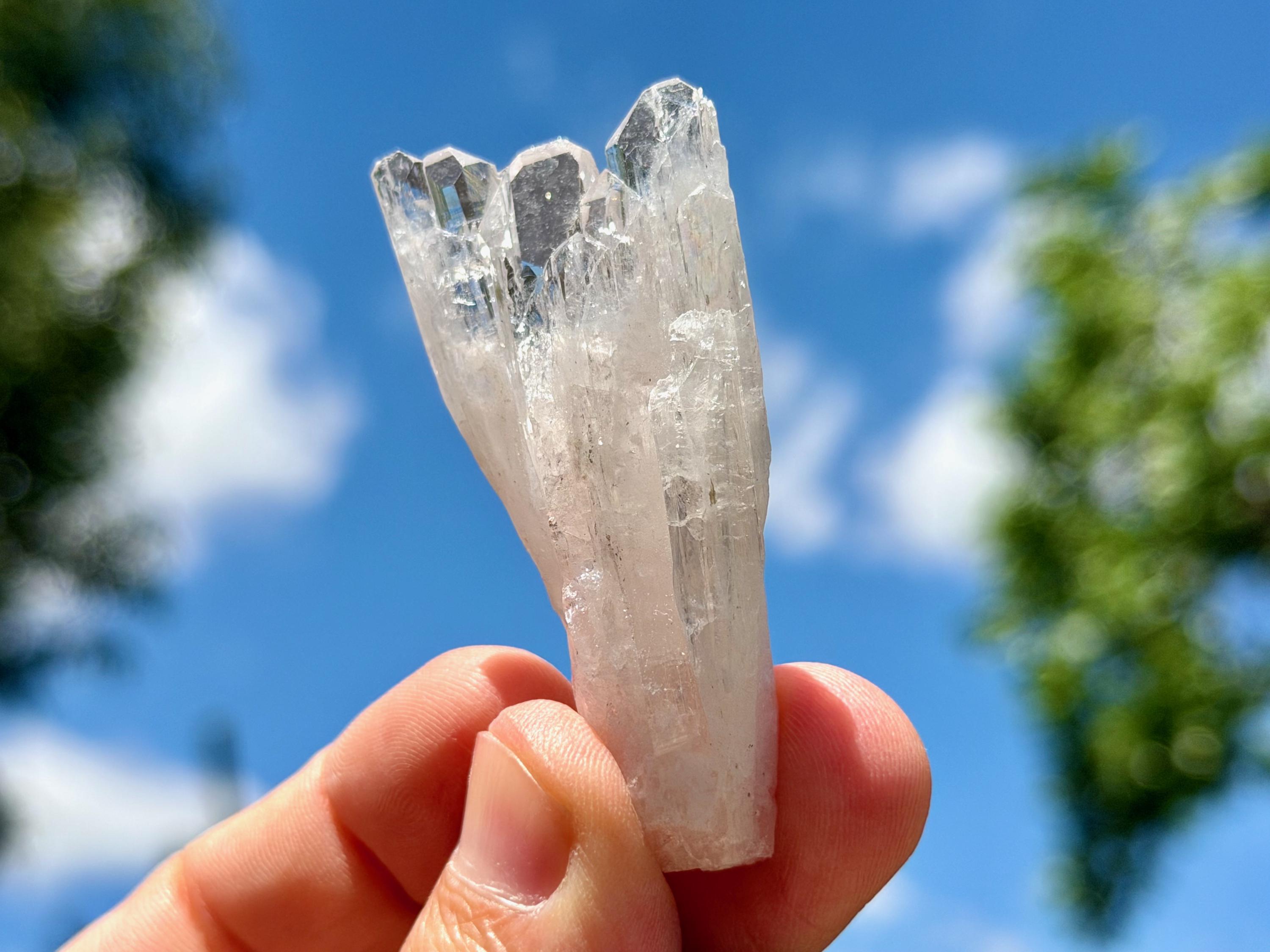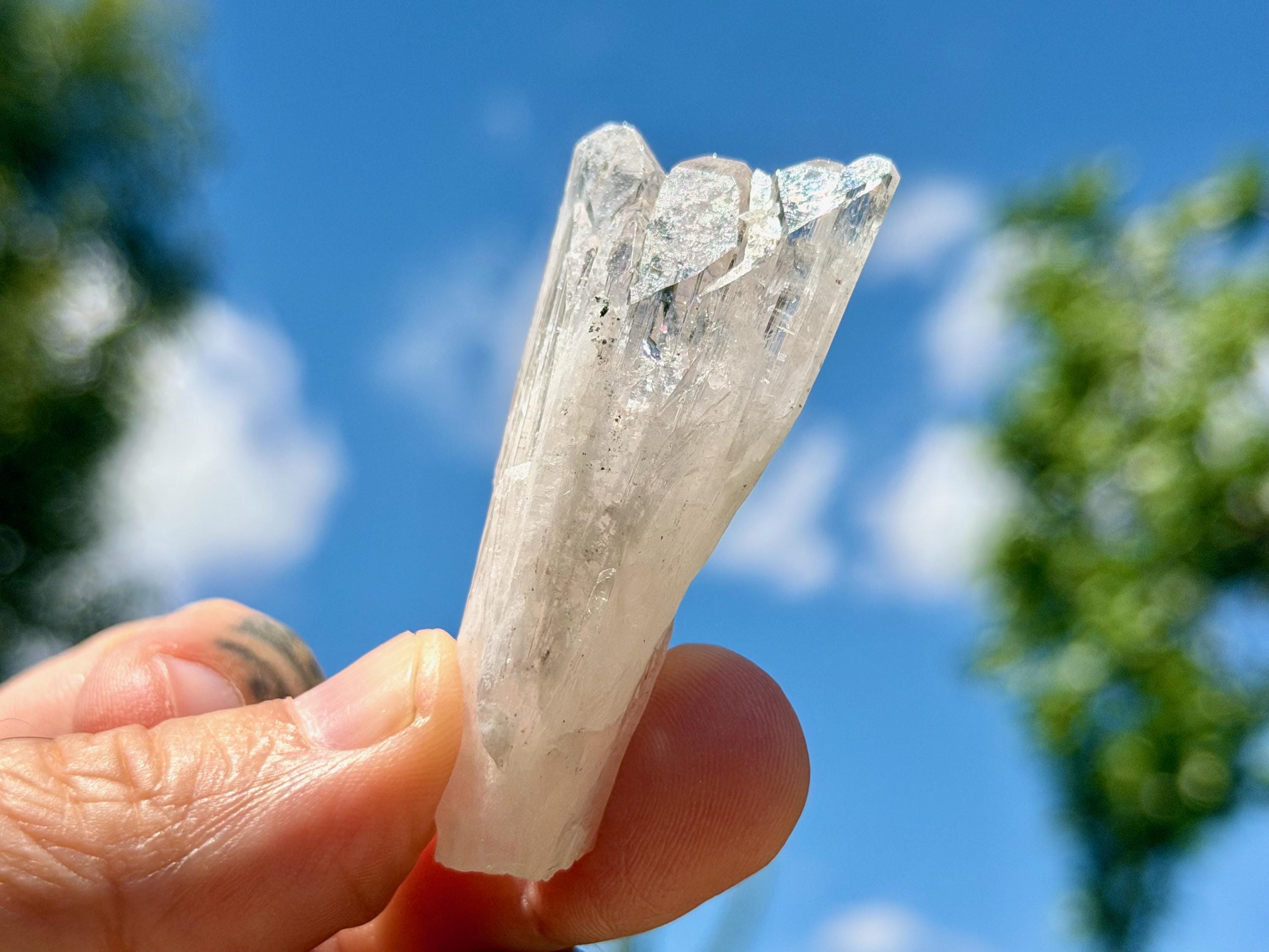 The elongated formation "blooms" at the top with a broad main facet area, that includes several individual facets. The complexion is glassy. While its hard to see in the photos, if you hold this crystal against a white background, you will notice the *slightest* pinkish tinge. And there's even a lovely sparkling rainbow on the left side near the top.