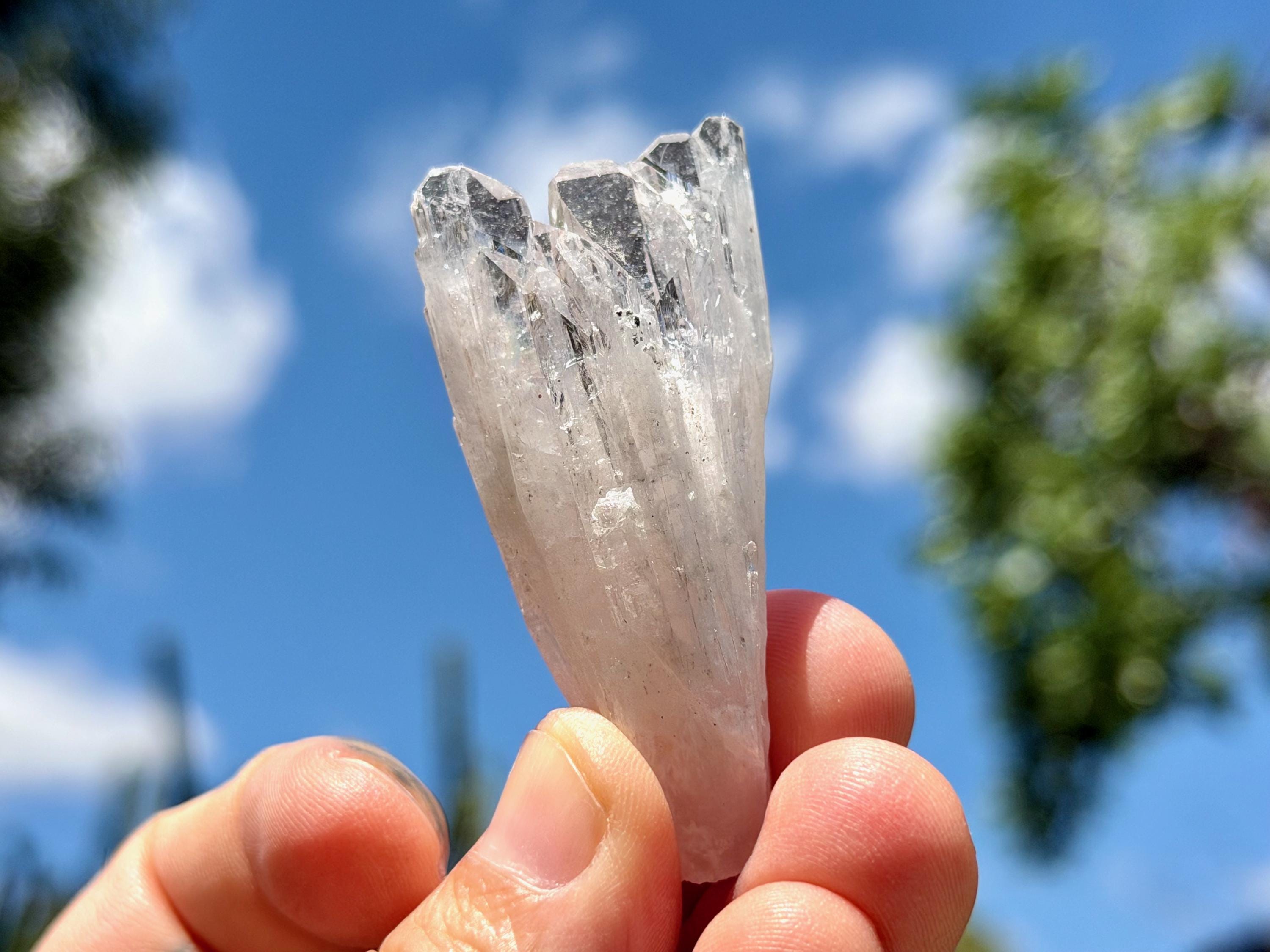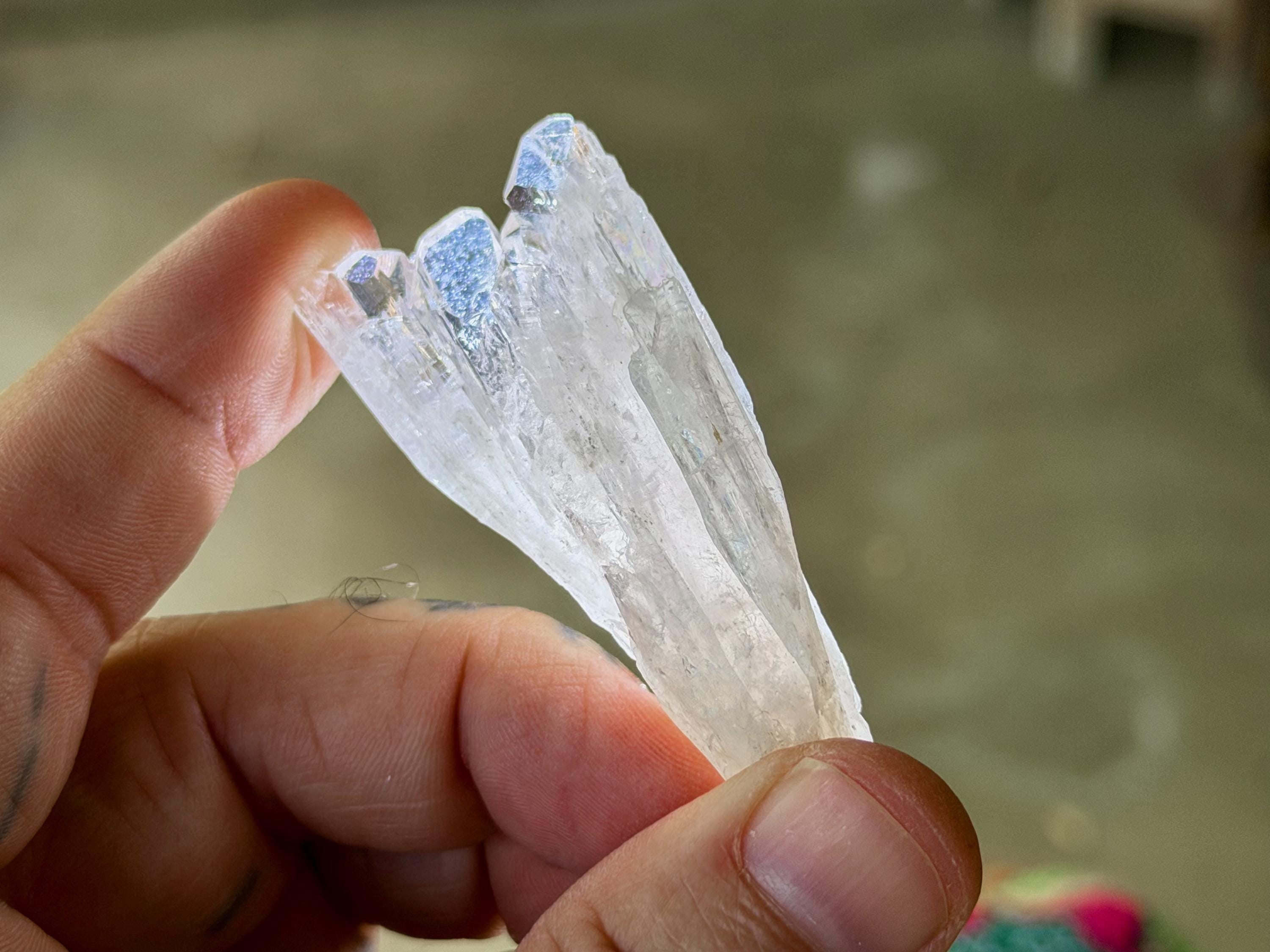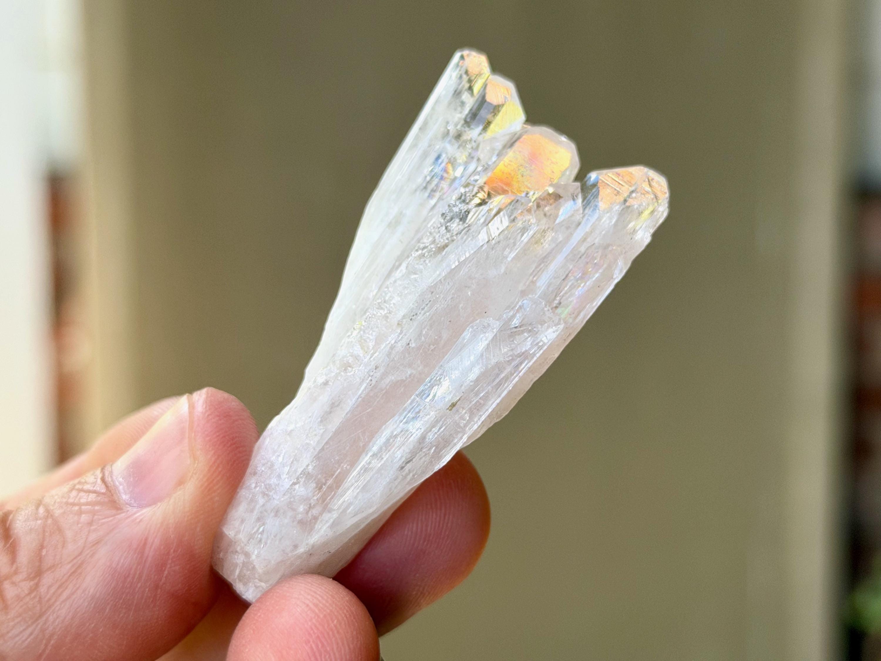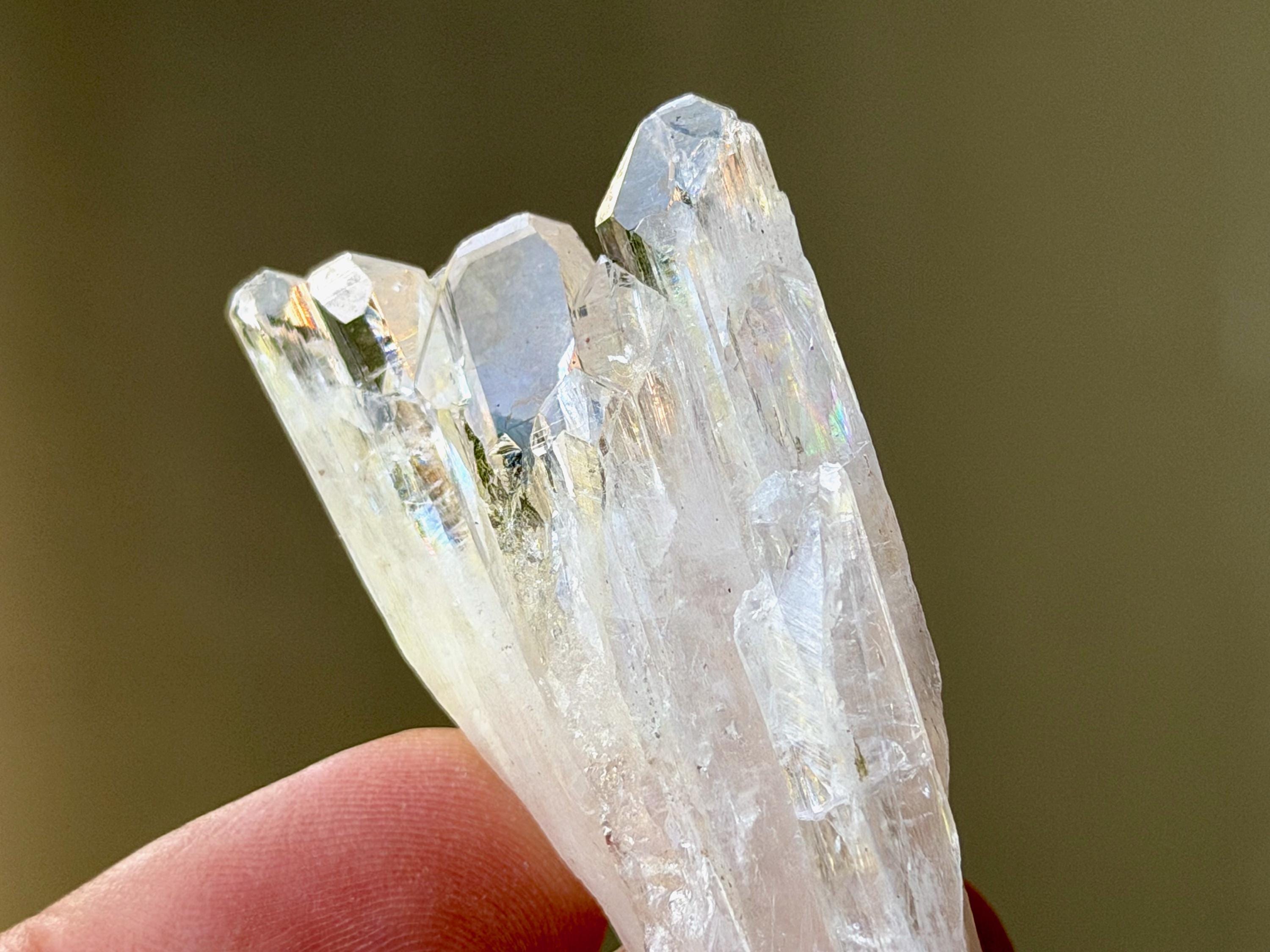 The elongated formation "blooms" at the top with a broad main facet area, that includes several individual facets. The complexion is glassy. While its hard to see in the photos, if you hold this crystal against a white background, you will notice the *slightest* pinkish tinge. And there's even a lovely sparkling rainbow on the left side near the top.