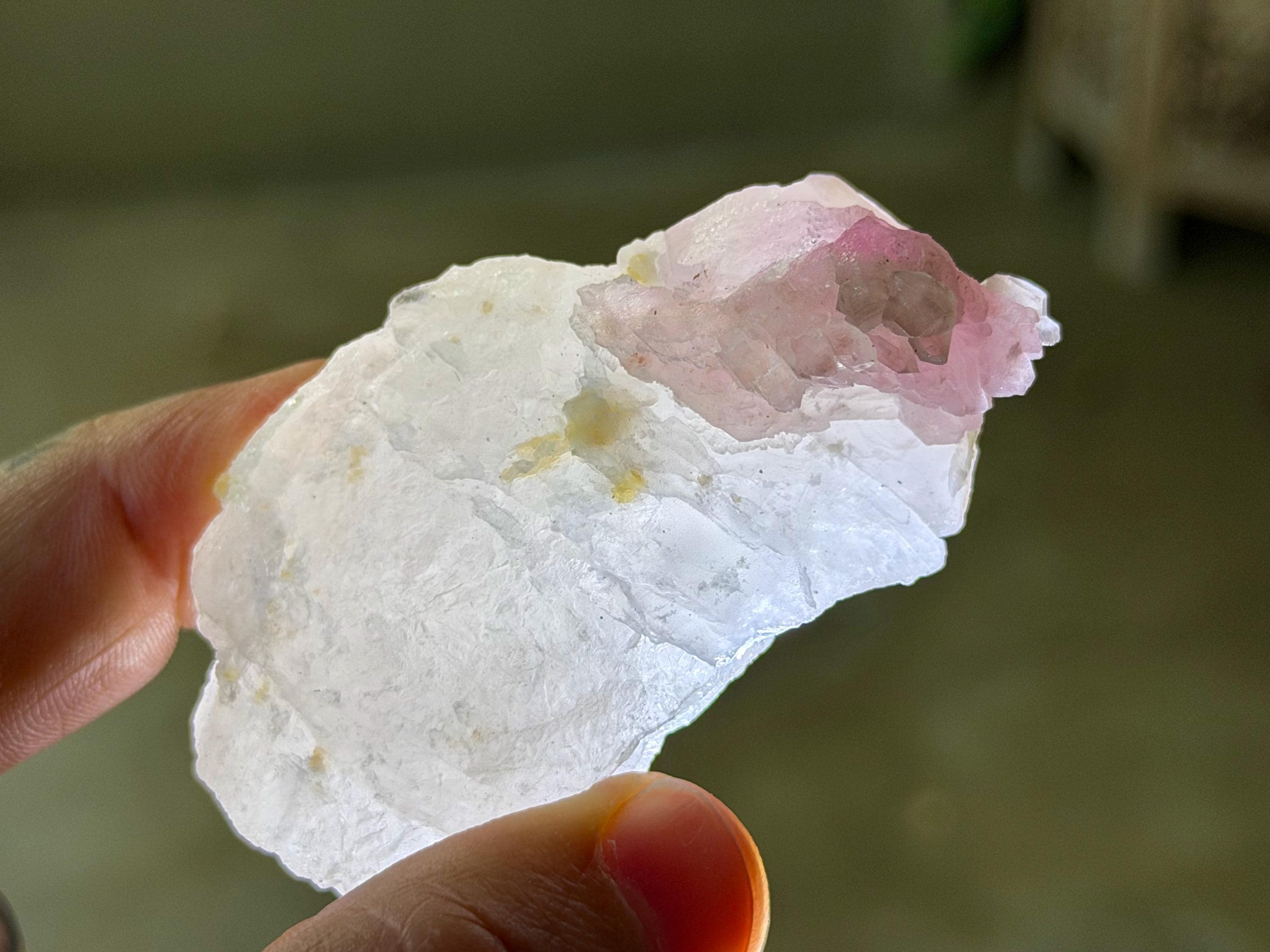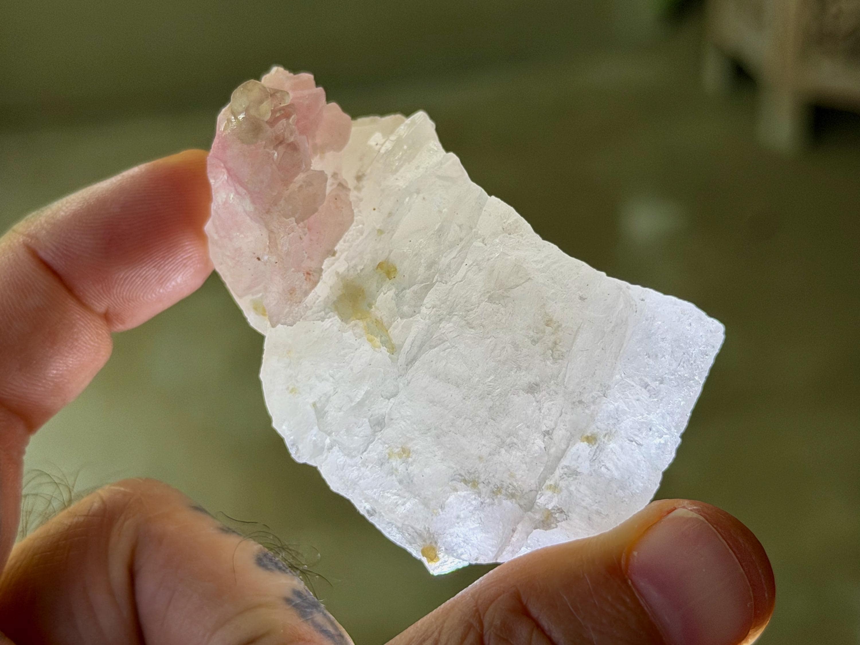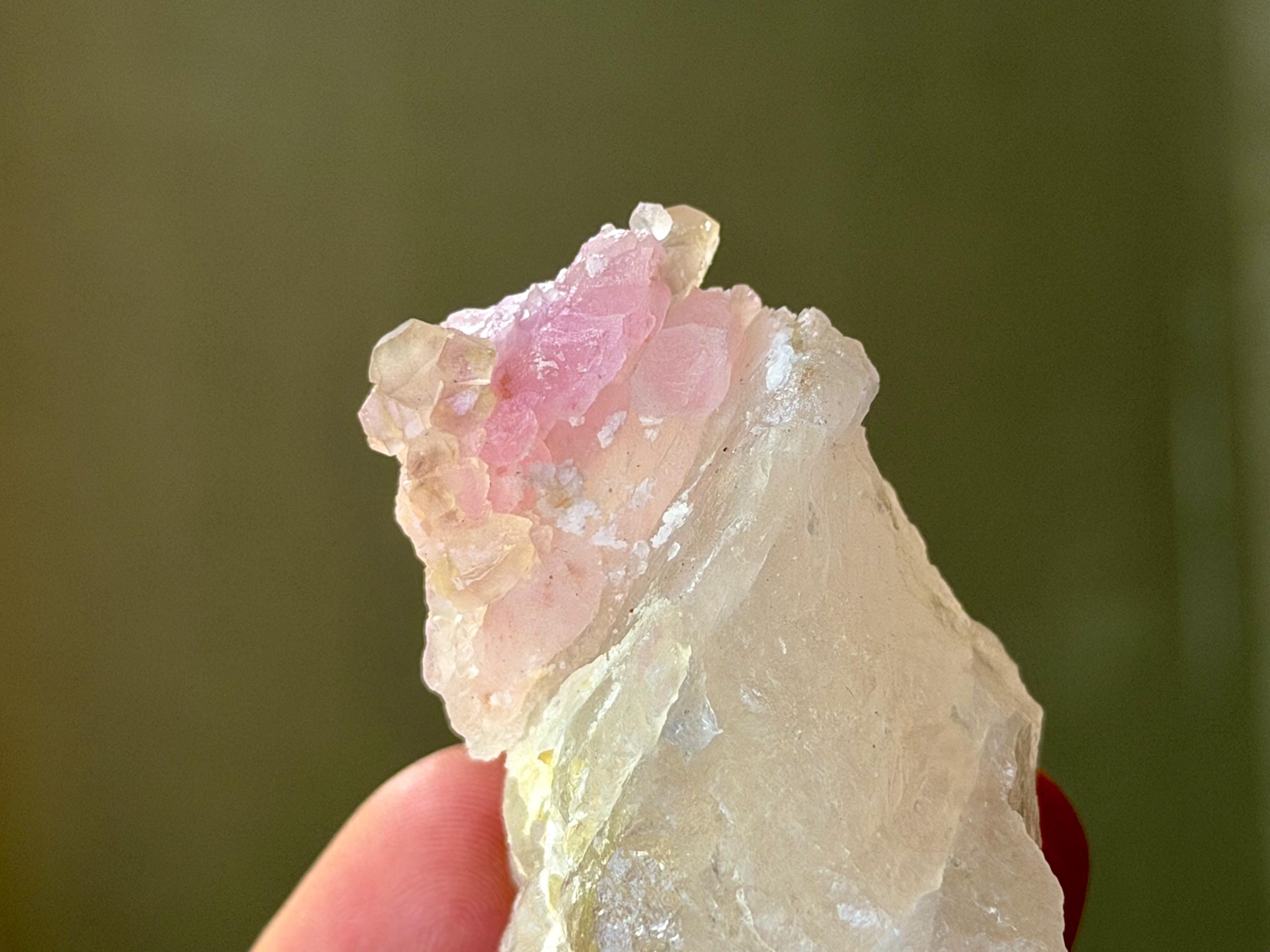 The body of this crystal is primary clear/white Quartz, but the termination features a lovely crystallization of Rose Quartz. When backlit, it lights up beautifully (Photos 5-7).