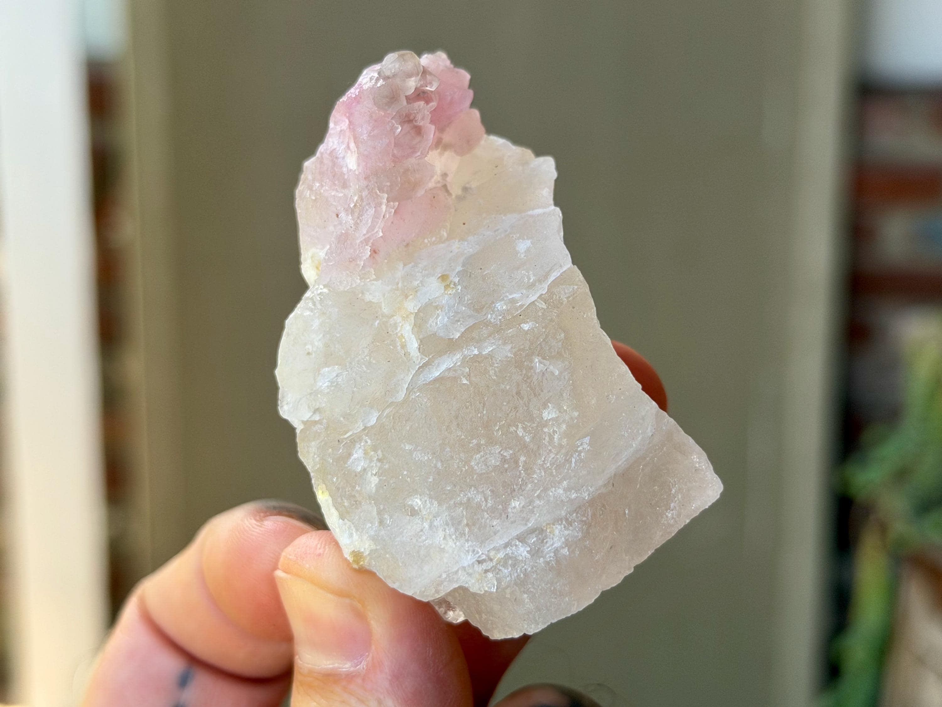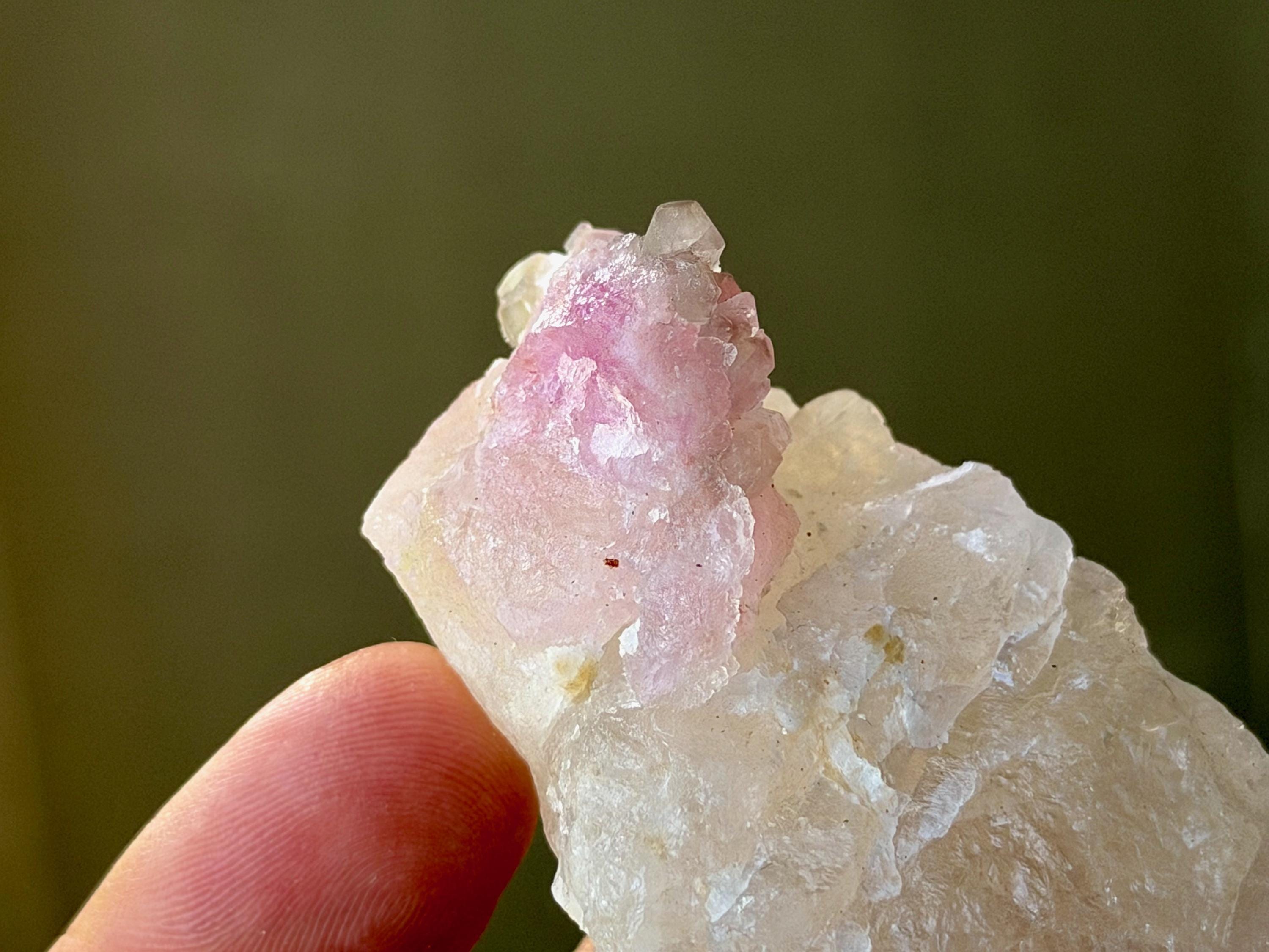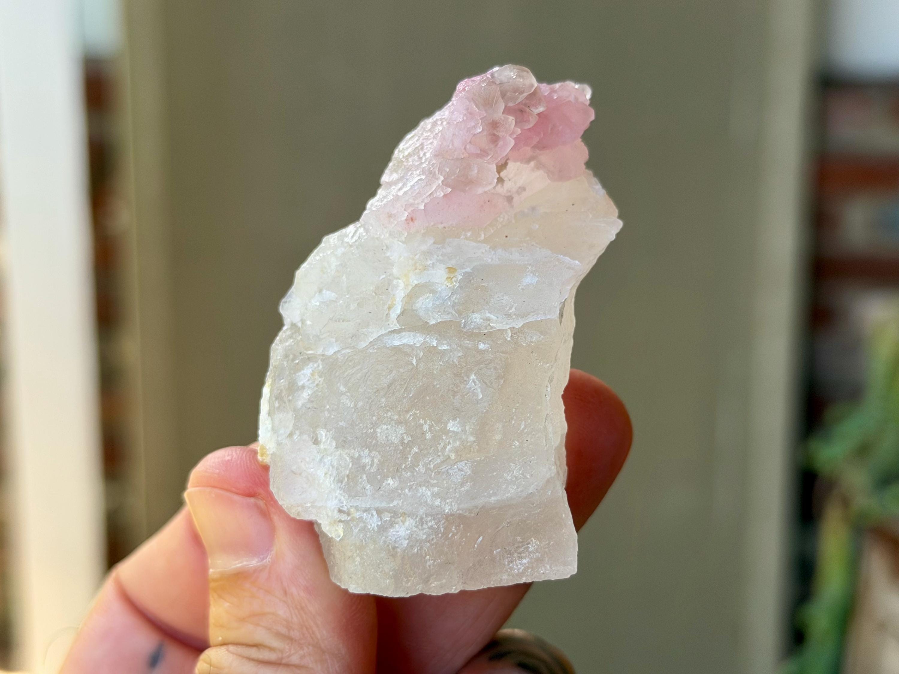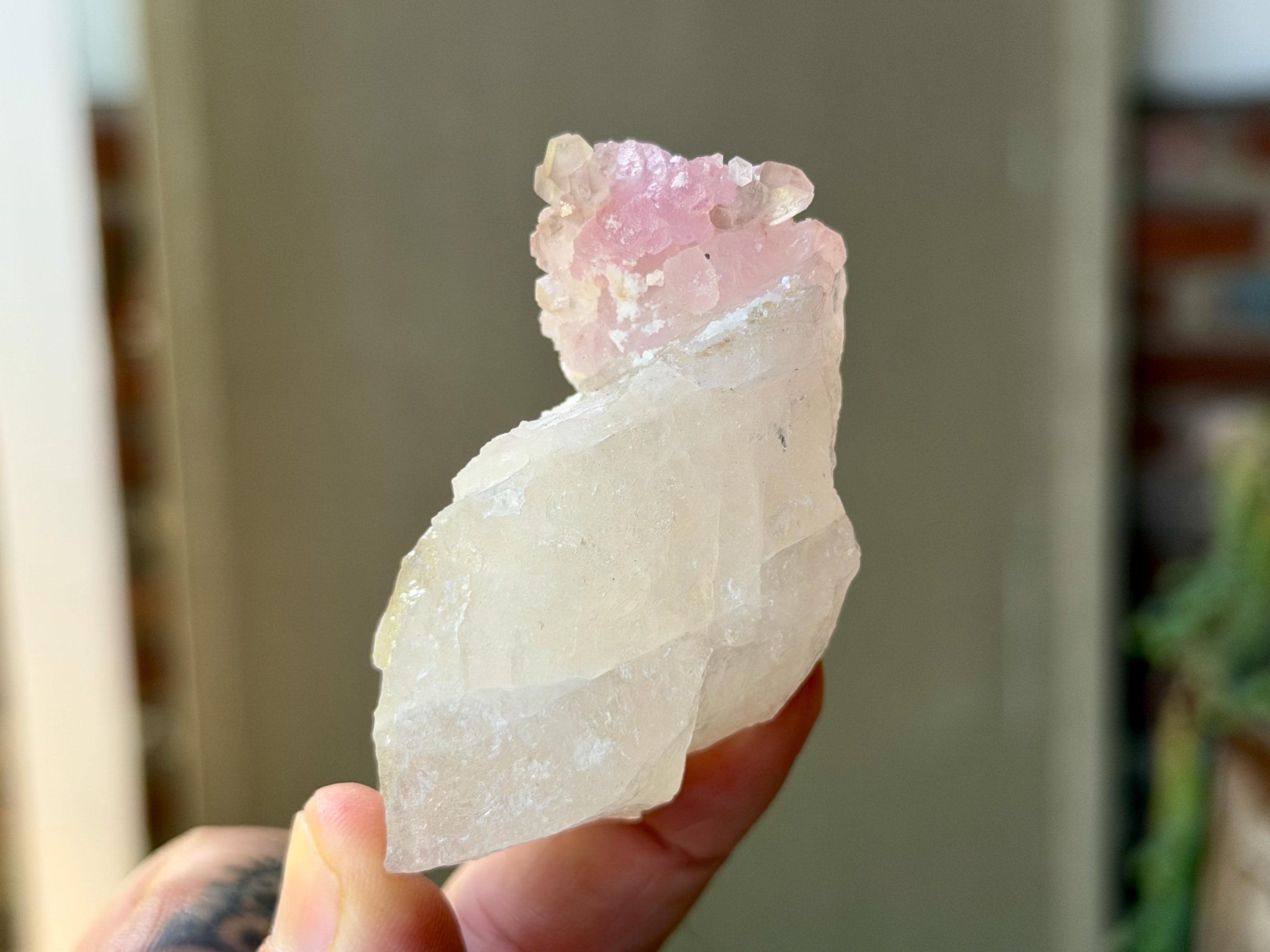 While Rose Quartz, as most of us know it, is quite common in slab form, and can be found at any New Age store (in tumbled stones, etc), crystallized Rose Quartz (perhaps more accurately known as Pink Quartz) is extremely rare and incredibly beautiful. It is one of the most powerful Heart Chakra crystals, and heart-healers, purifying and opening the heart at all levels, while teaching the essence of true love.