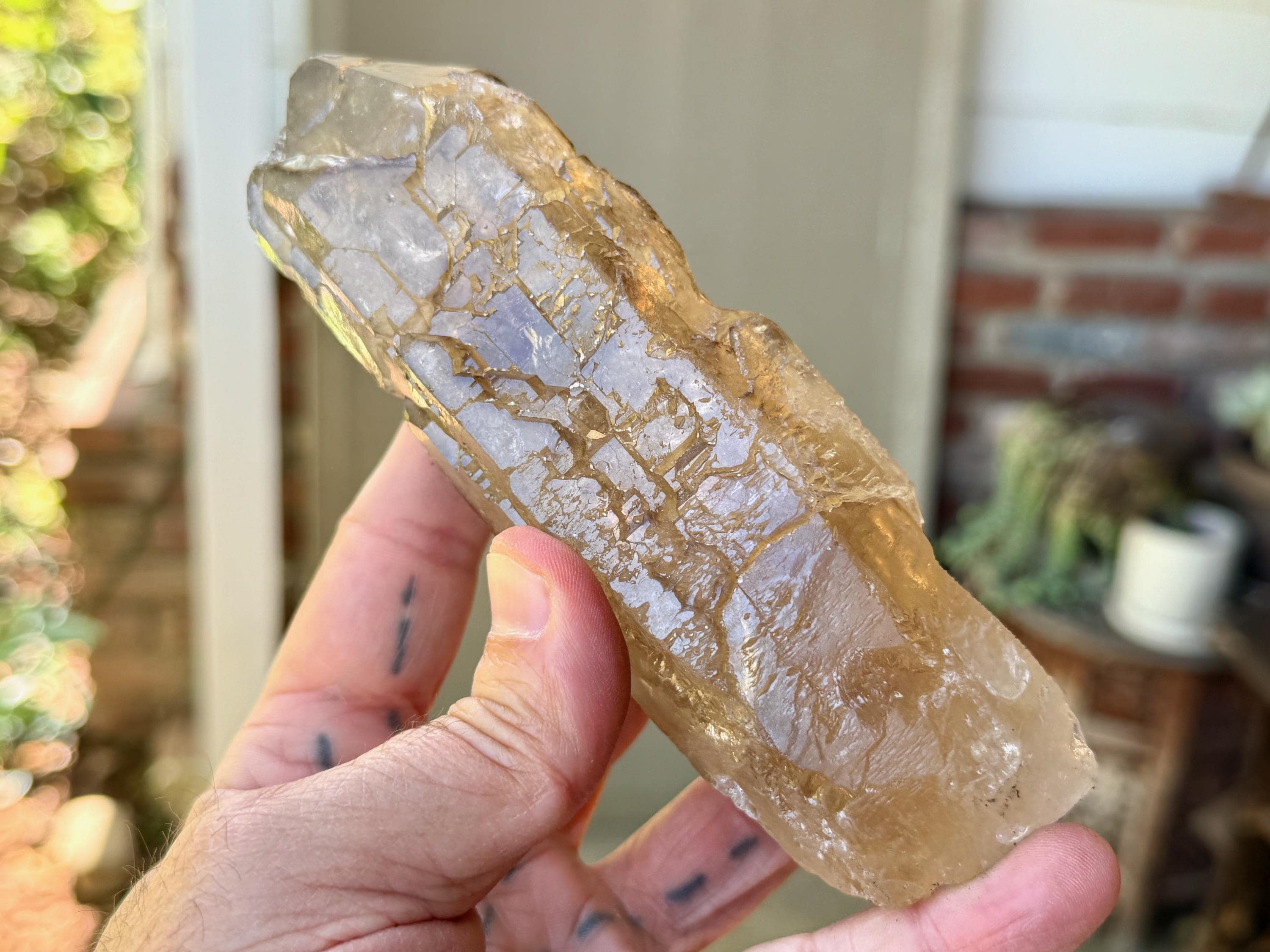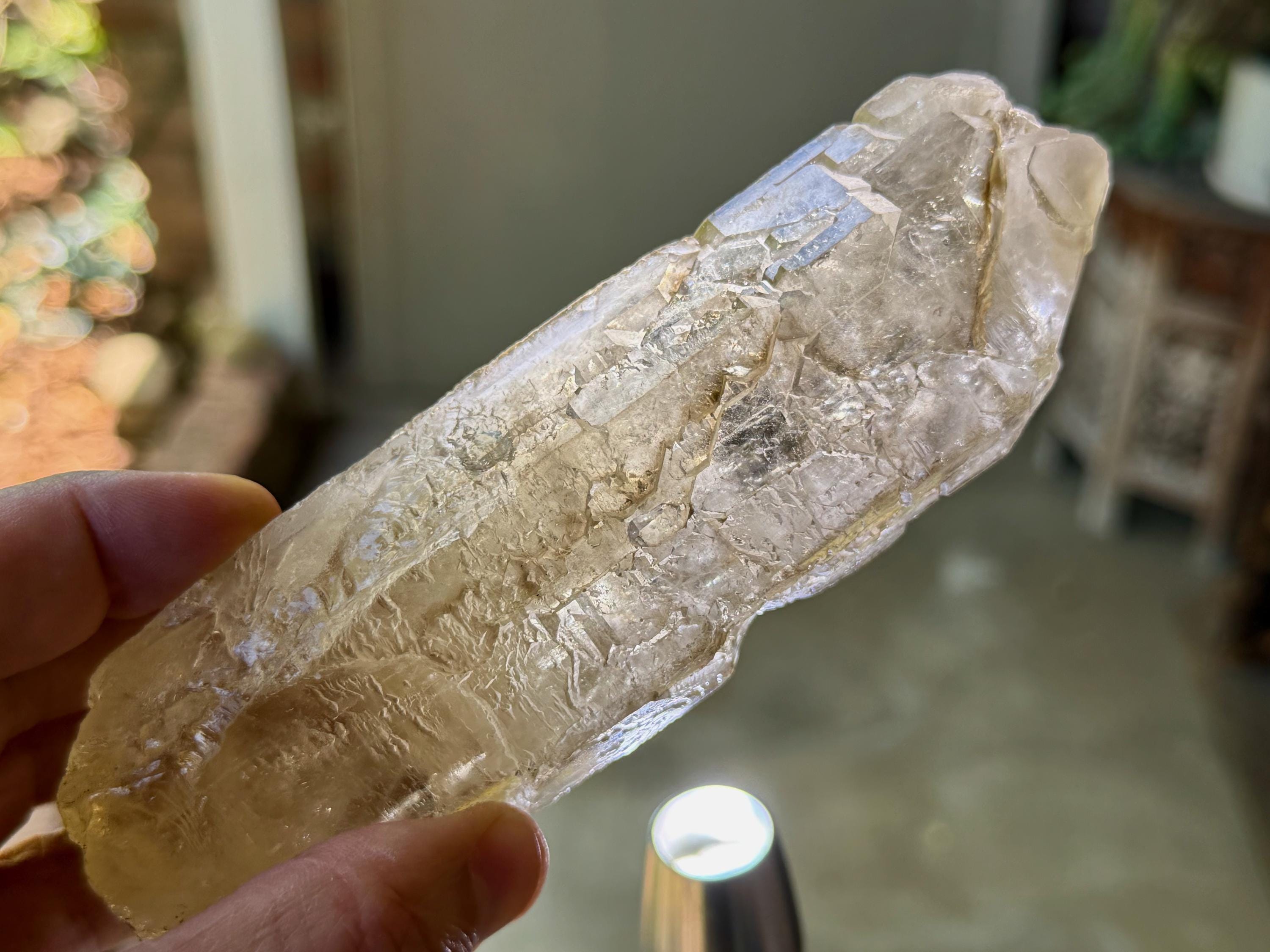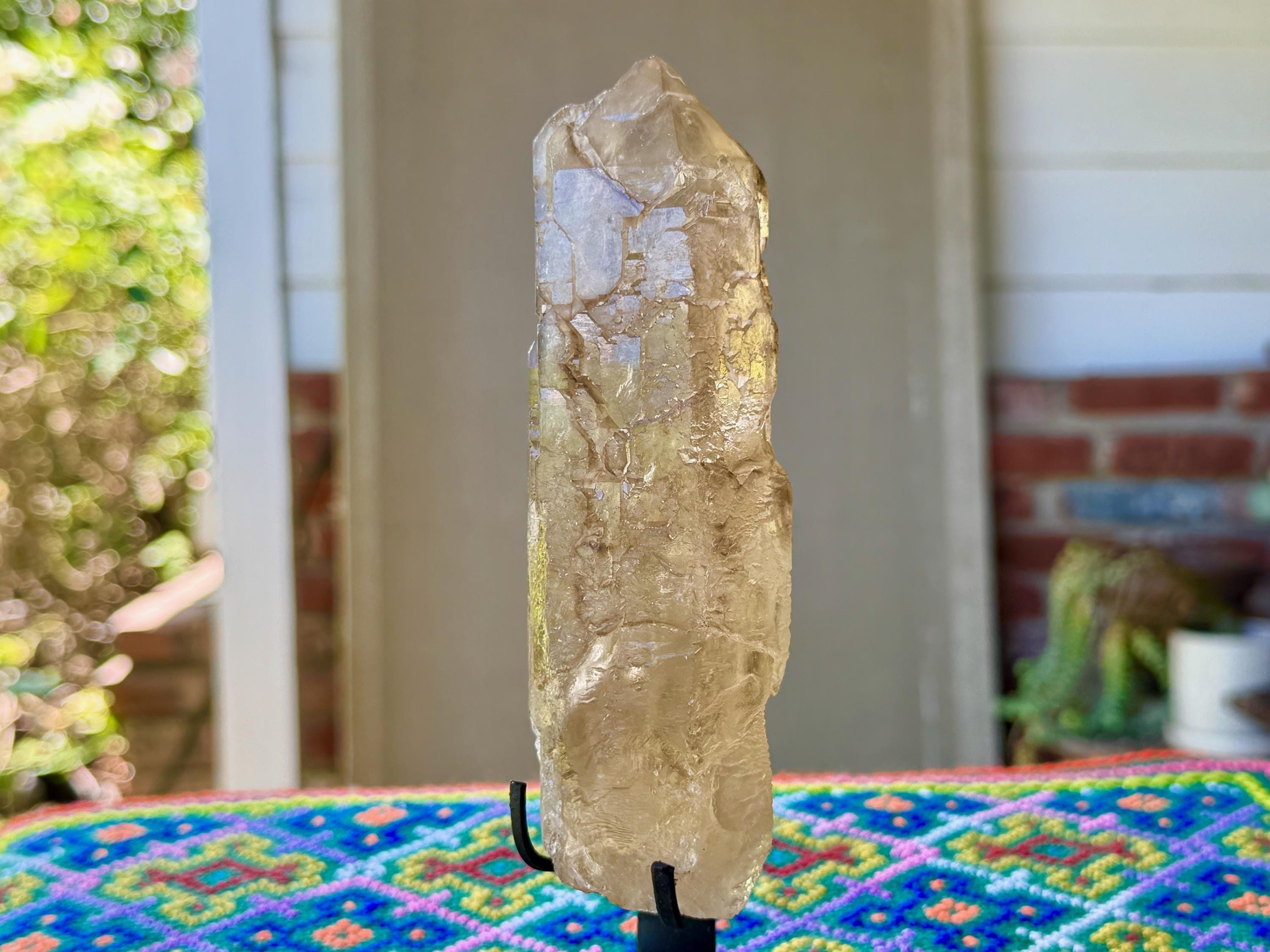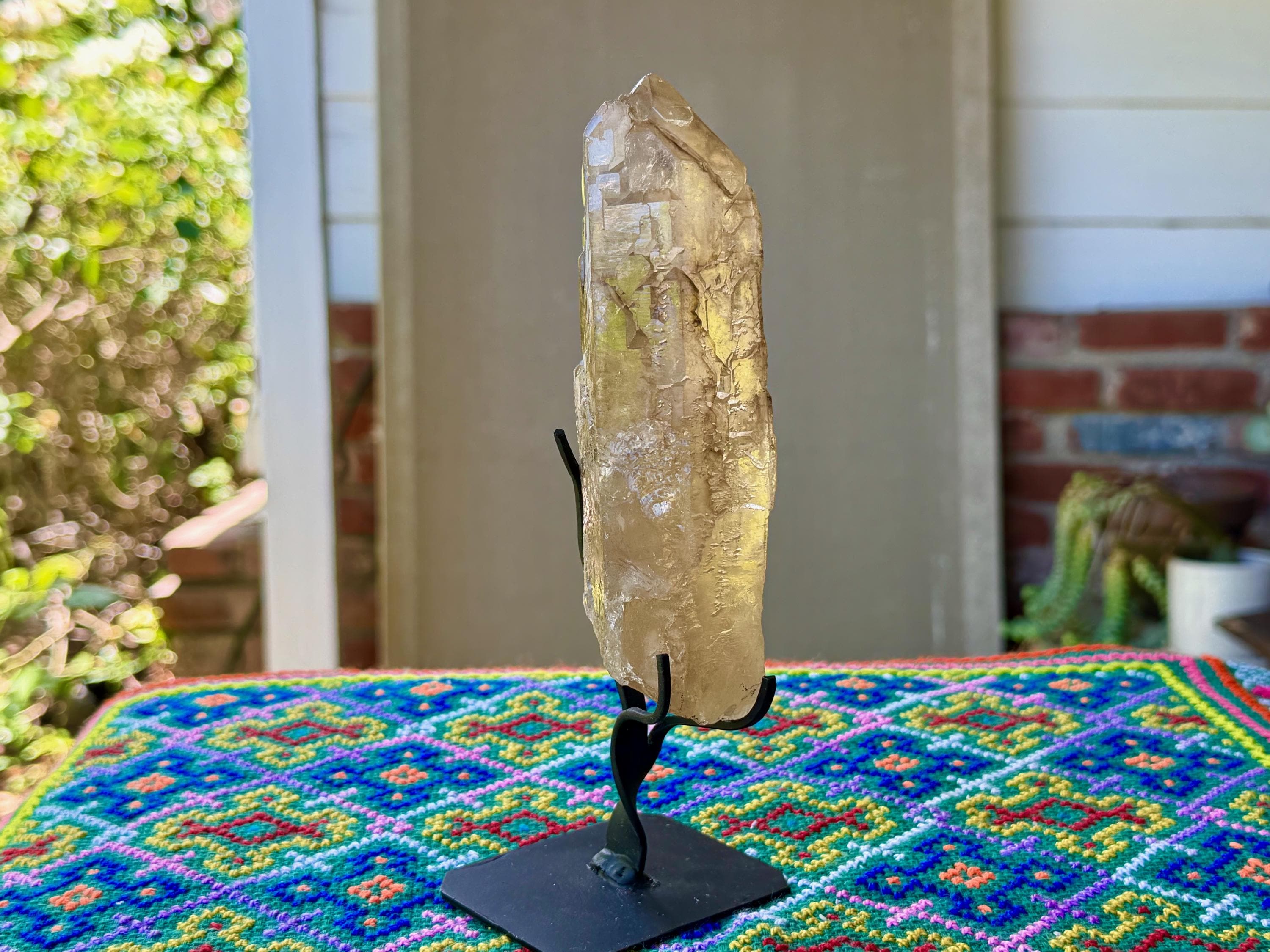 This crystal possesses an elongated formation and is covered in "jacare" textures, etchings and impressions on all sides. It features a muted golden hue with some hints of smokiness throughout. The clarity is superb, and when backlit, as in Photos 5-6, this piece lights up brilliantly.