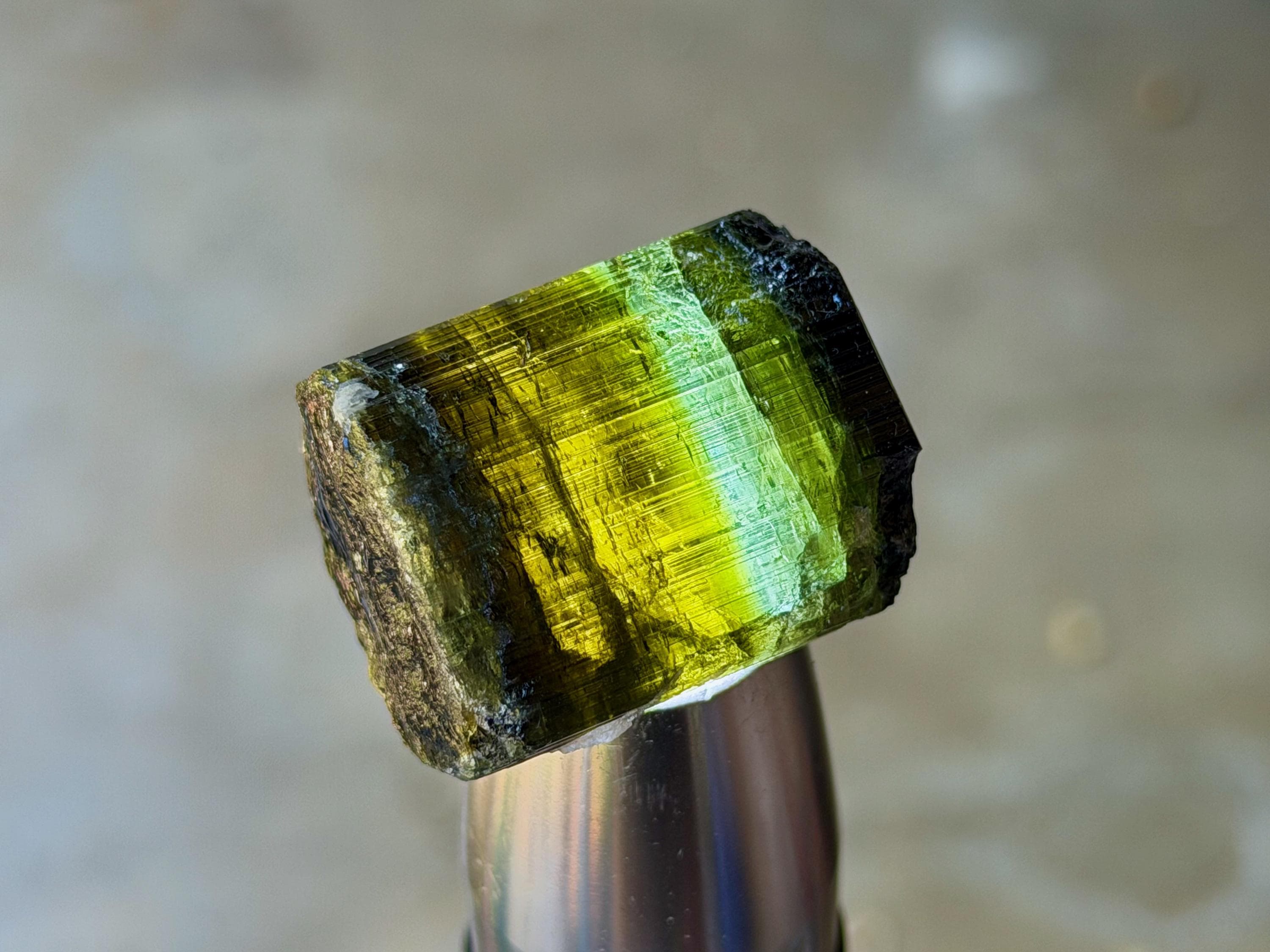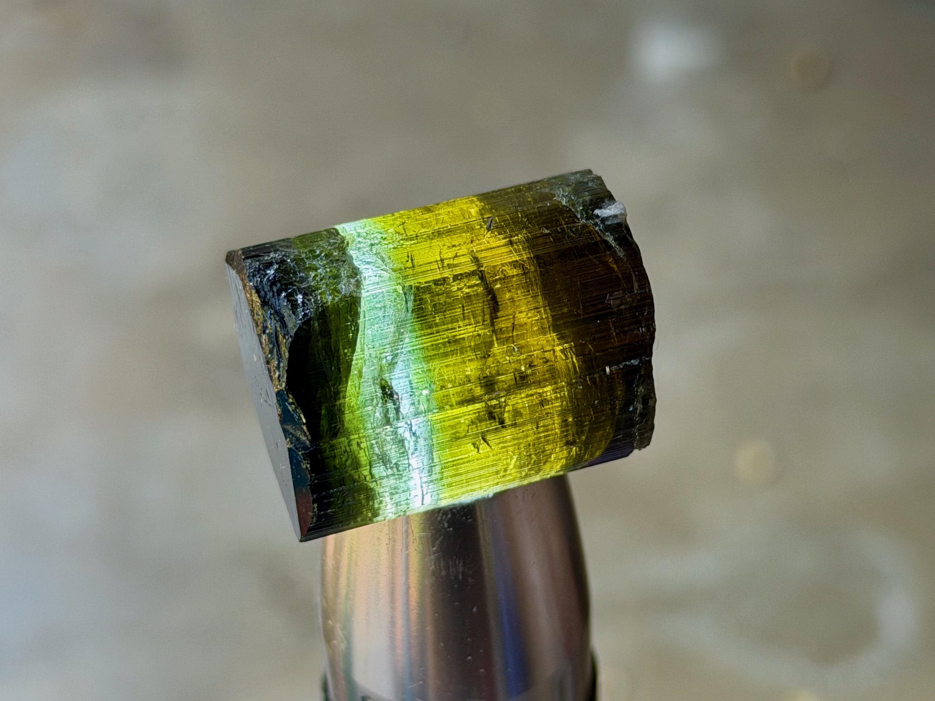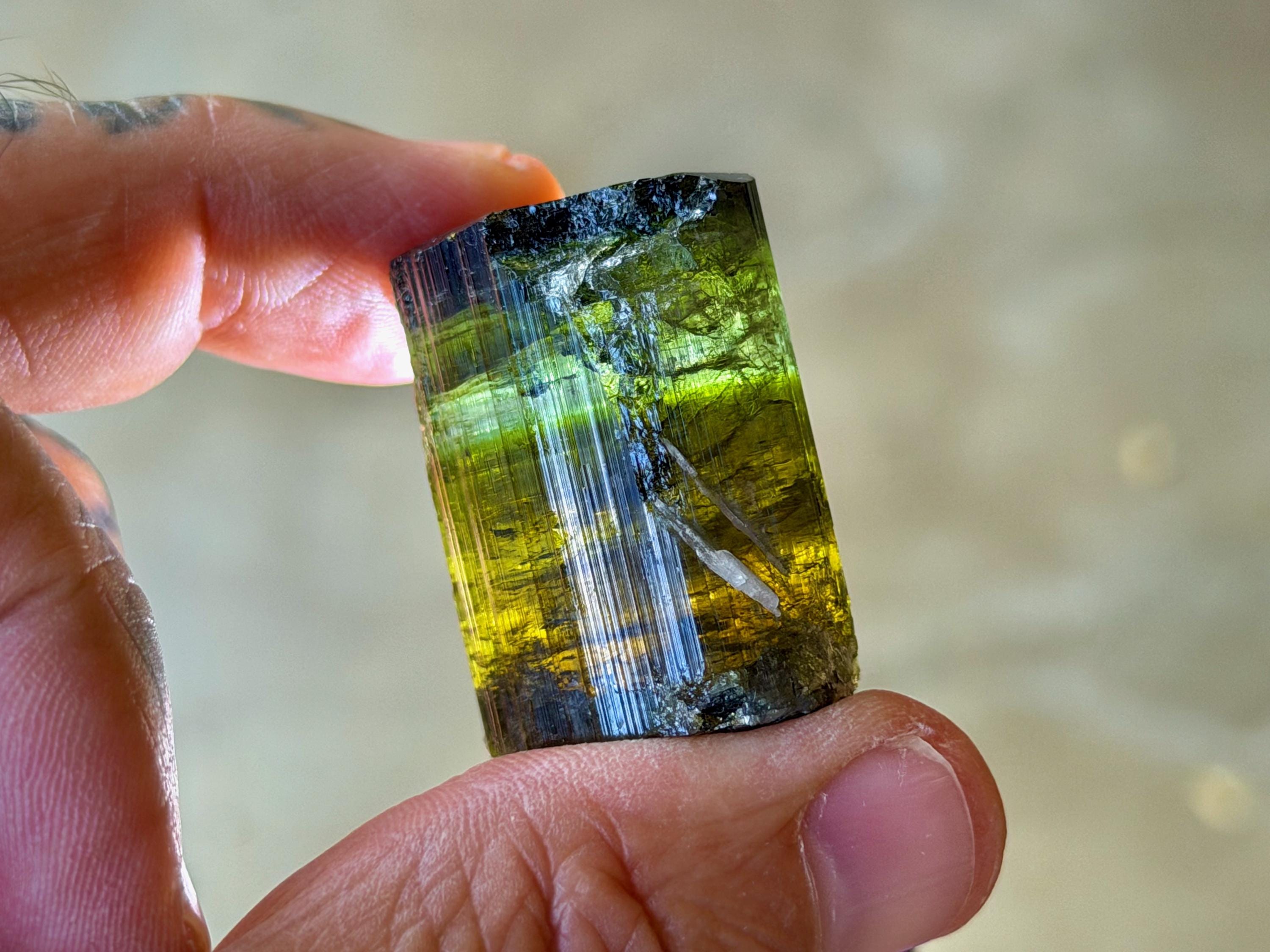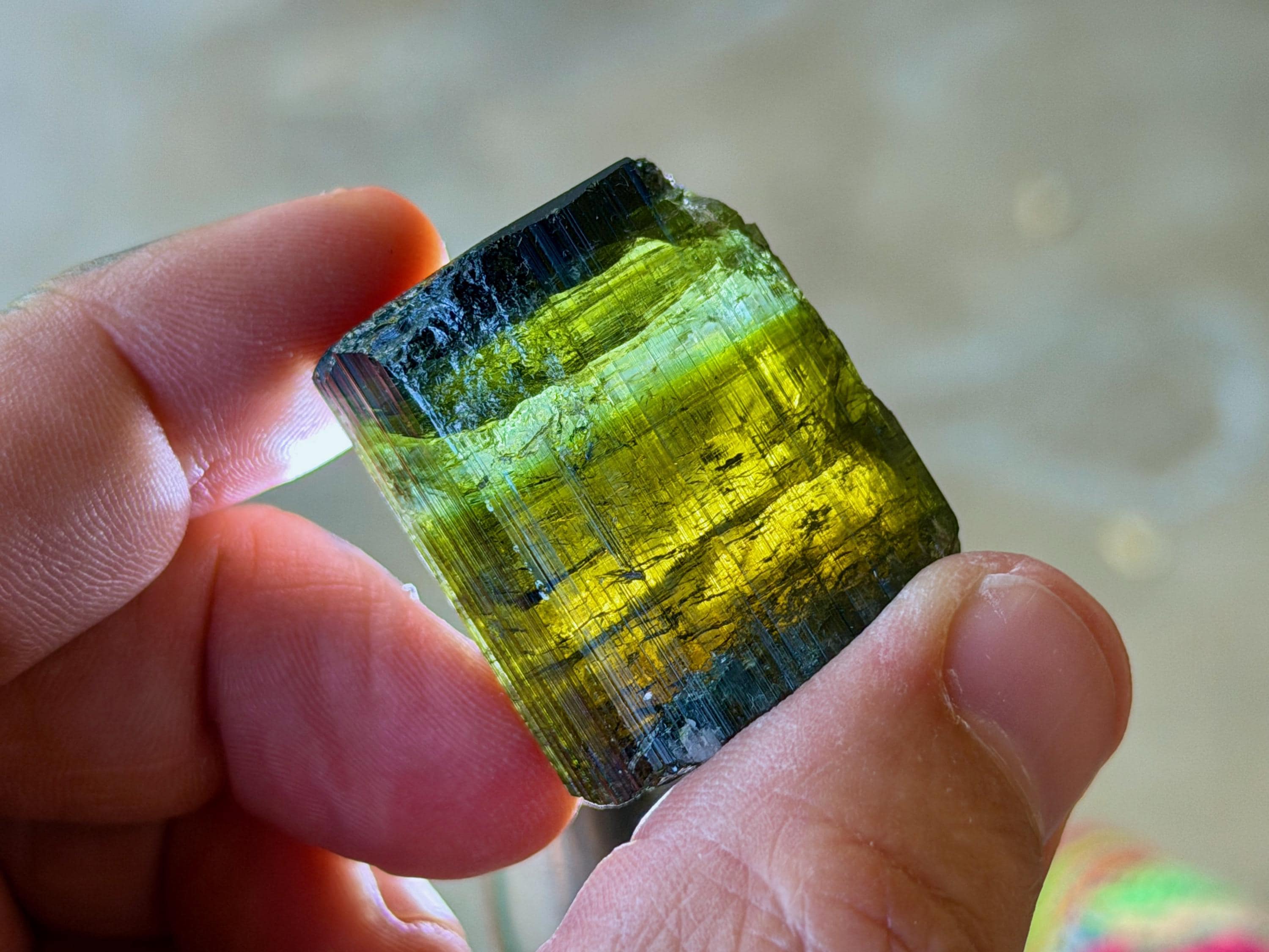 This natural Tricolor Tourmaline comes from a recent (2025) find in Coronel Murta, Minas Gerais, Brazil. This crystal is all-natural and possesses banded colors of Yellow, Blue and Green.
