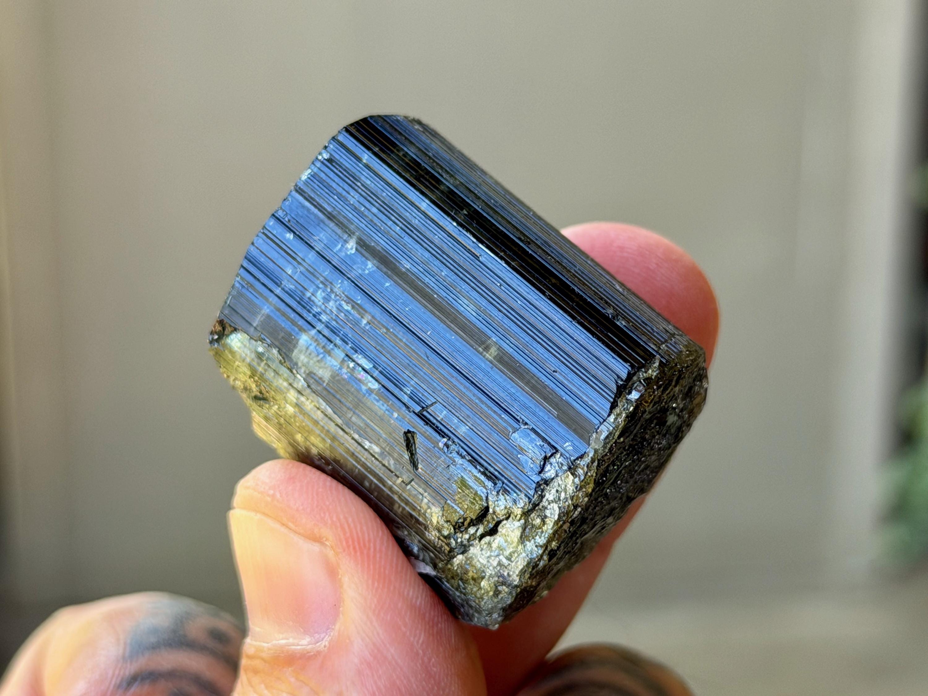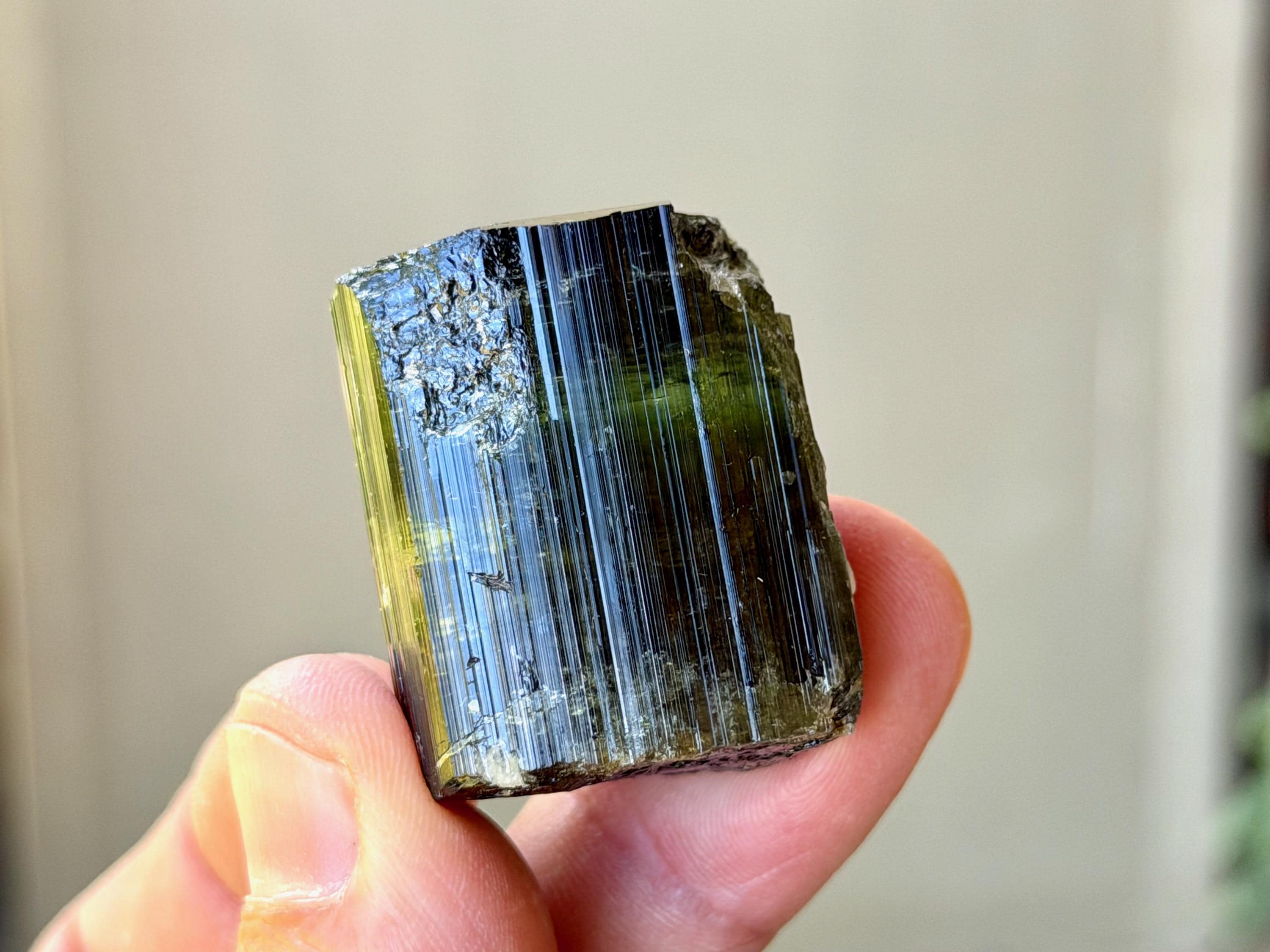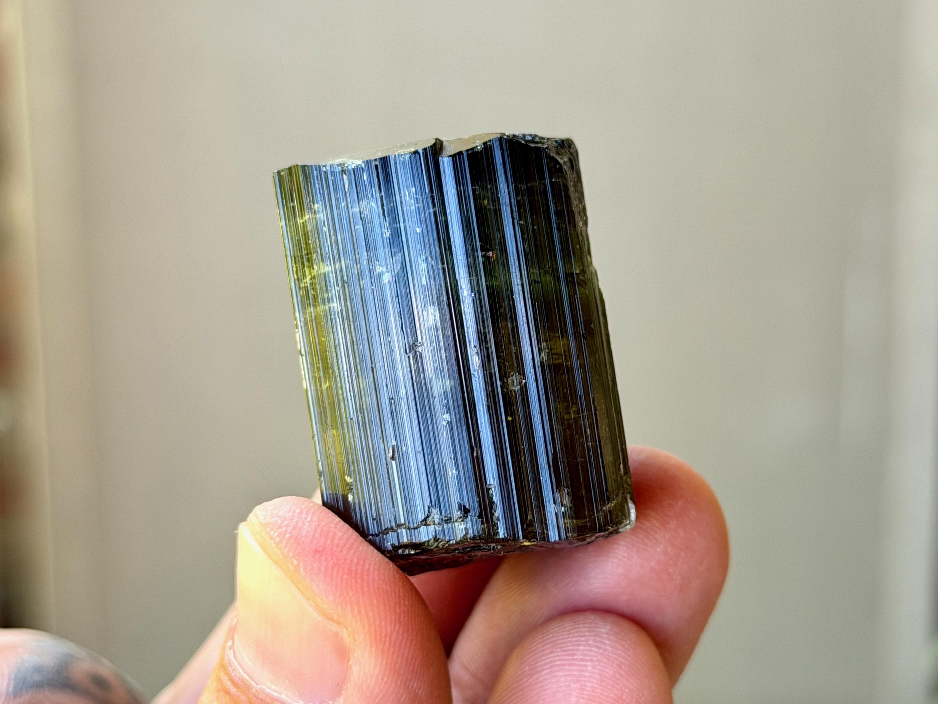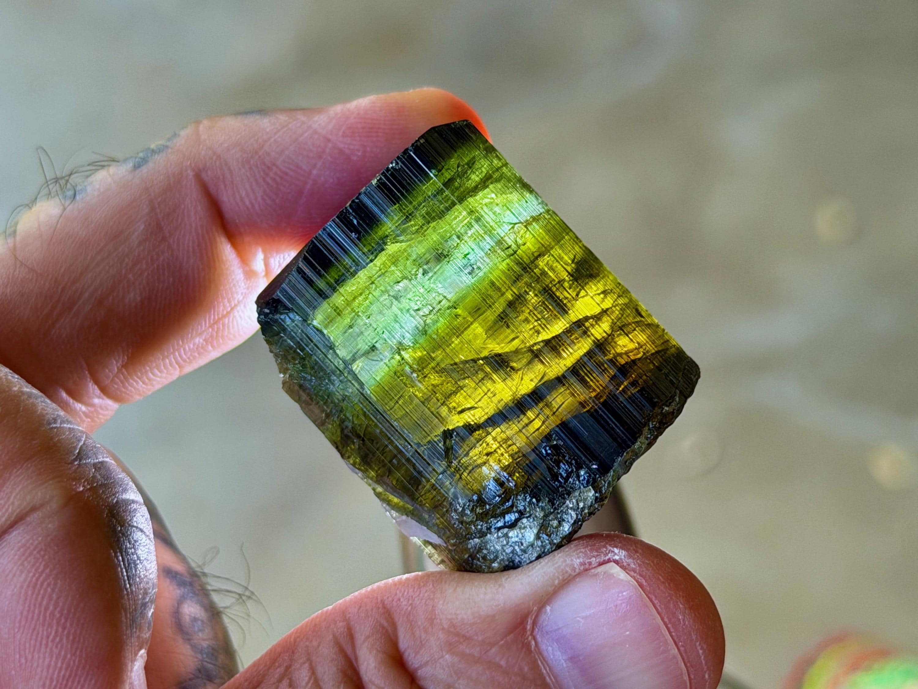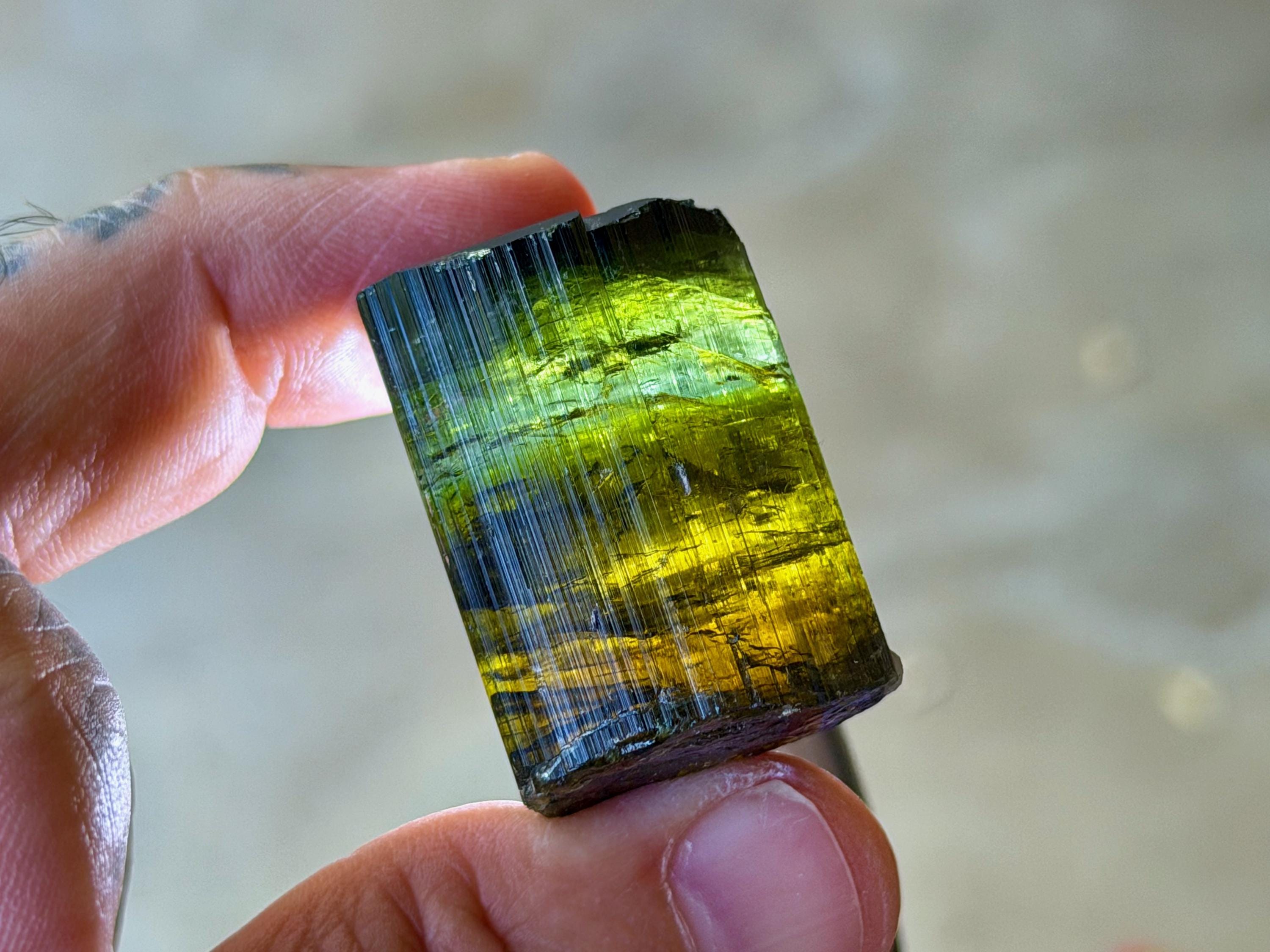 This natural Tricolor Tourmaline comes from a recent (2025) find in Coronel Murta, Minas Gerais, Brazil. This crystal is all-natural and possesses banded colors of Yellow, Blue and Green.