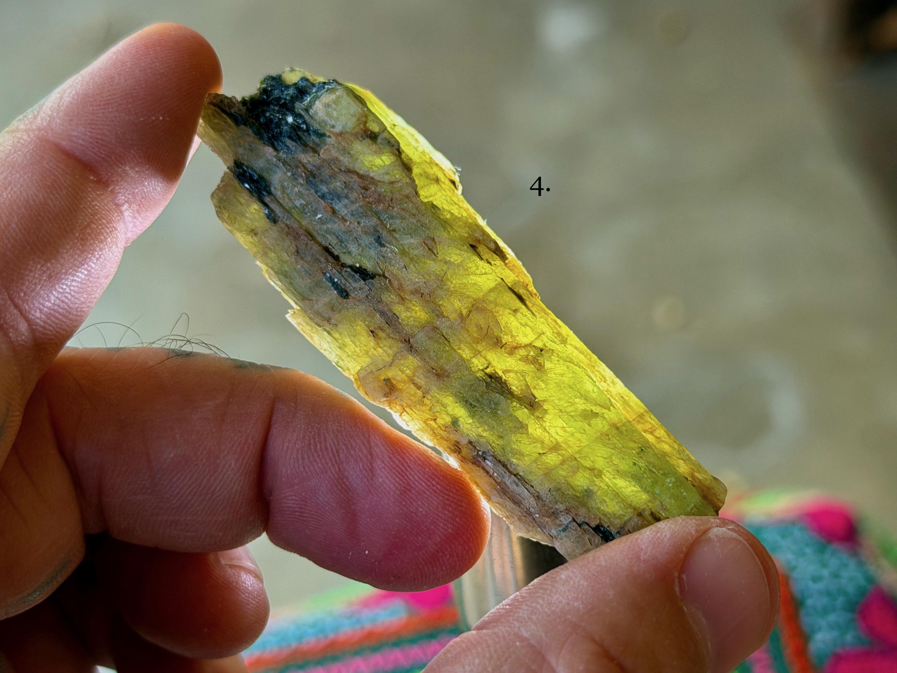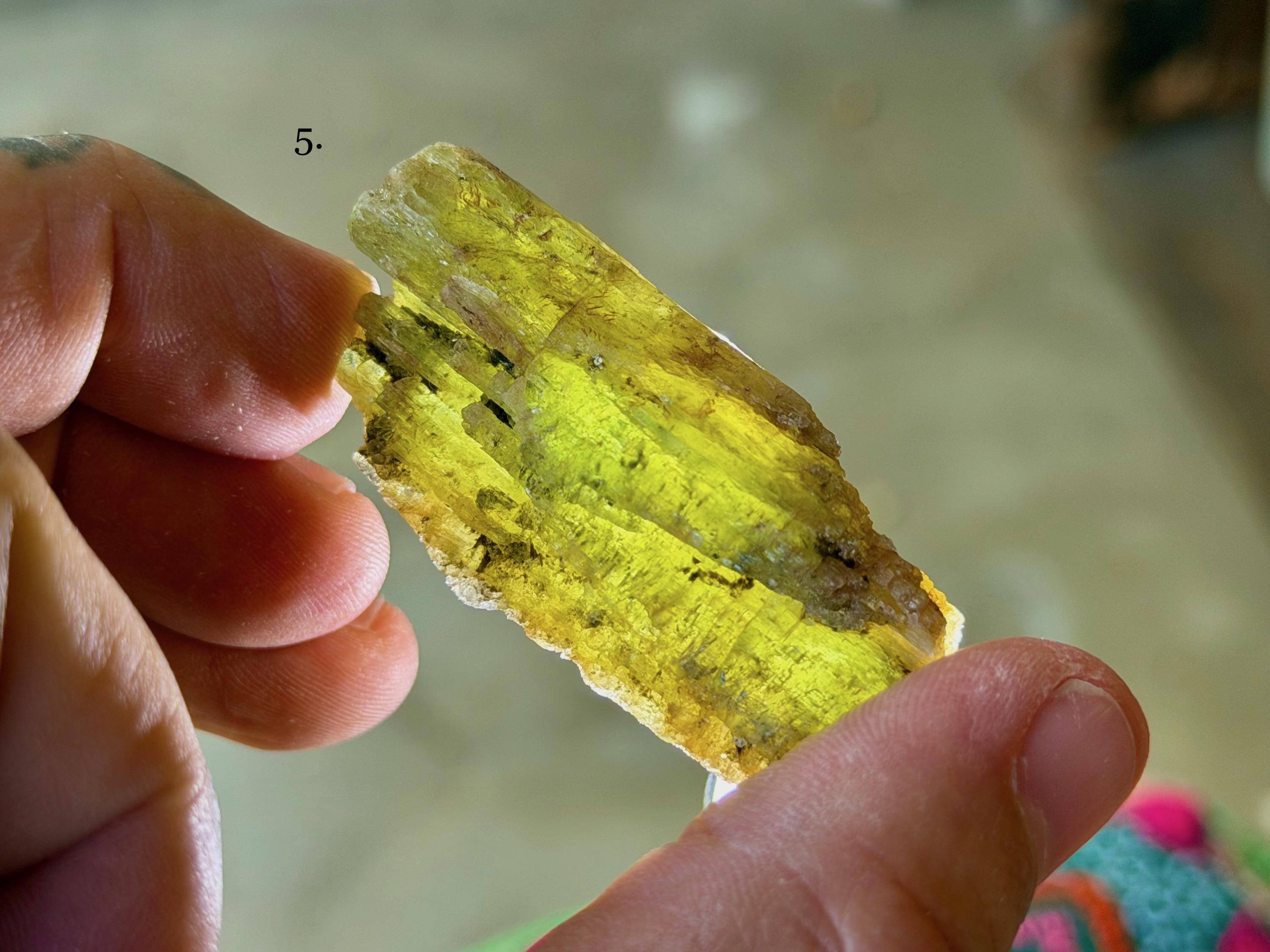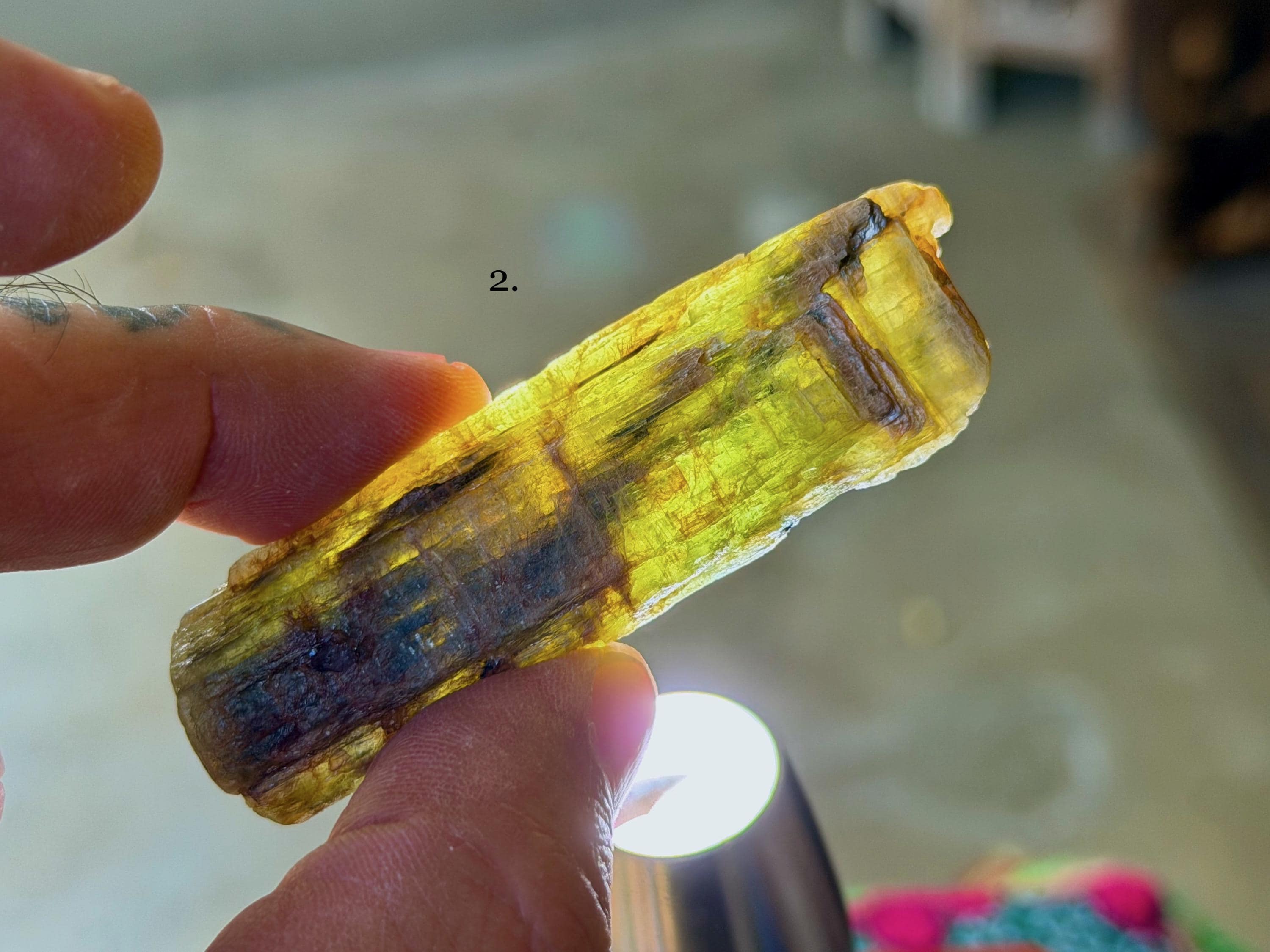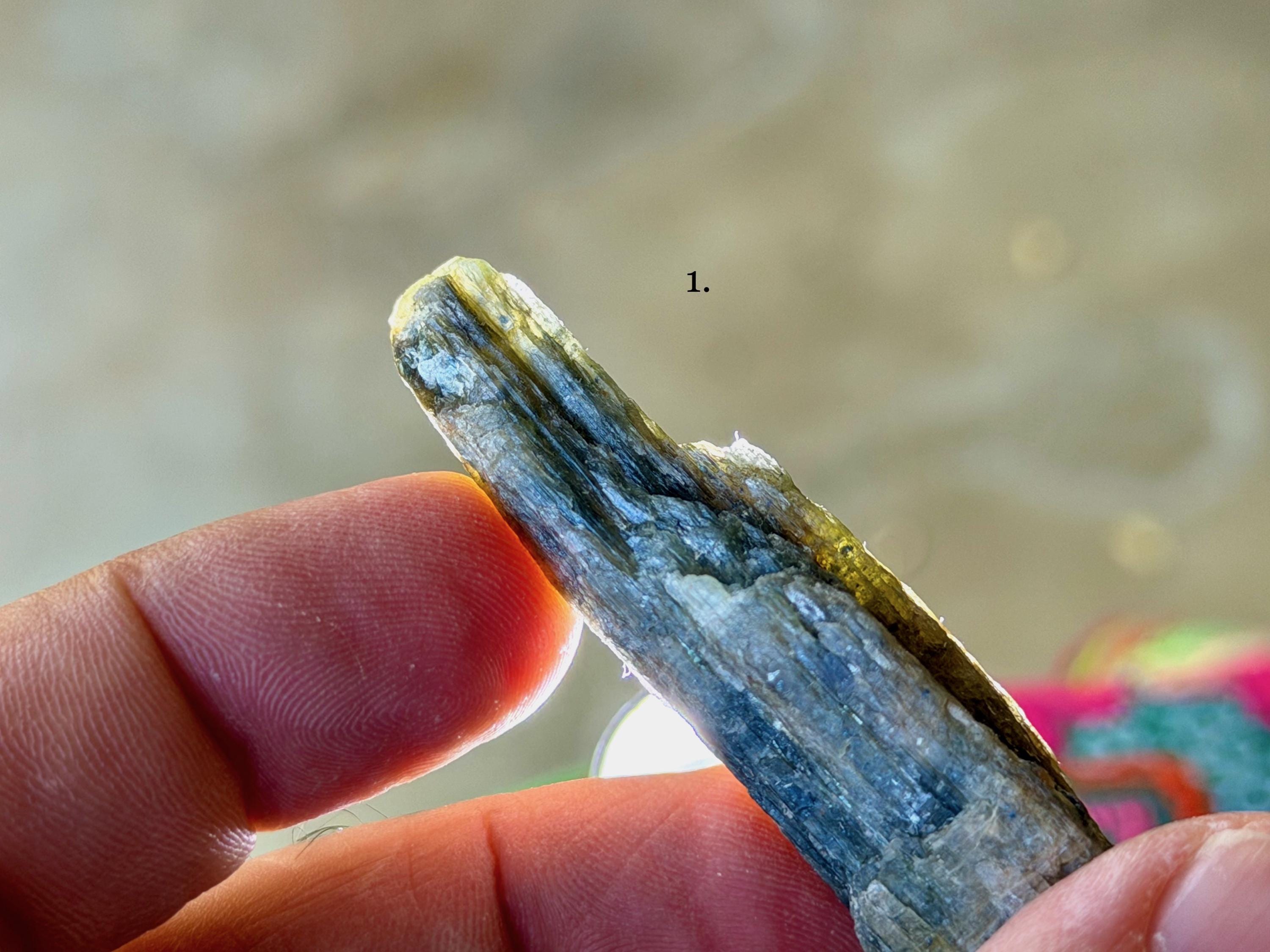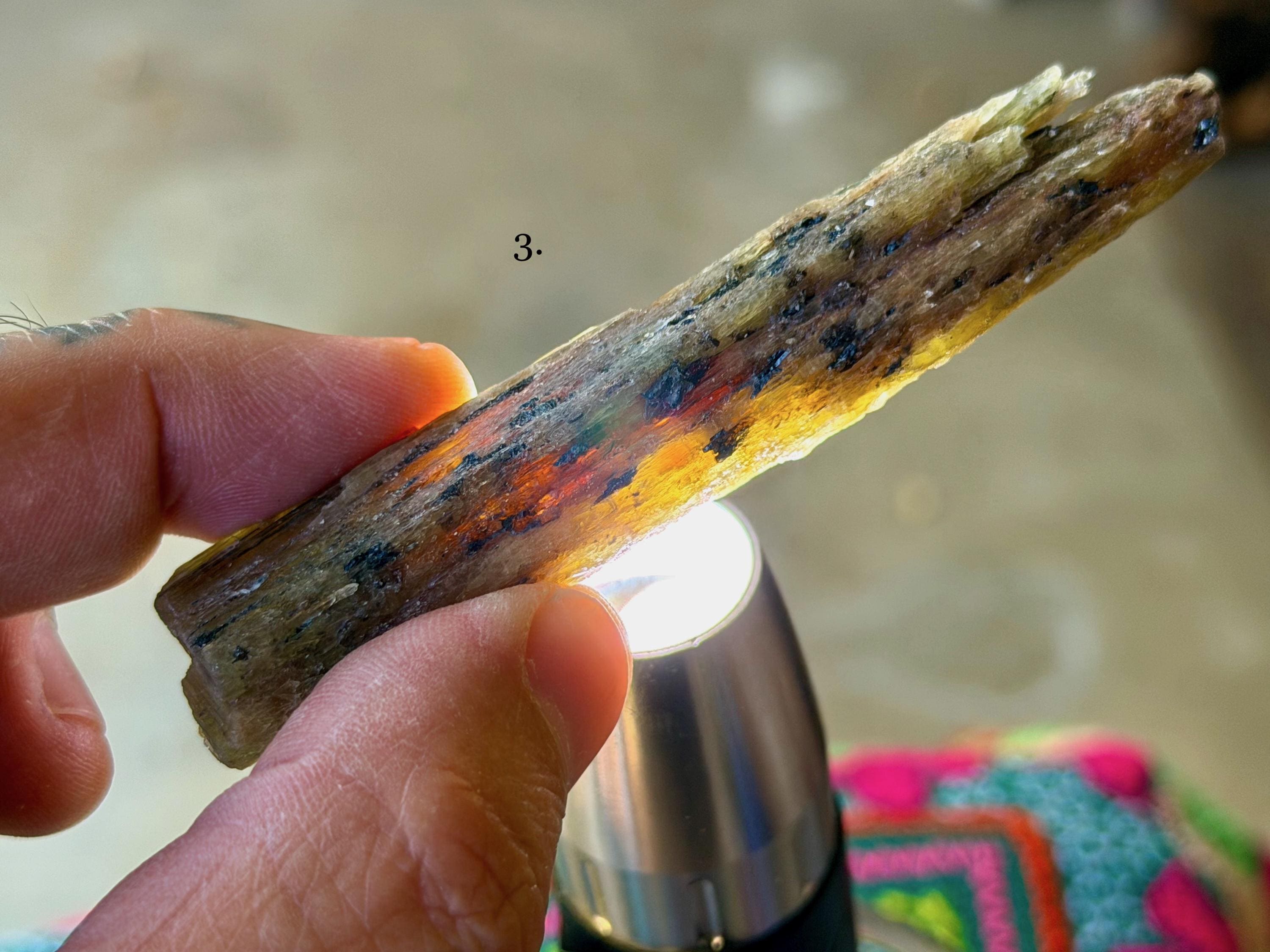 These crystals possess natural, elongated "blade" formations, with metallic green hues and, in some cases, hints of orange as well. These crystals all pass light beautifully (some through and thorough, and others at the tips), and we've included photos in both natural light and backlit.