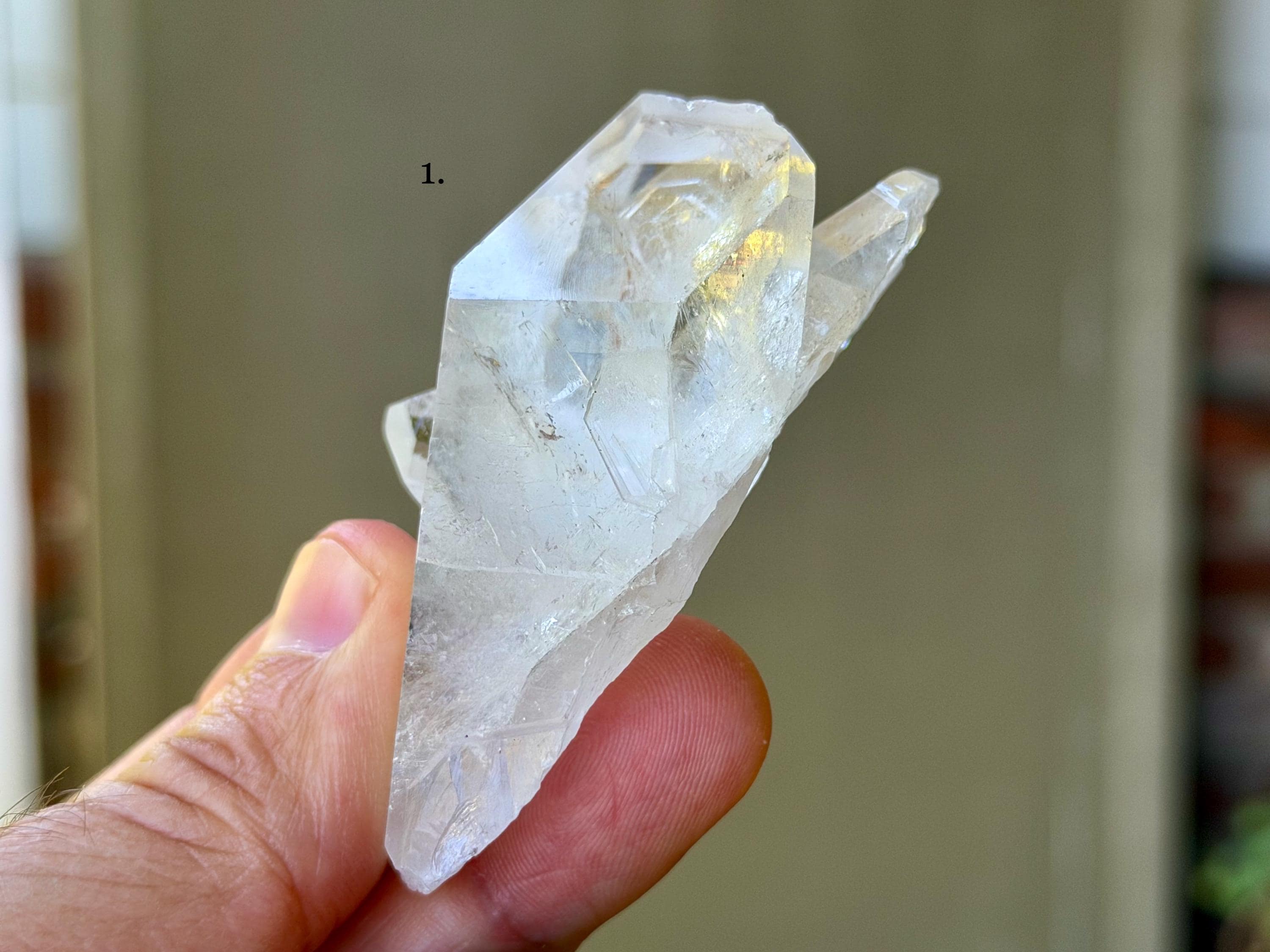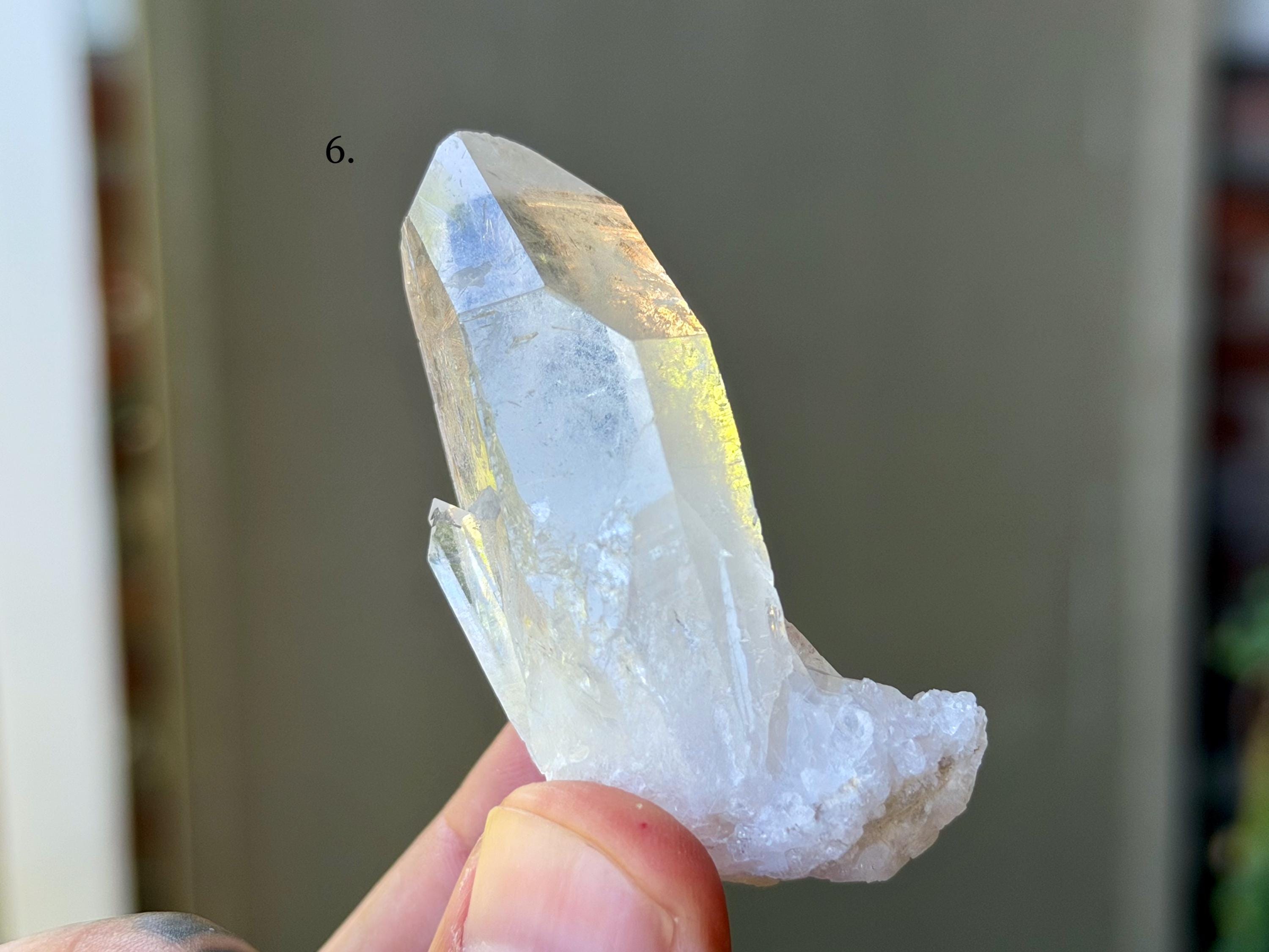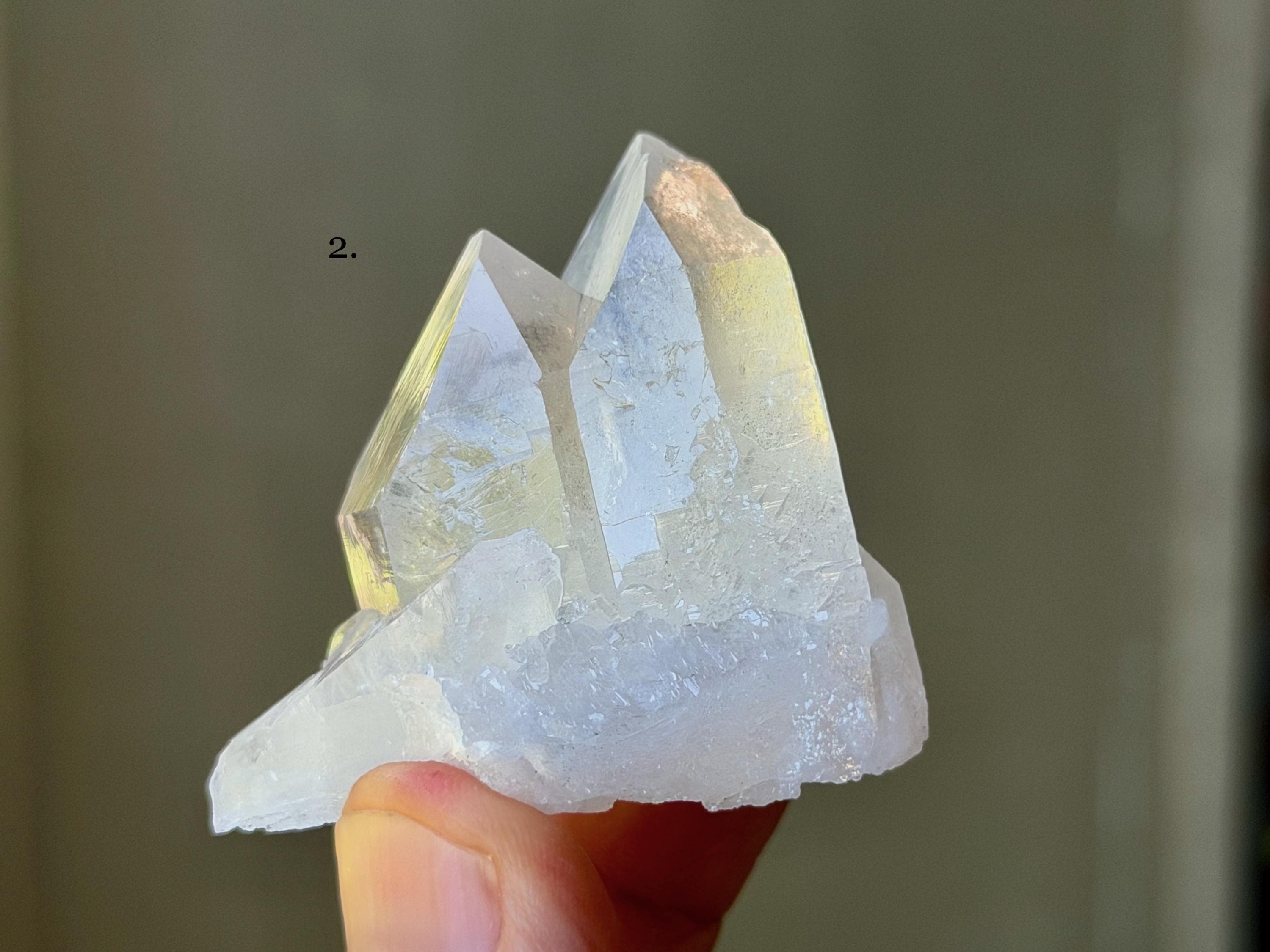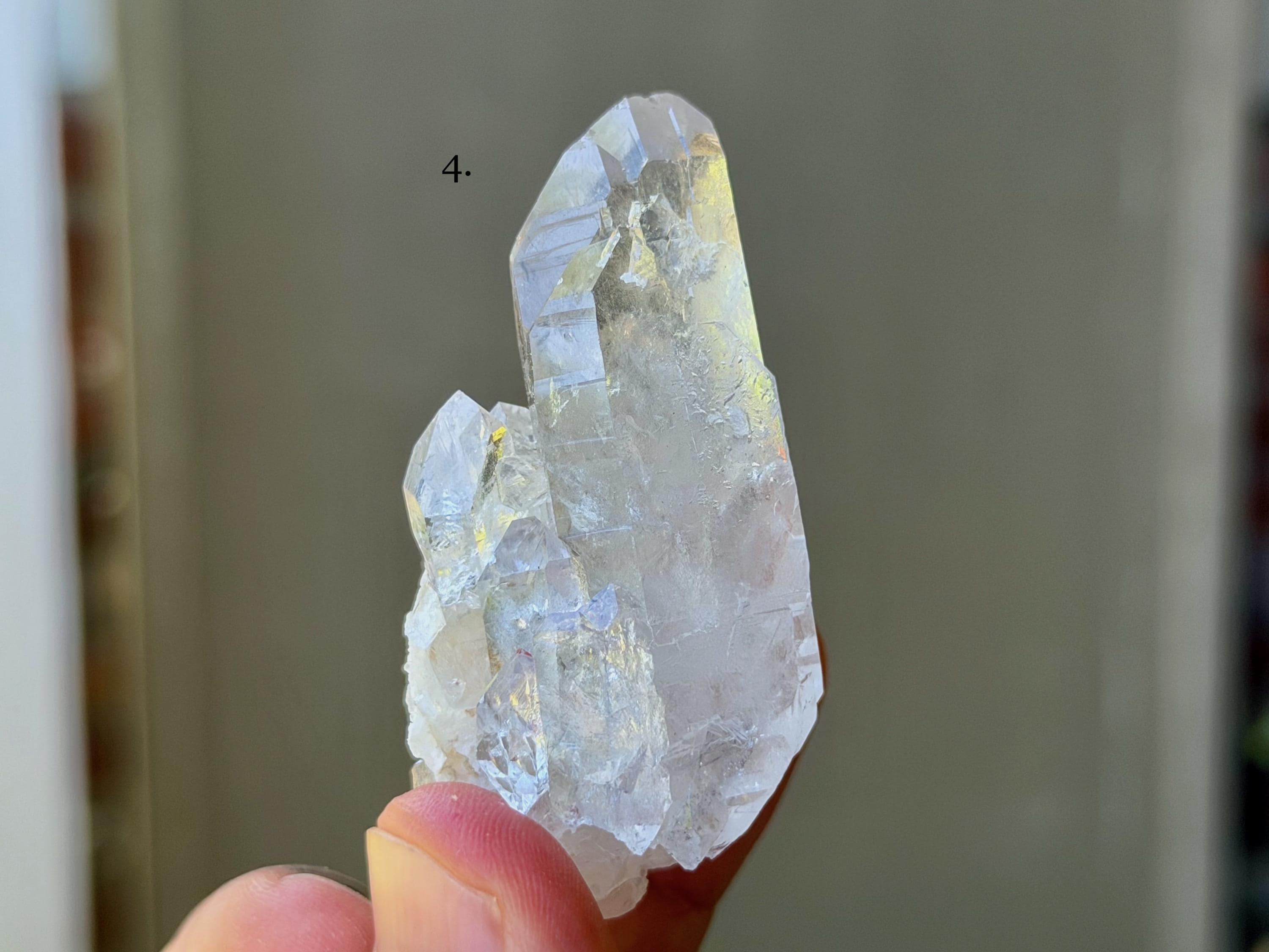 *Please note these crystals are all clear and colorless. Any yellow hues in the photos are from the natural sunlight and surrounding environment reflecting off the crystal itself.