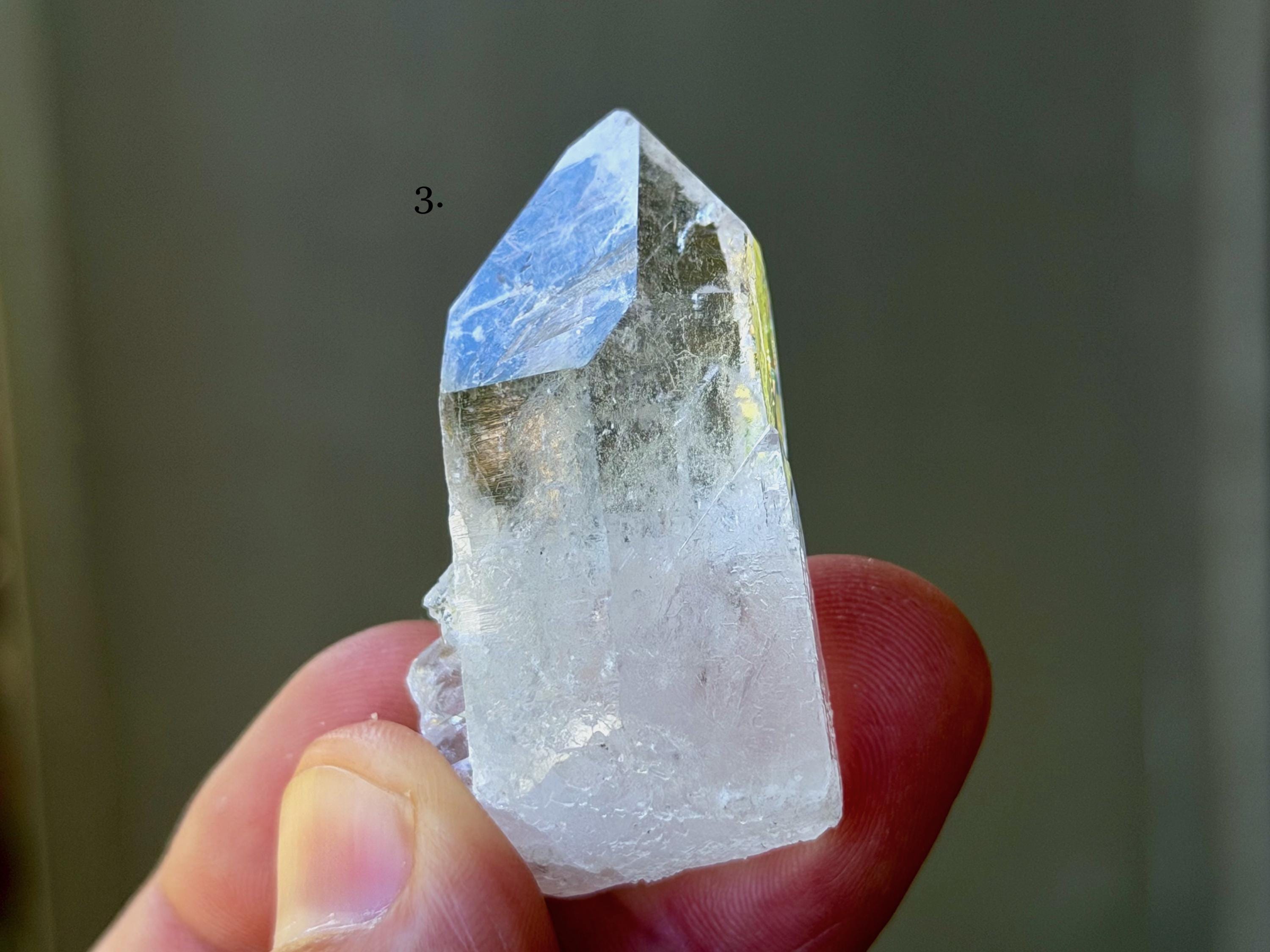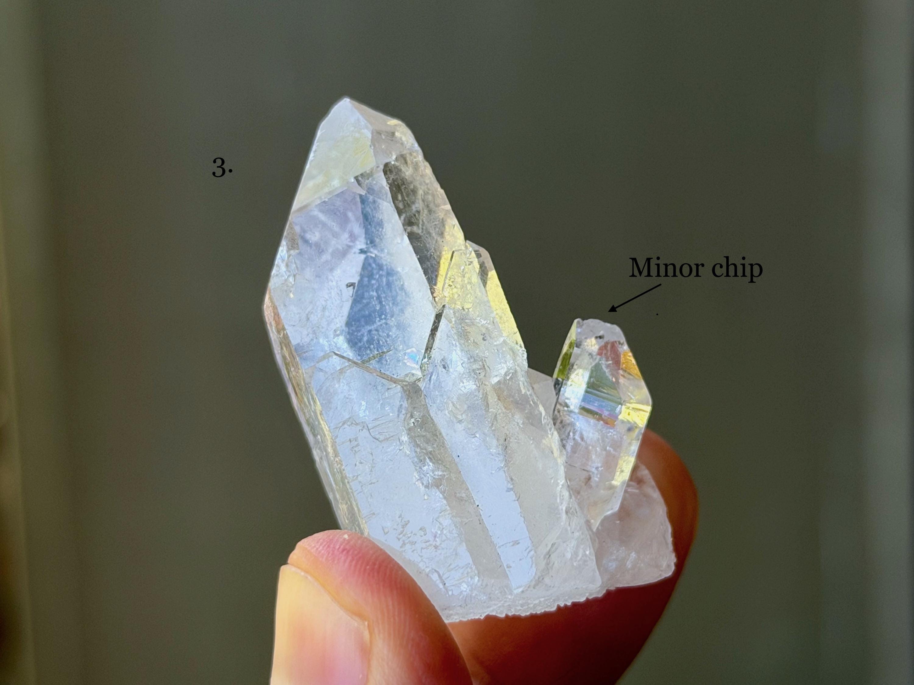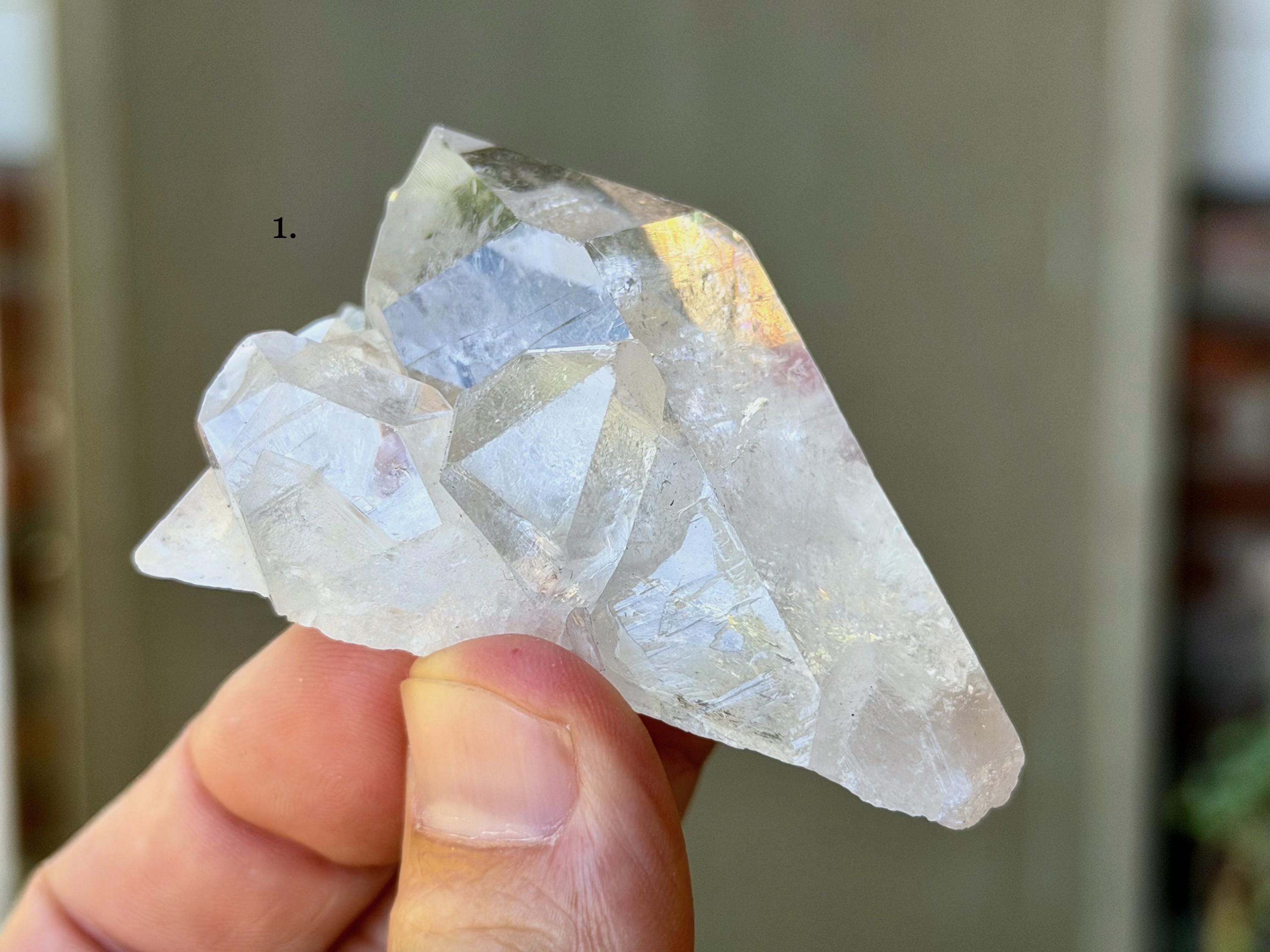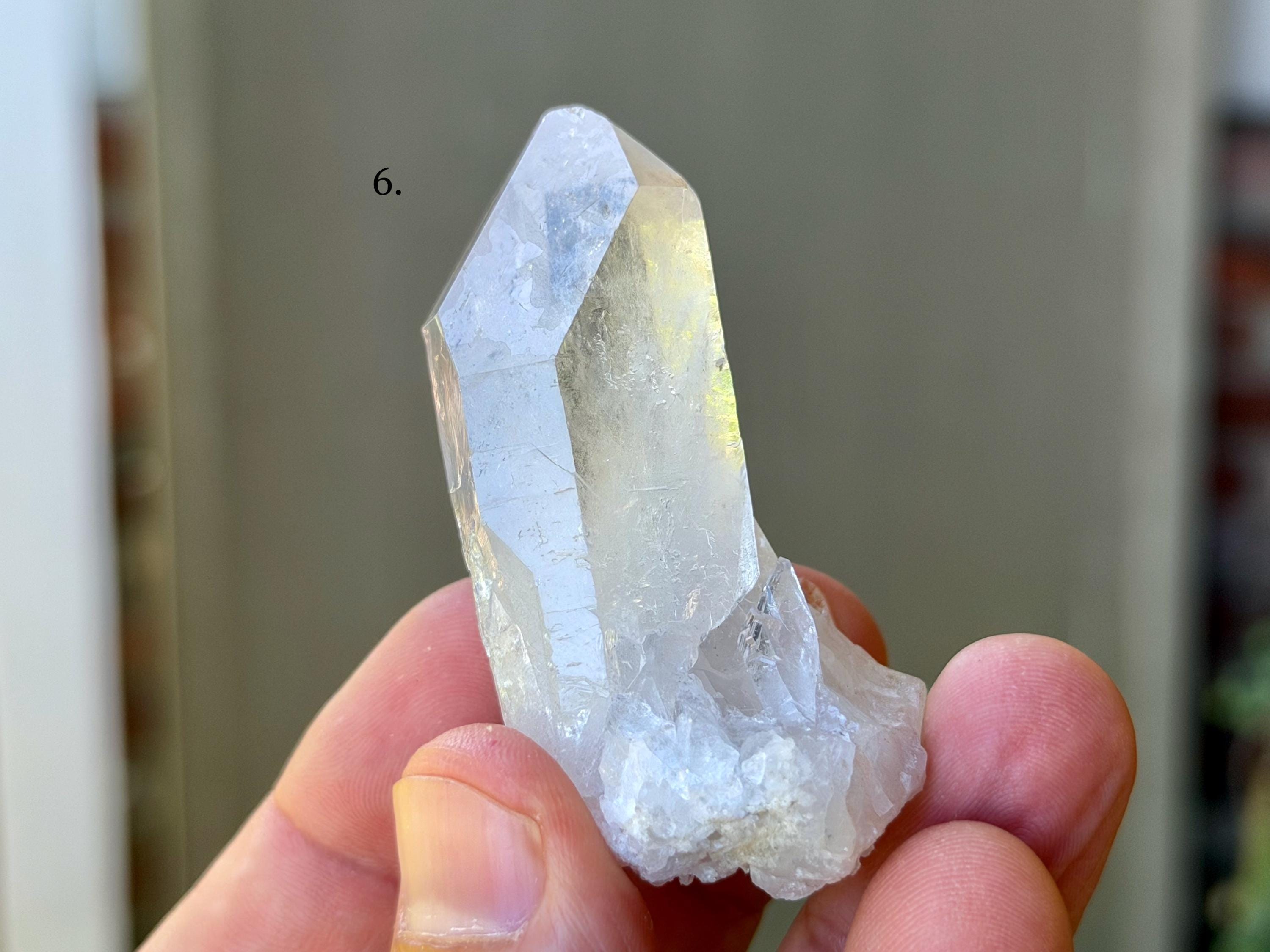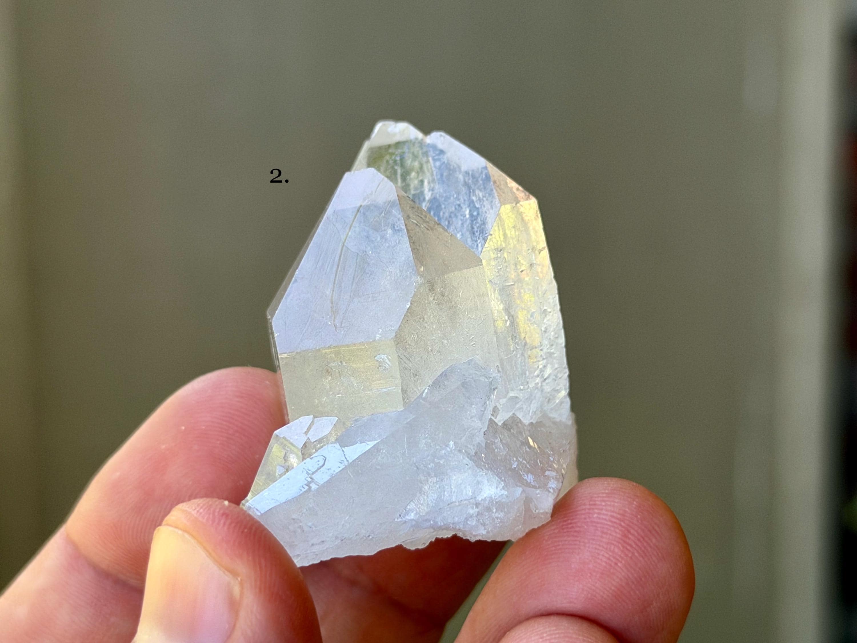 *Please note these crystals are all clear and colorless. Any yellow hues in the photos are from the natural sunlight and surrounding environment reflecting off the crystal itself.