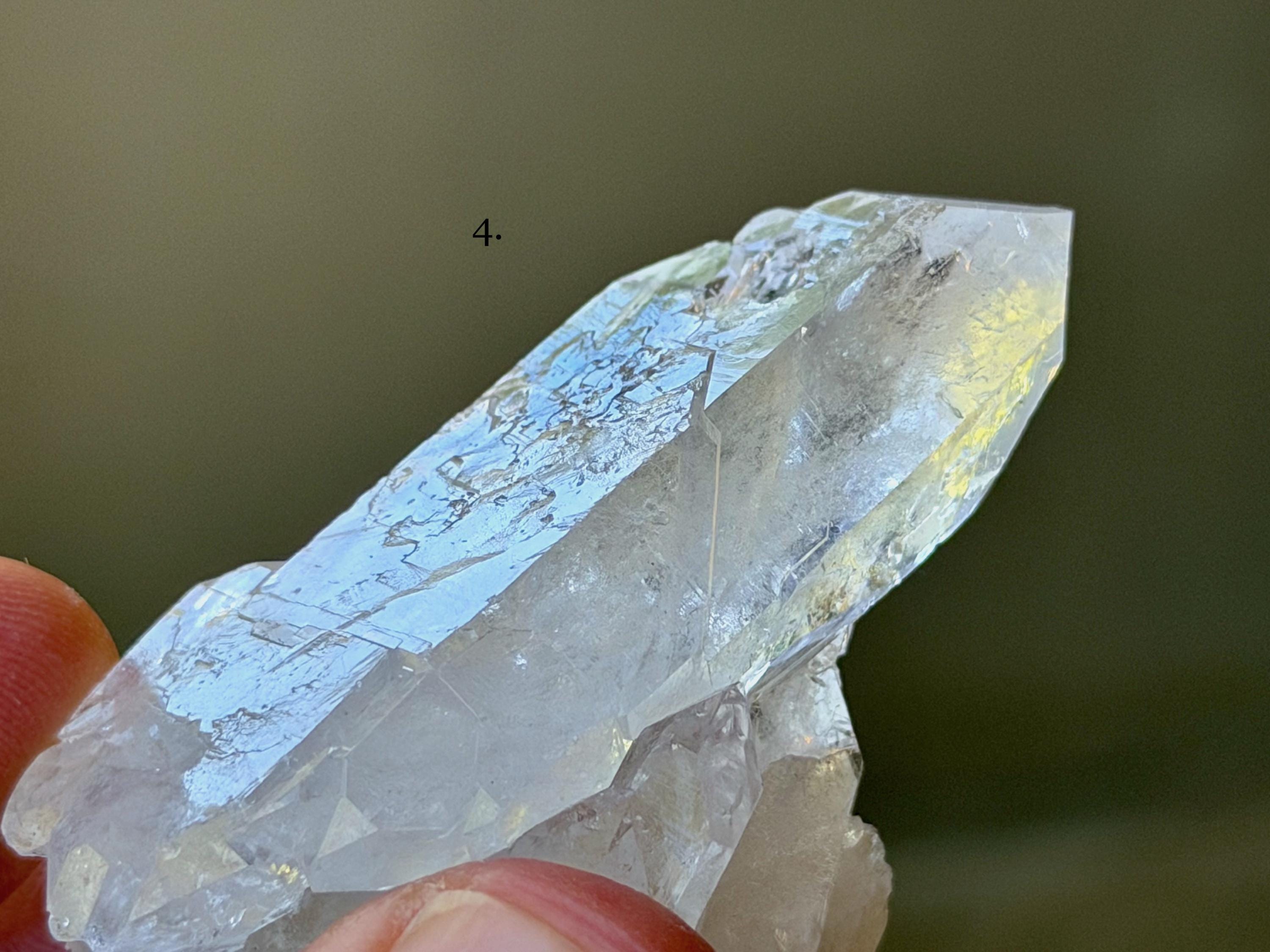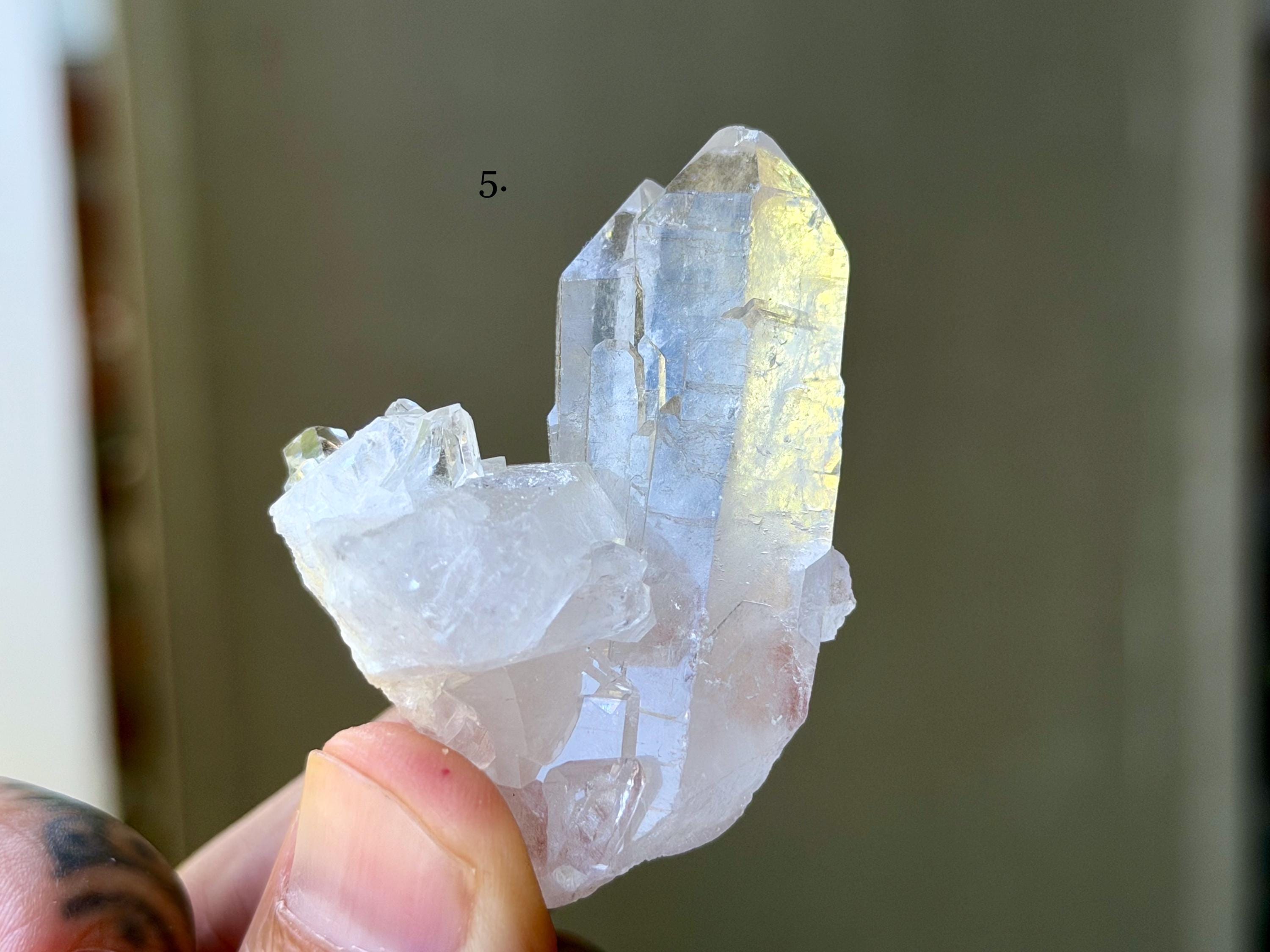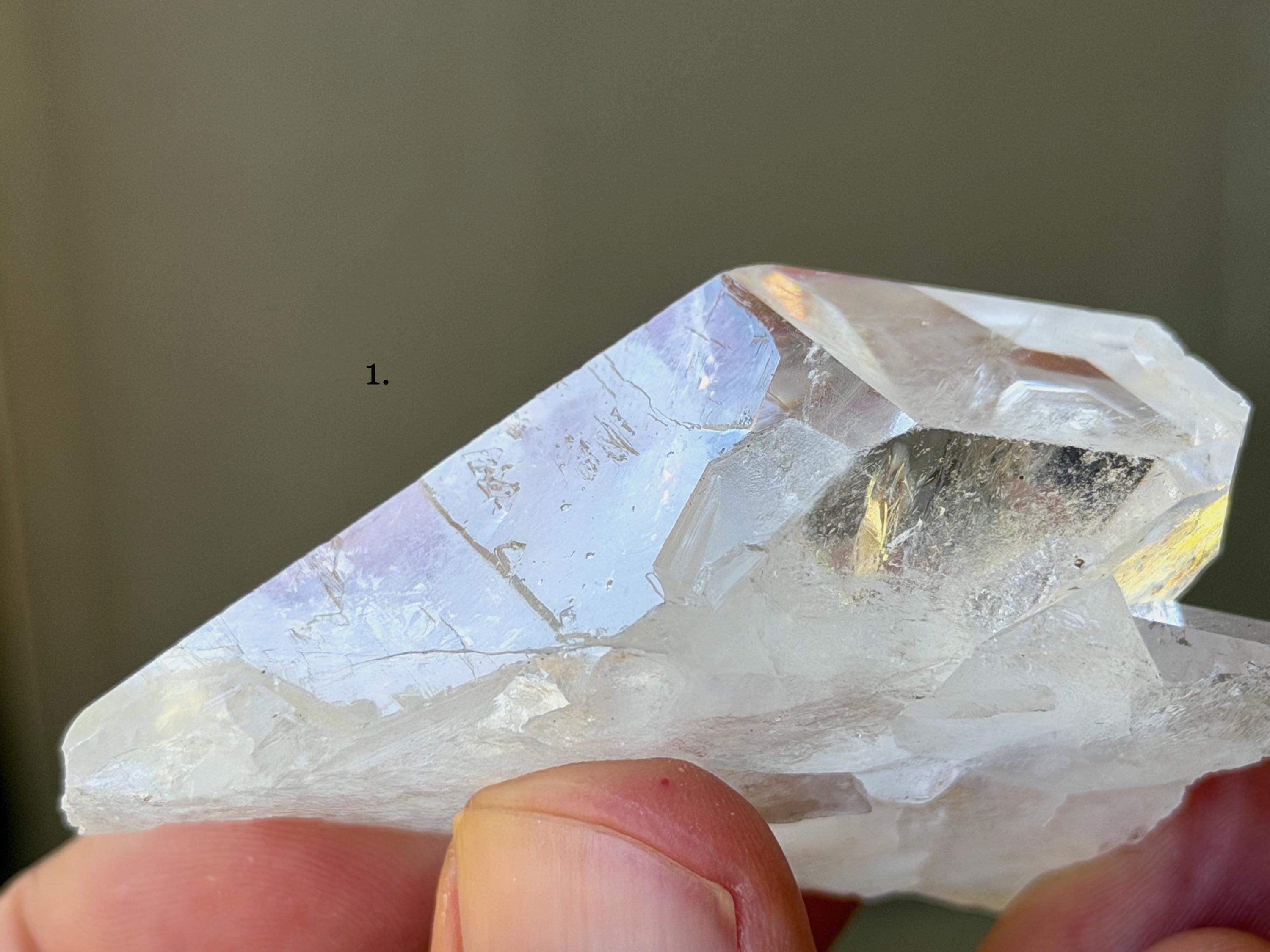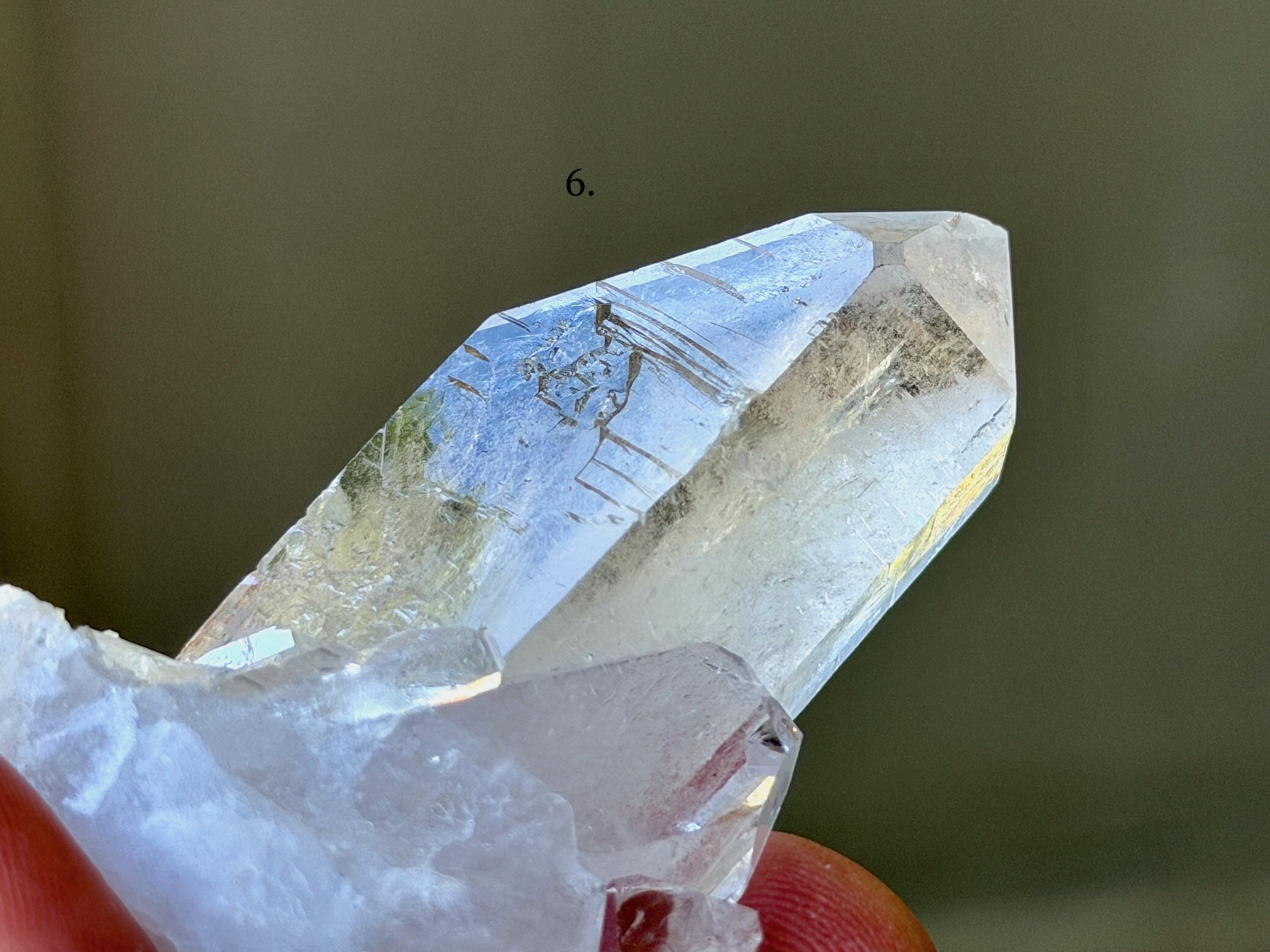 *Please note these crystals are all clear and colorless. Any yellow hues in the photos are from the natural sunlight and surrounding environment reflecting off the crystal itself.