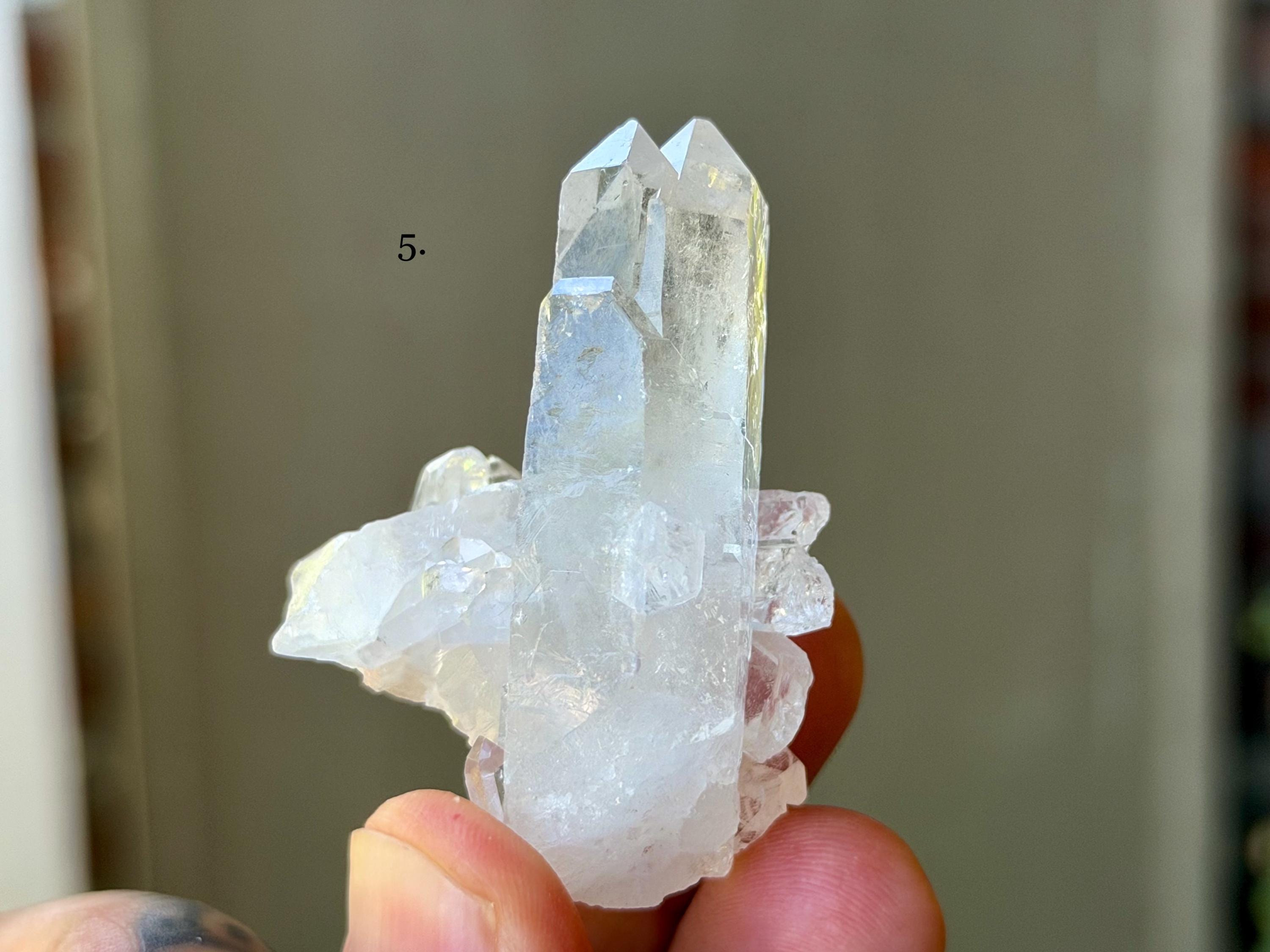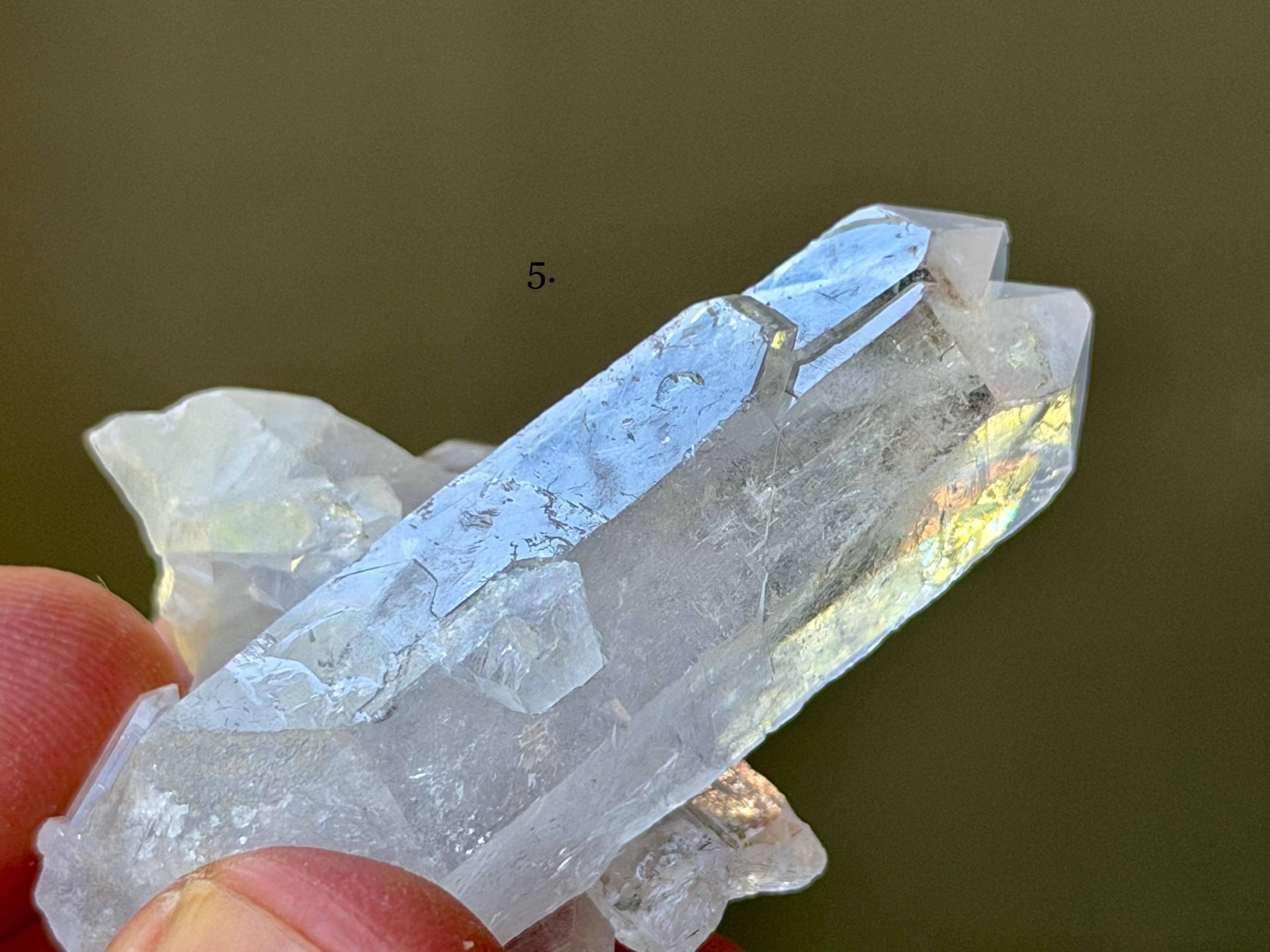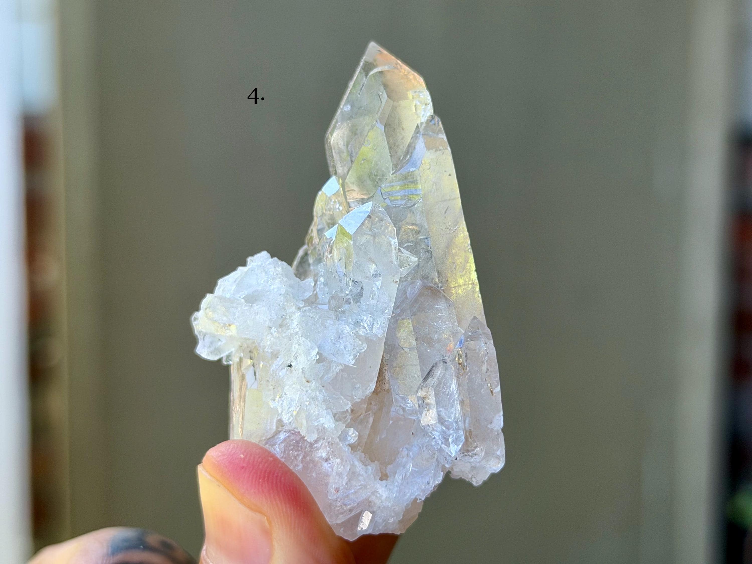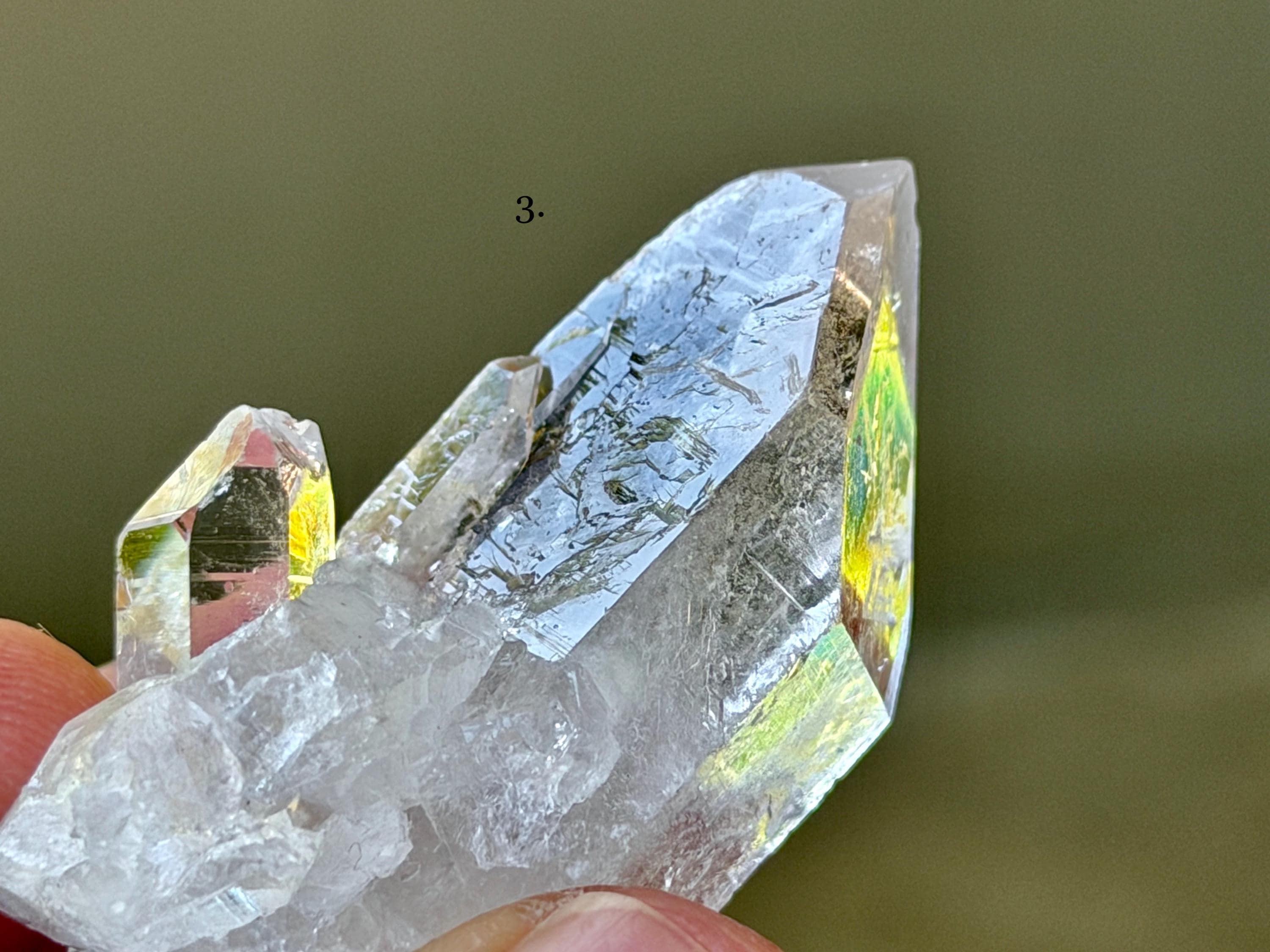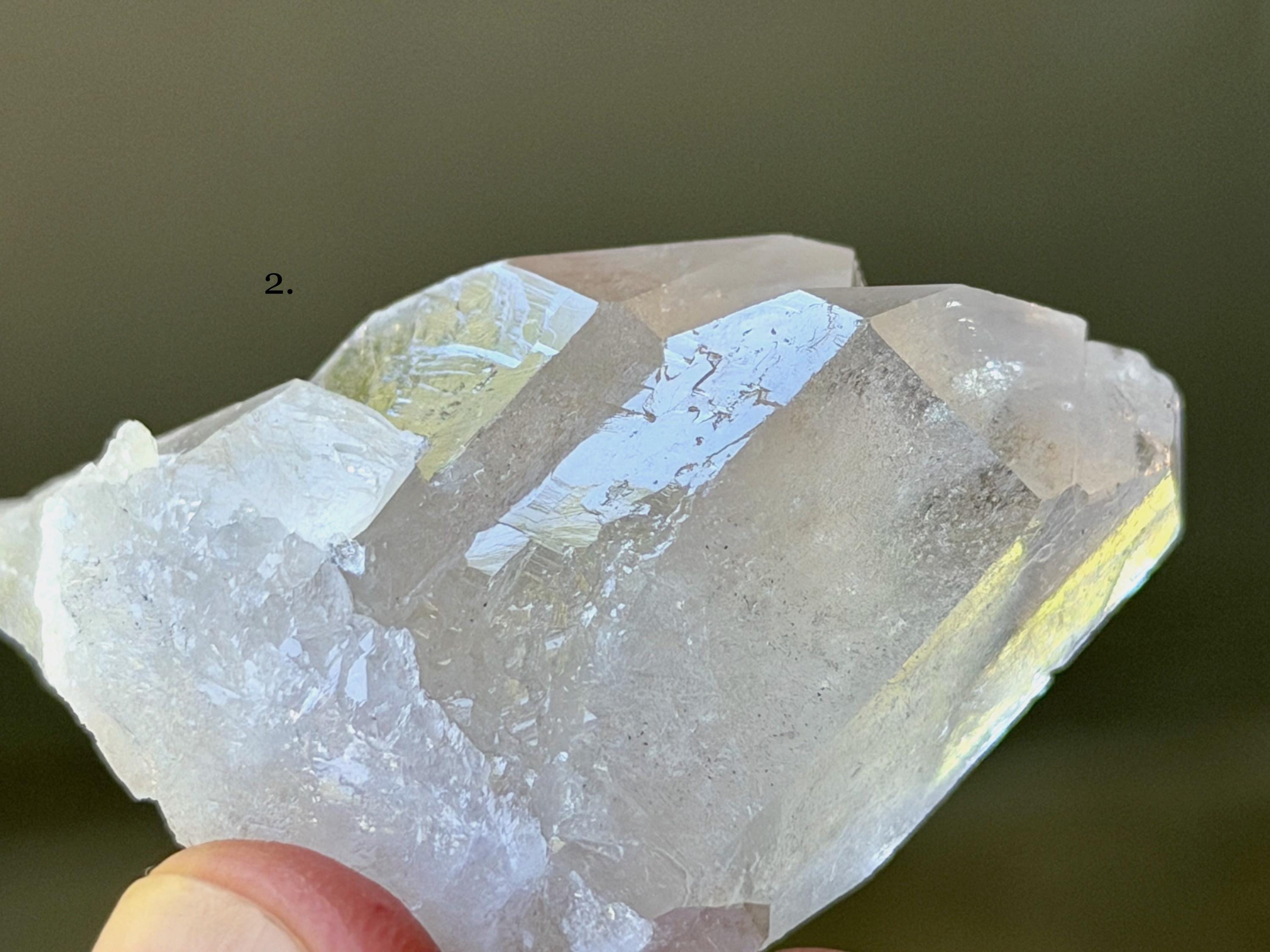 *Please note these crystals are all clear and colorless. Any yellow hues in the photos are from the natural sunlight and surrounding environment reflecting off the crystal itself.