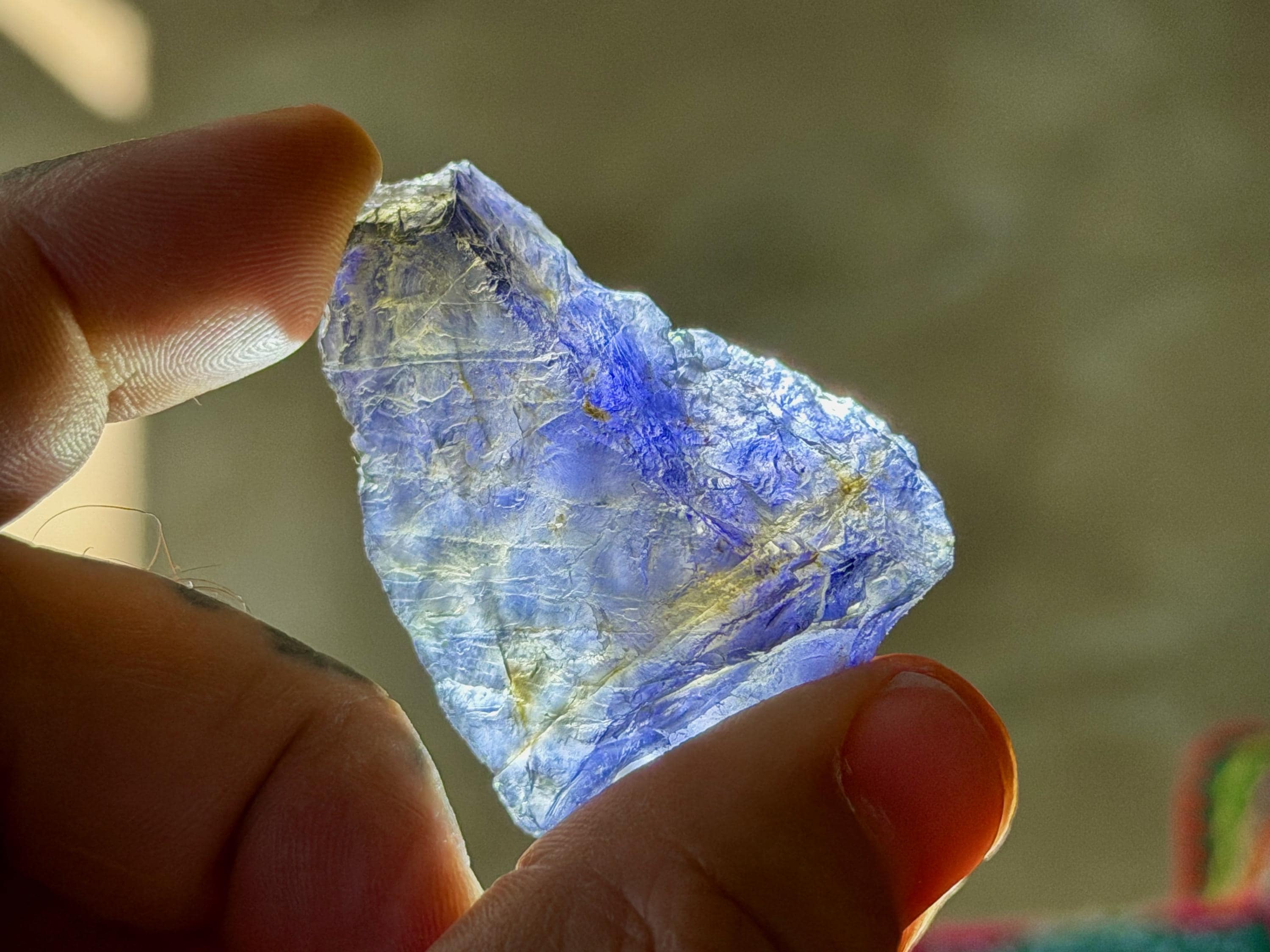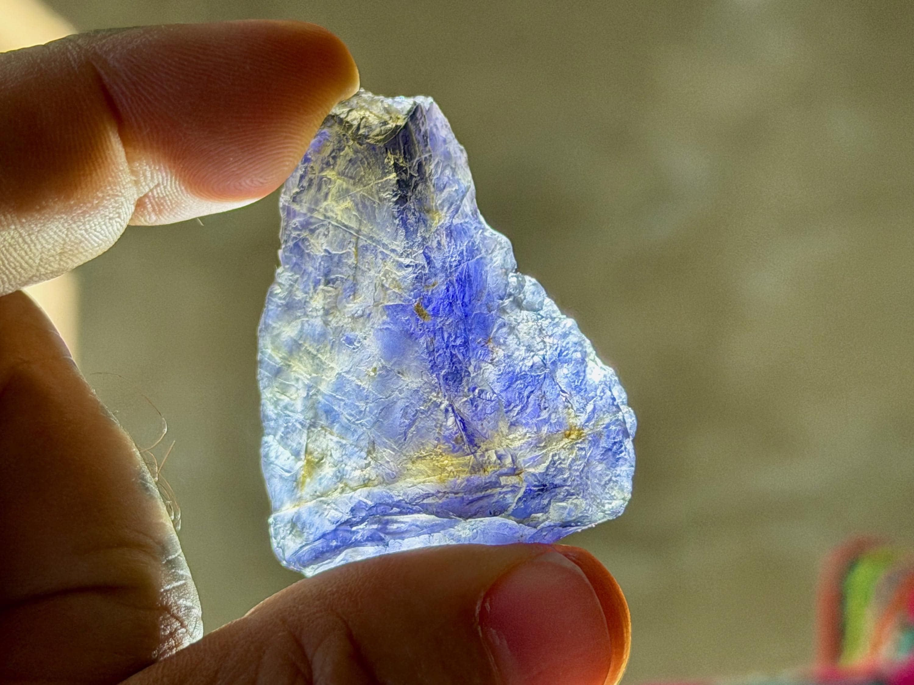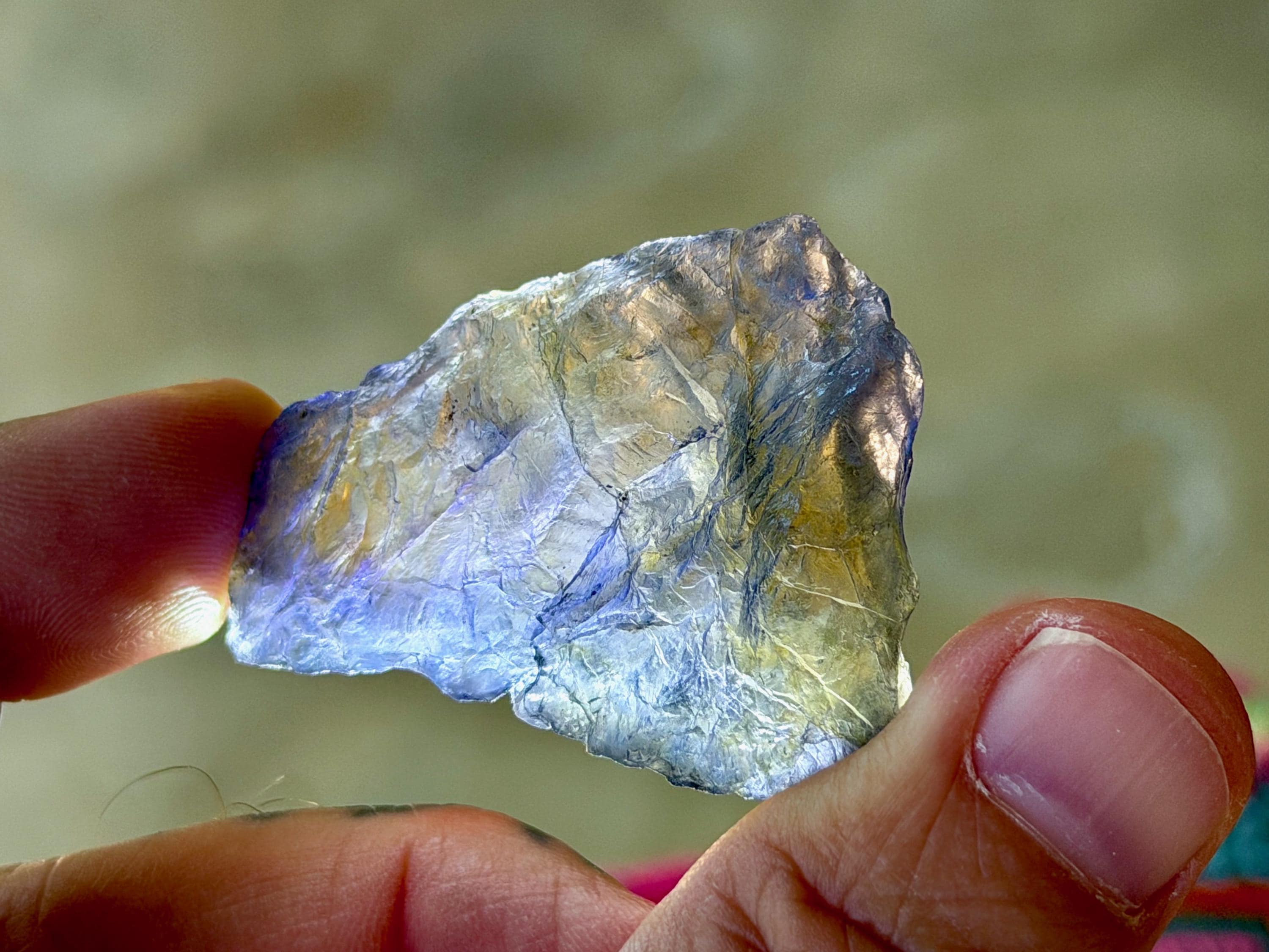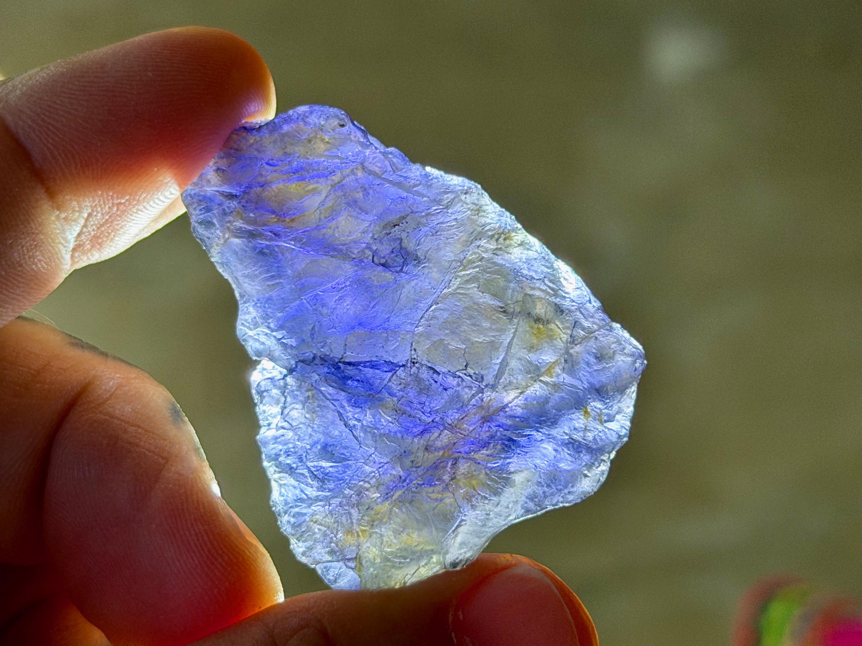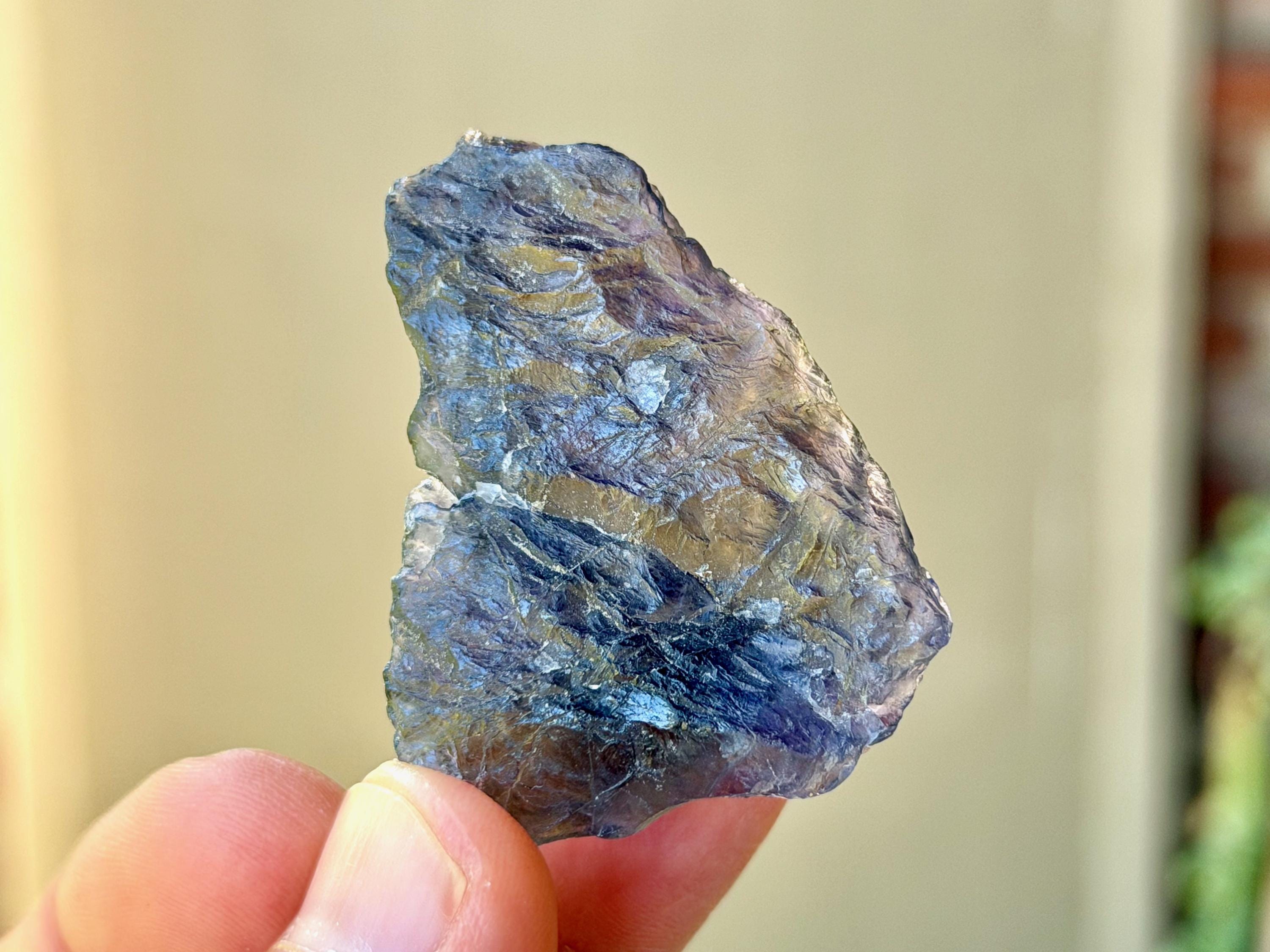 A broad and partially flat formation to this natural Iolite crystal. In natural light, this crystal appears dark with just a hint of purple color. However, when backlit, as in Photos 1, 3-6, it comes to life with magnificent translucency and beautiful golden and indigo hues.
