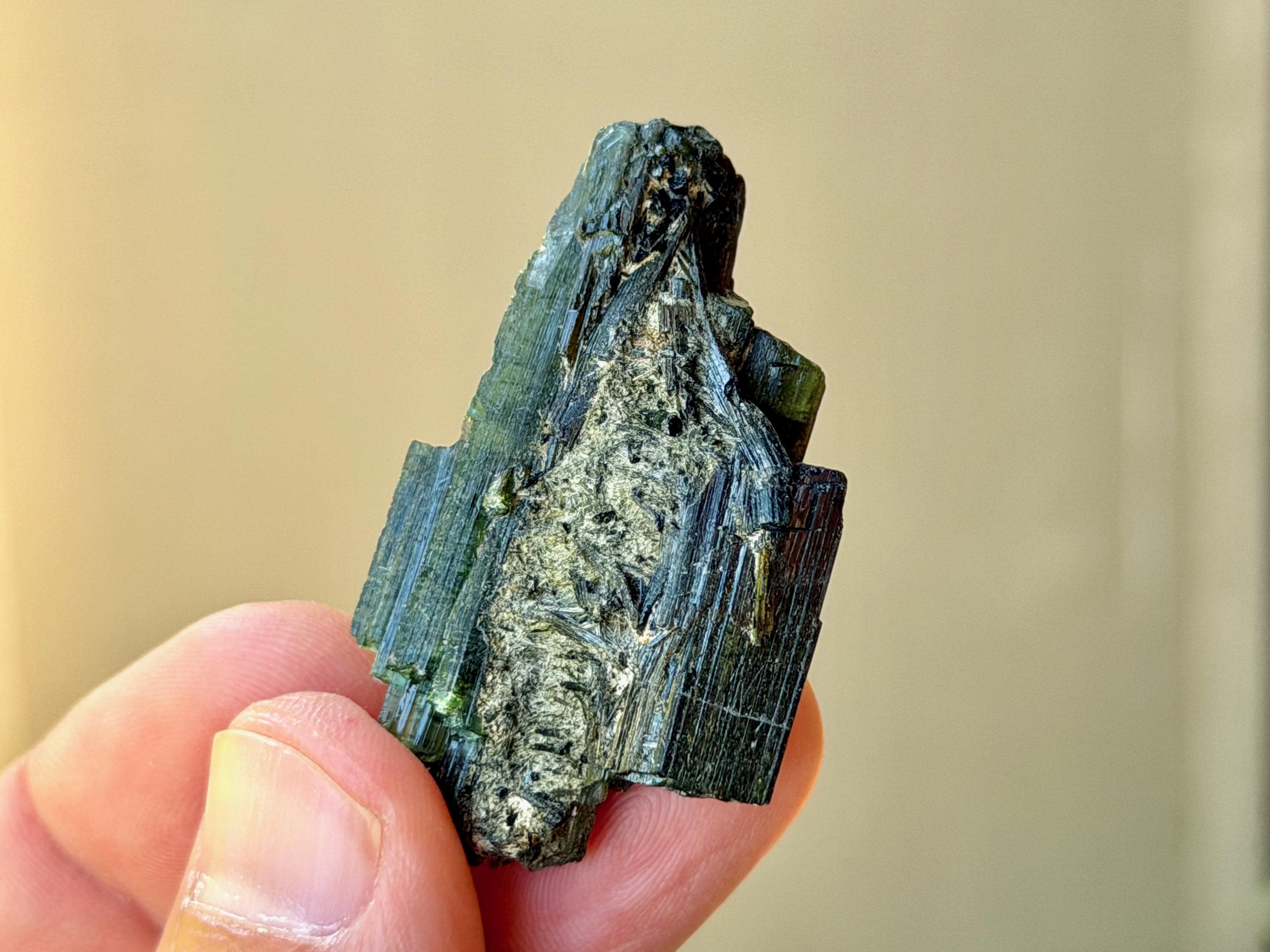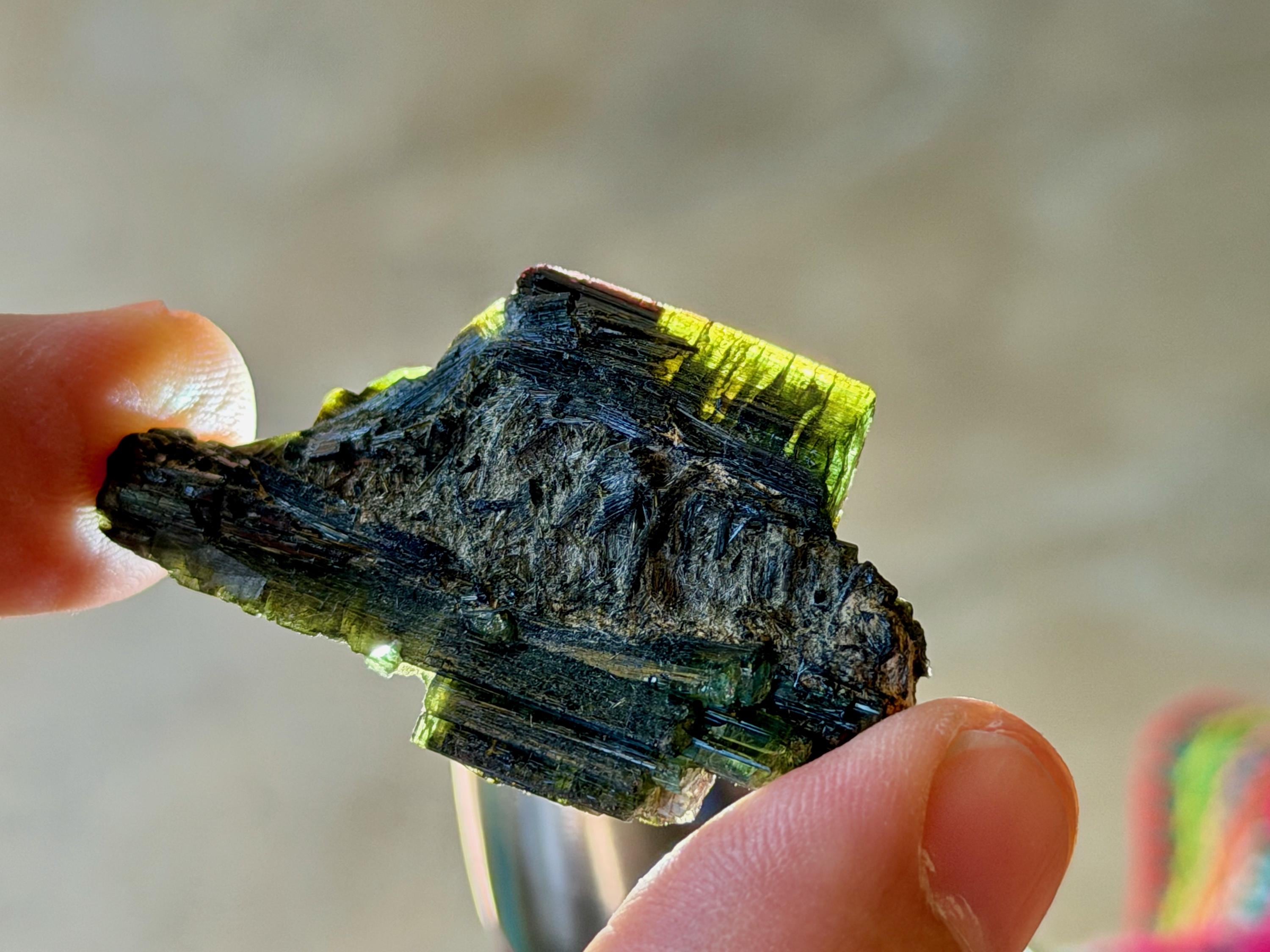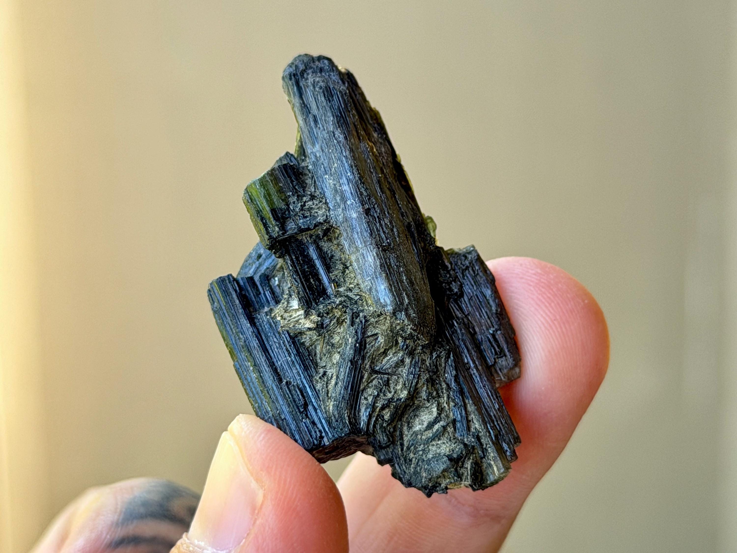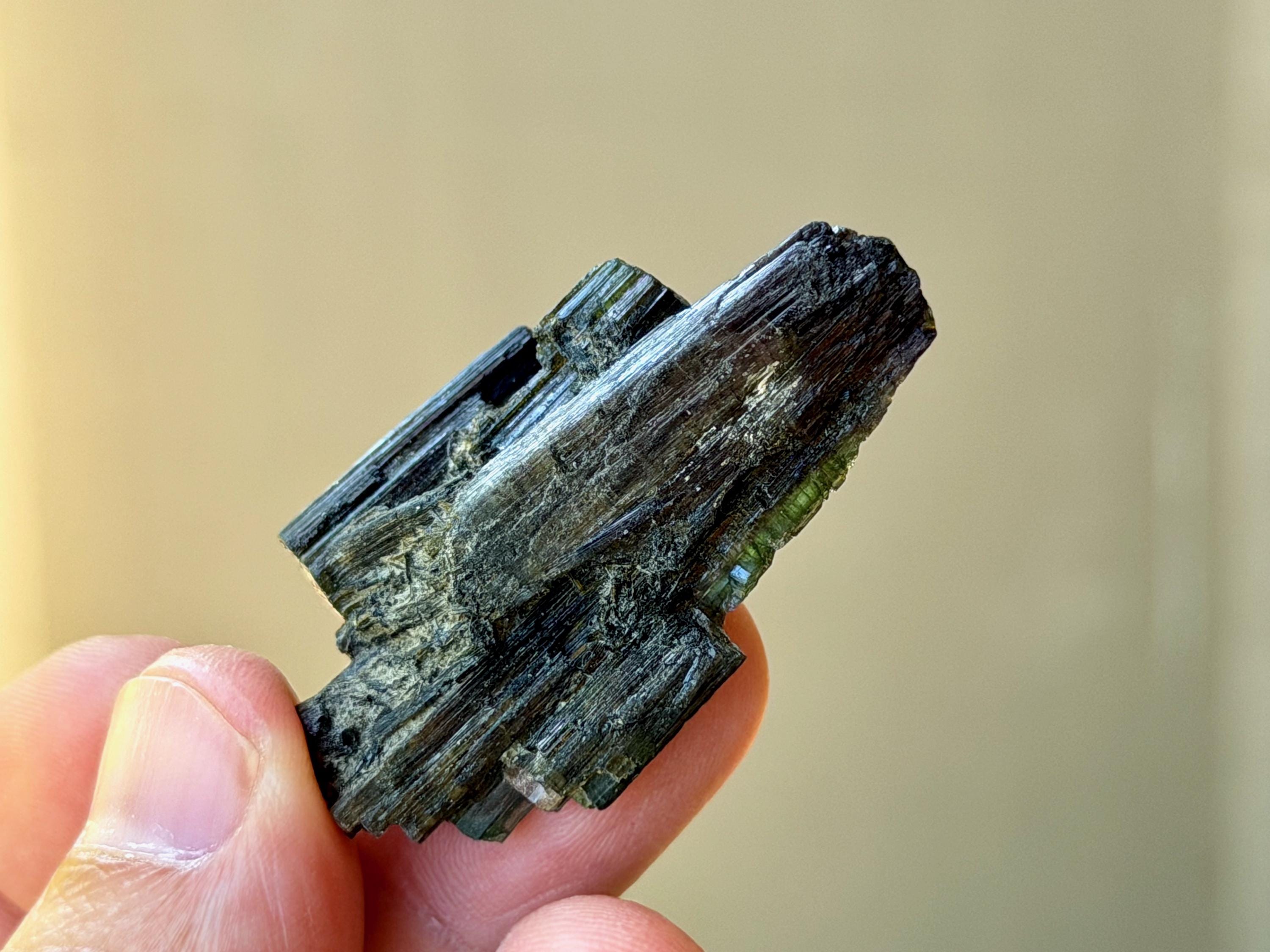 Gorgeous, dark luster to this unique Green Tourmaline cluster with a very mild "cat's eye" iridescence. At first glance, this simply appears to be a dark Green Tourmaline. But when we backlight it, as in Photos 1, 3-6, we can see some beautiful translucency around the edges, revealing hints of yellow and brown.