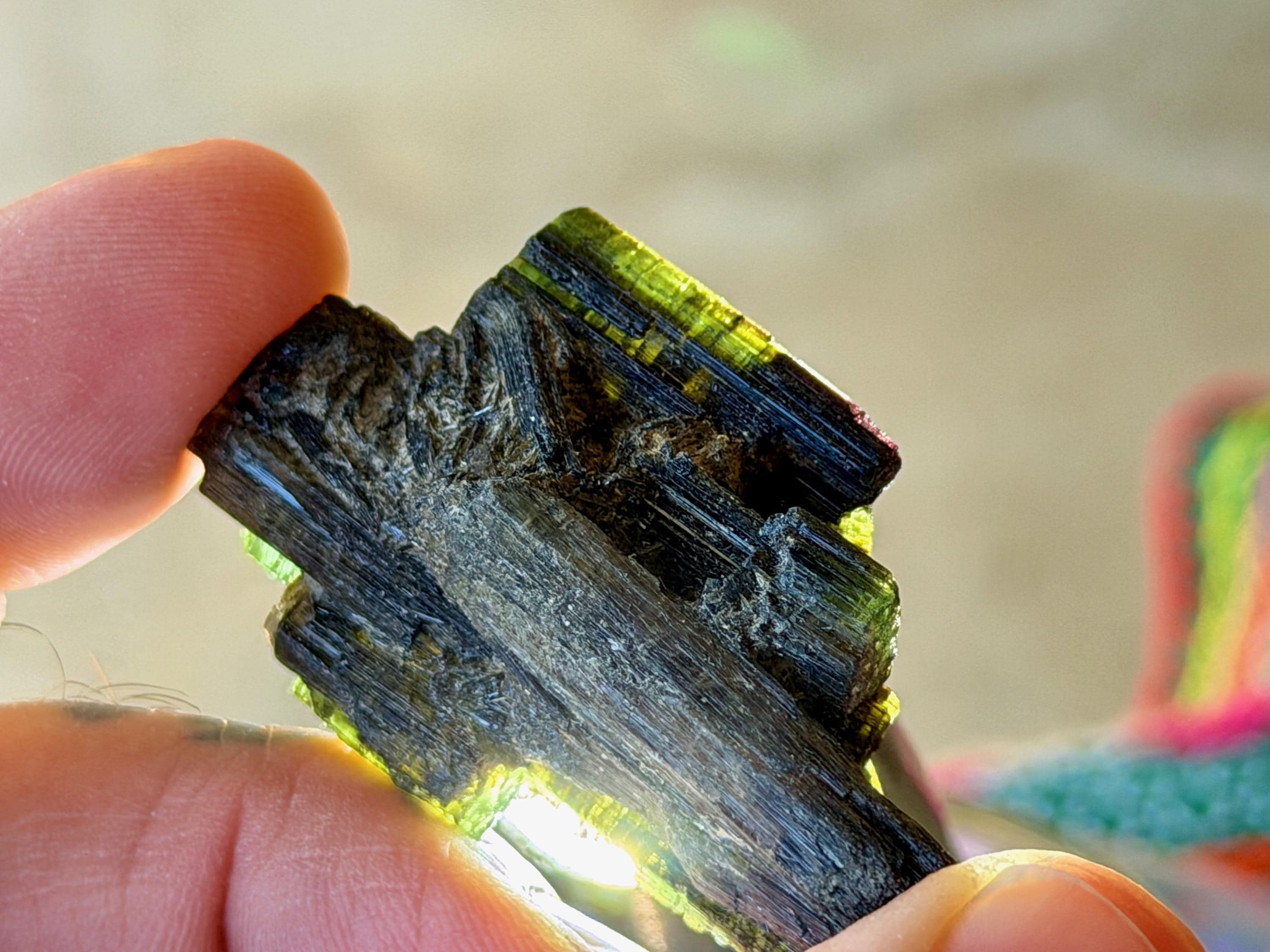 Green Tourmaline purifies and strengthens, allowing one to energetically carry greater amounts of Life Force (Prana Energy). As more energy is carried within the physical body, higher degrees of consciousness can be maintained. It is a wonderful protection stone, deal for sealing holes in the aura that leave one vulnerable to negativity.