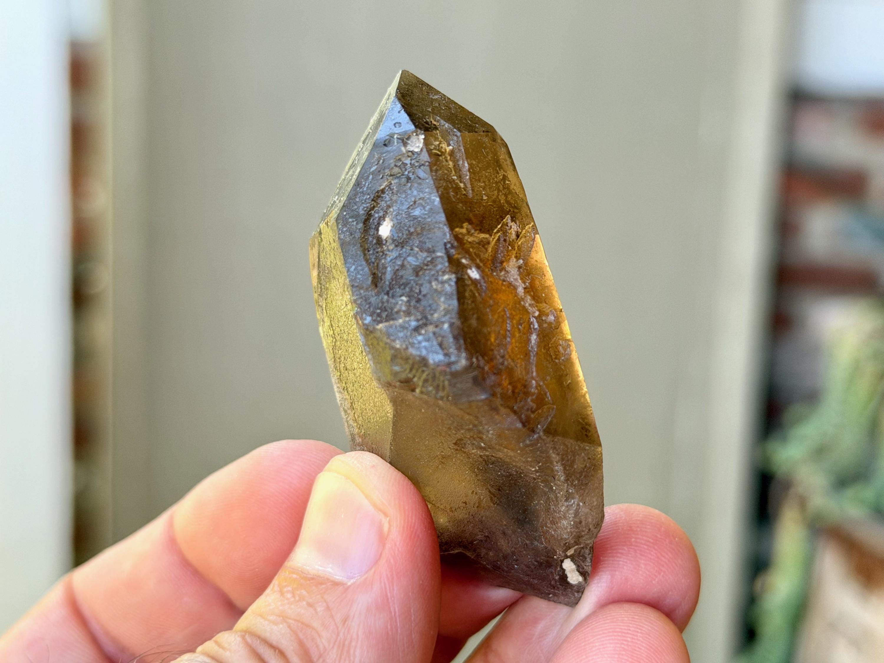 Elegant luster and very nice clarity to this Pele's Dream Lemurian with a deep smoky-golden color. Despite its dark complexion, this crystal is actually completely transparent in natural light. And when backlit, as in Photos 4-5, it lights up magnificently.