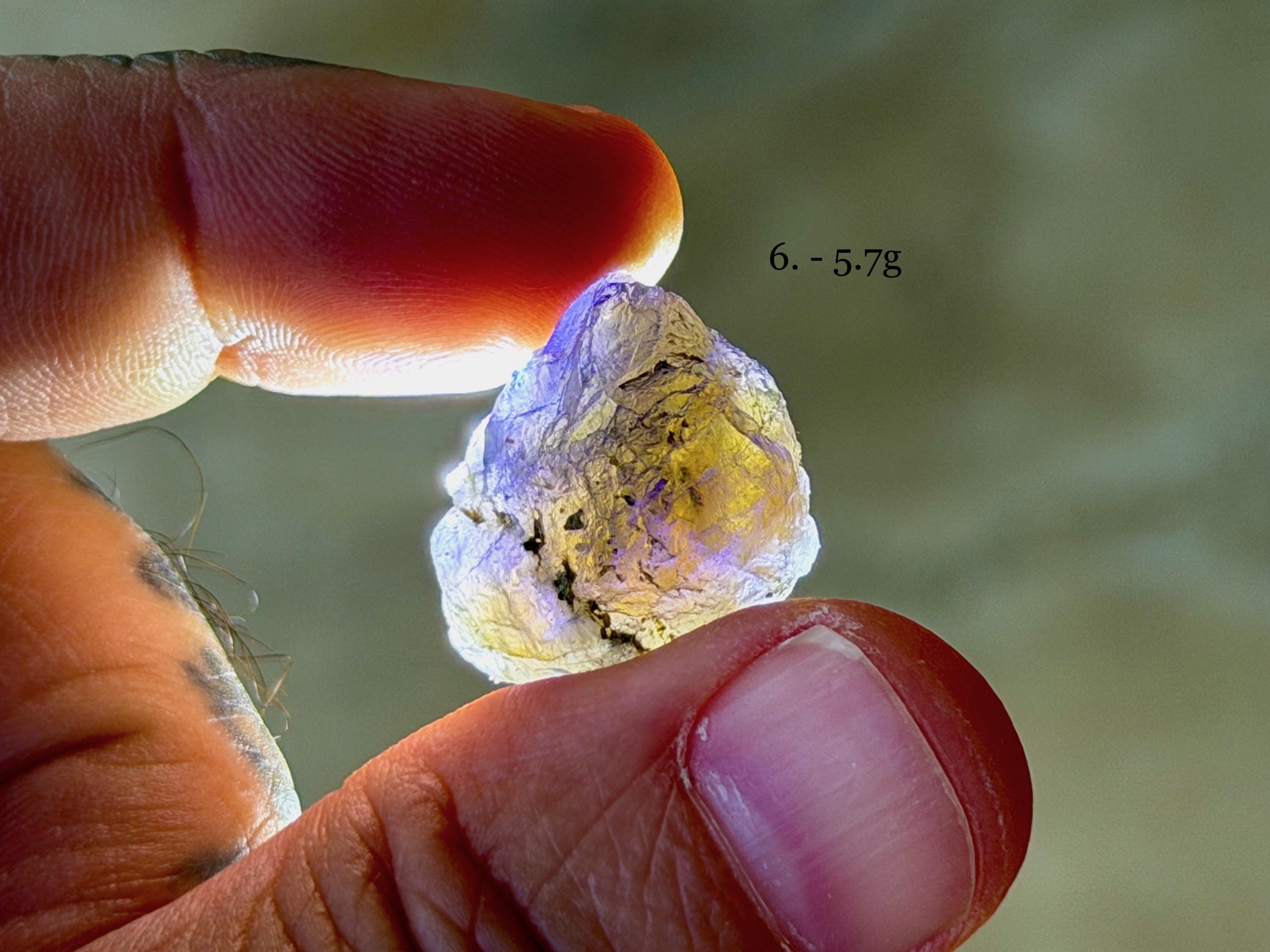 A nice selection of natural, unpolished Iolite crystals in their natural formations. In natural light, these crystals all appear very dark, with just a slight tinge of purple color. However, when backlit, these crystals come to life with magnificent translucency and beautiful golden and indigo hues. We've included photos in both natural light and backlit to show them off.