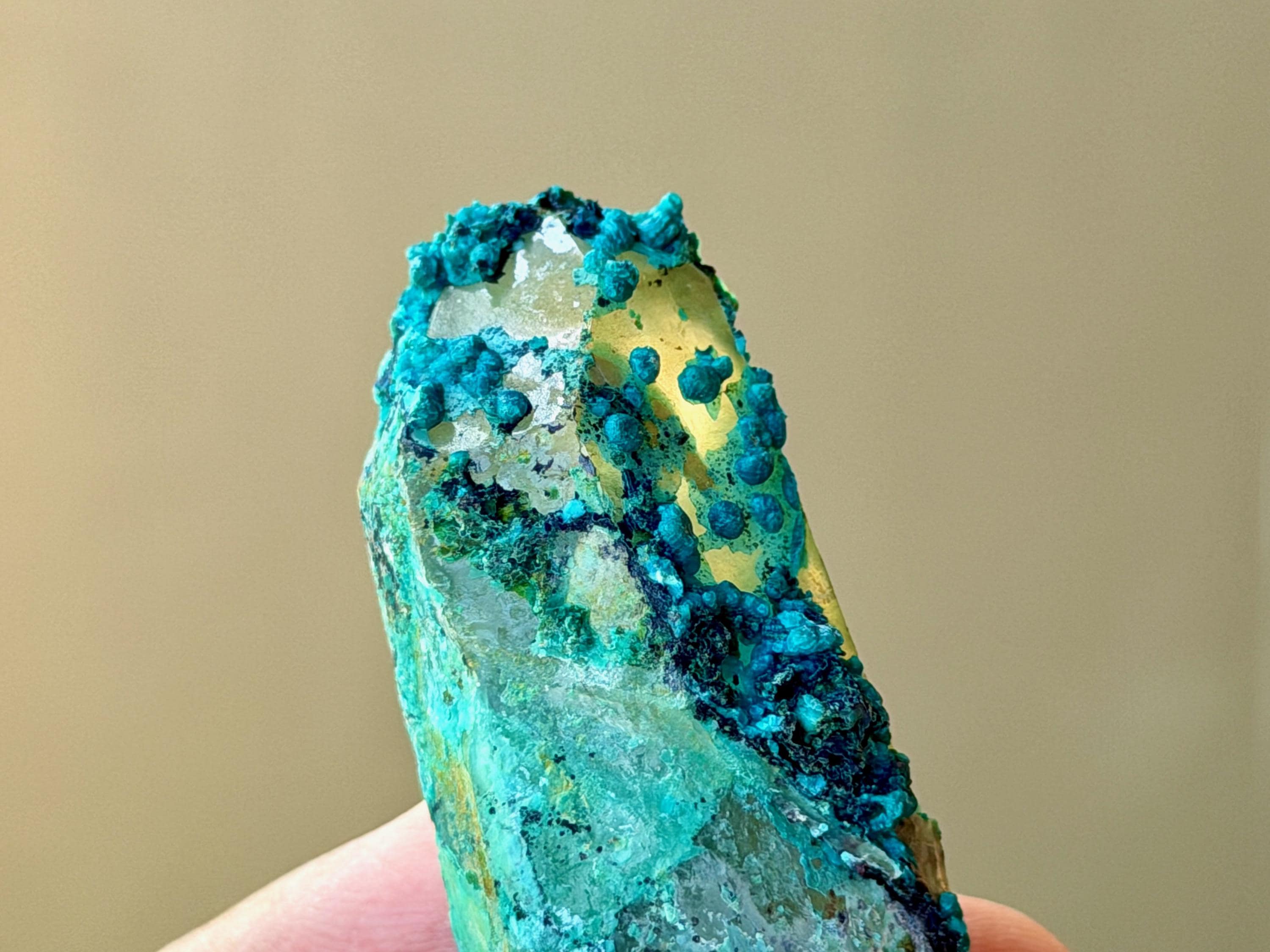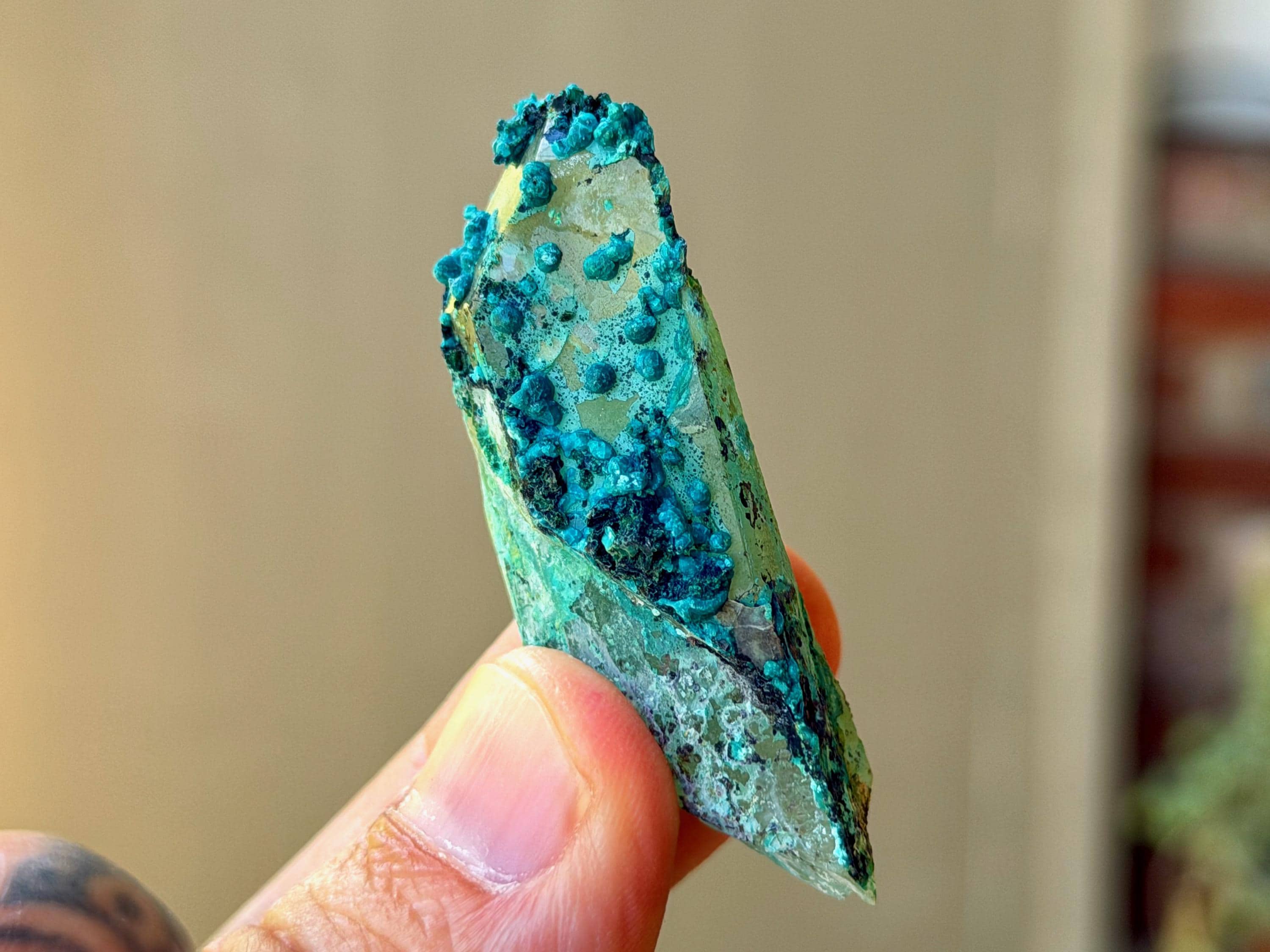 Vibrant teal blue hues to this exquisite Chrysocolla Quartz crystal! This crystal features a fully formed Quartz point with a frosting of Chrysocolla covering most of its body. We love how the Quartz peeks through the exterior inclusions, as well as all the tiny, "bubbly" botryoidal forms we see throughout much of this piece!