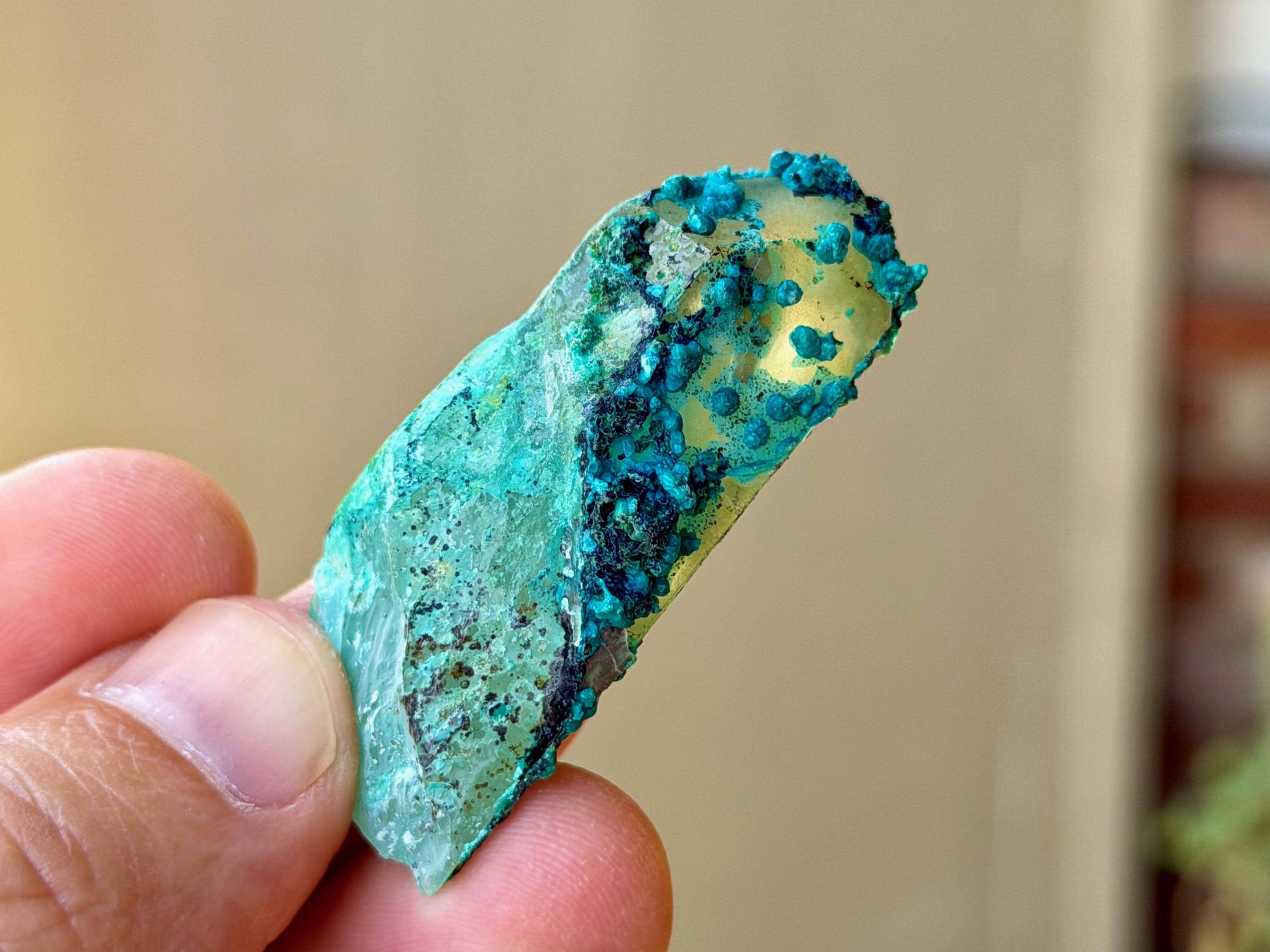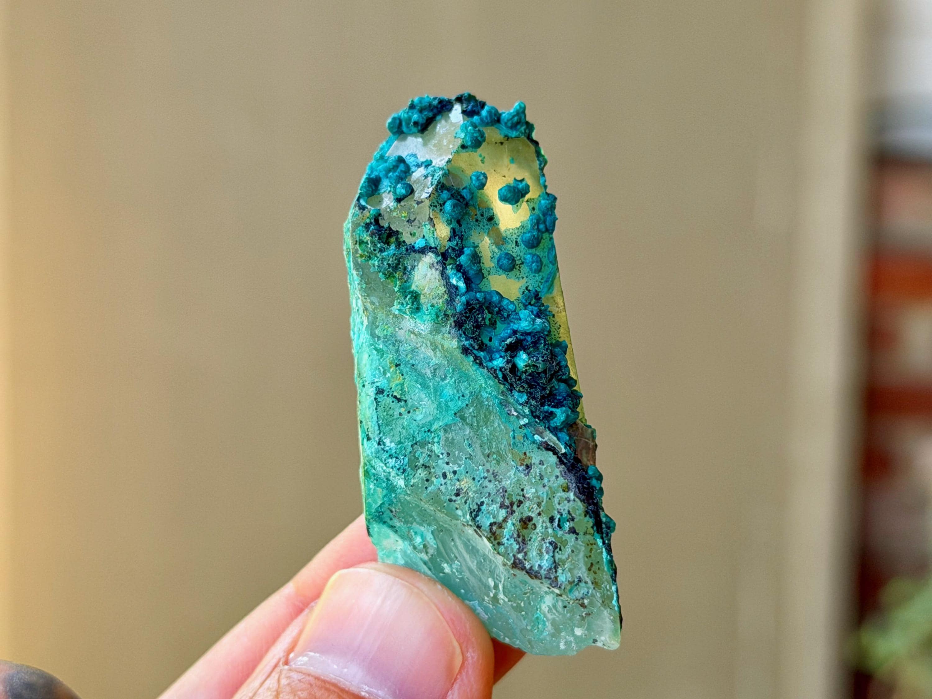 When backlit, as in Photos 3-5, we can see just how beautifully this piece lights up. The Quartz point is fully formed and terminated nicely, with some of the Chrysocolla covering the top. Outstanding color and quality!