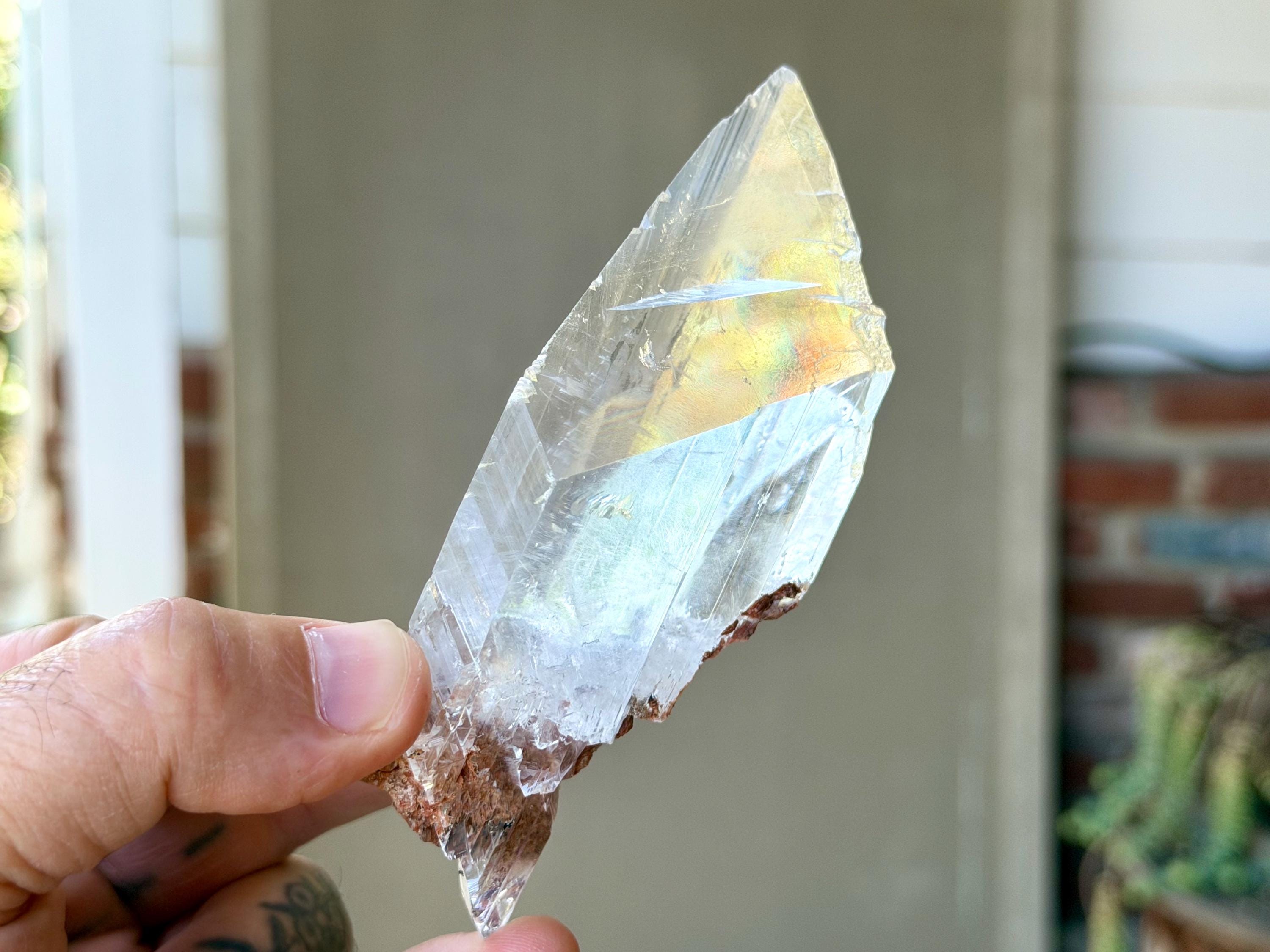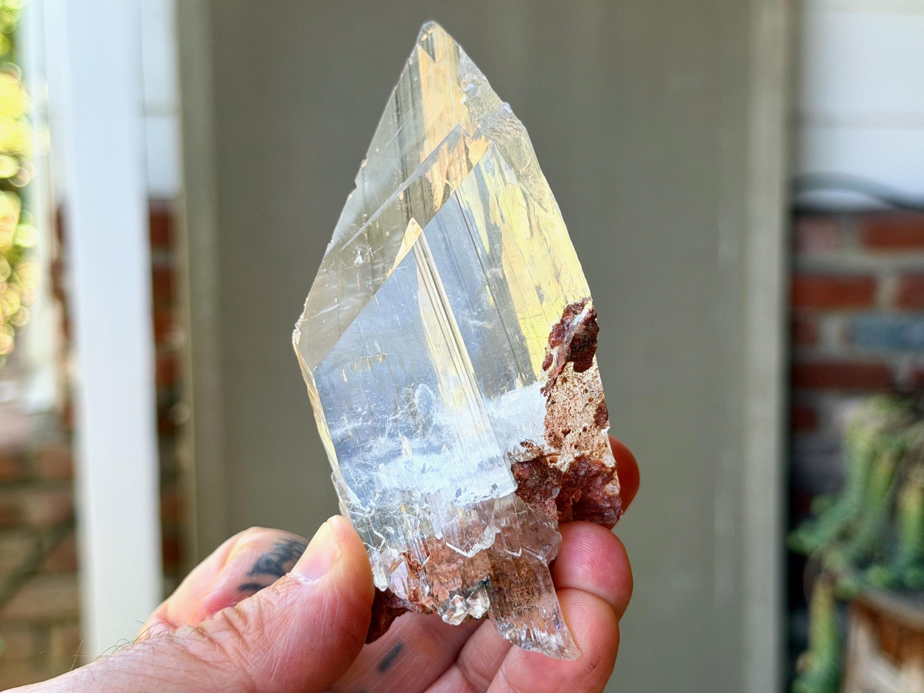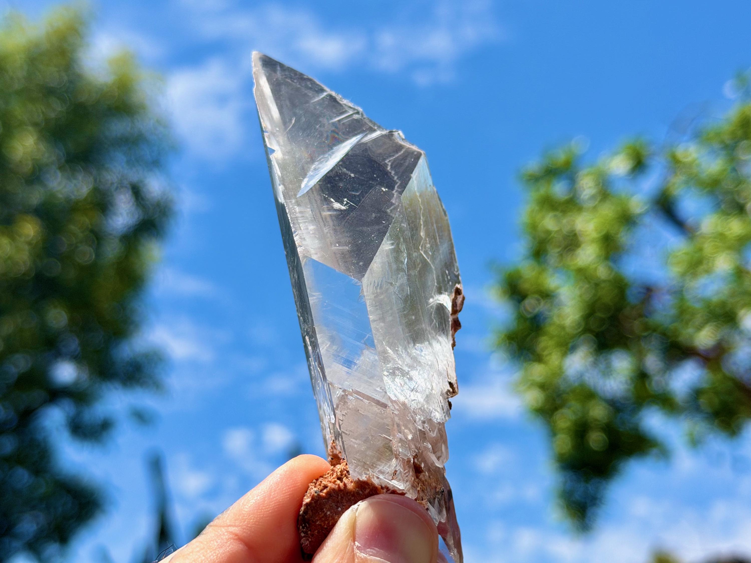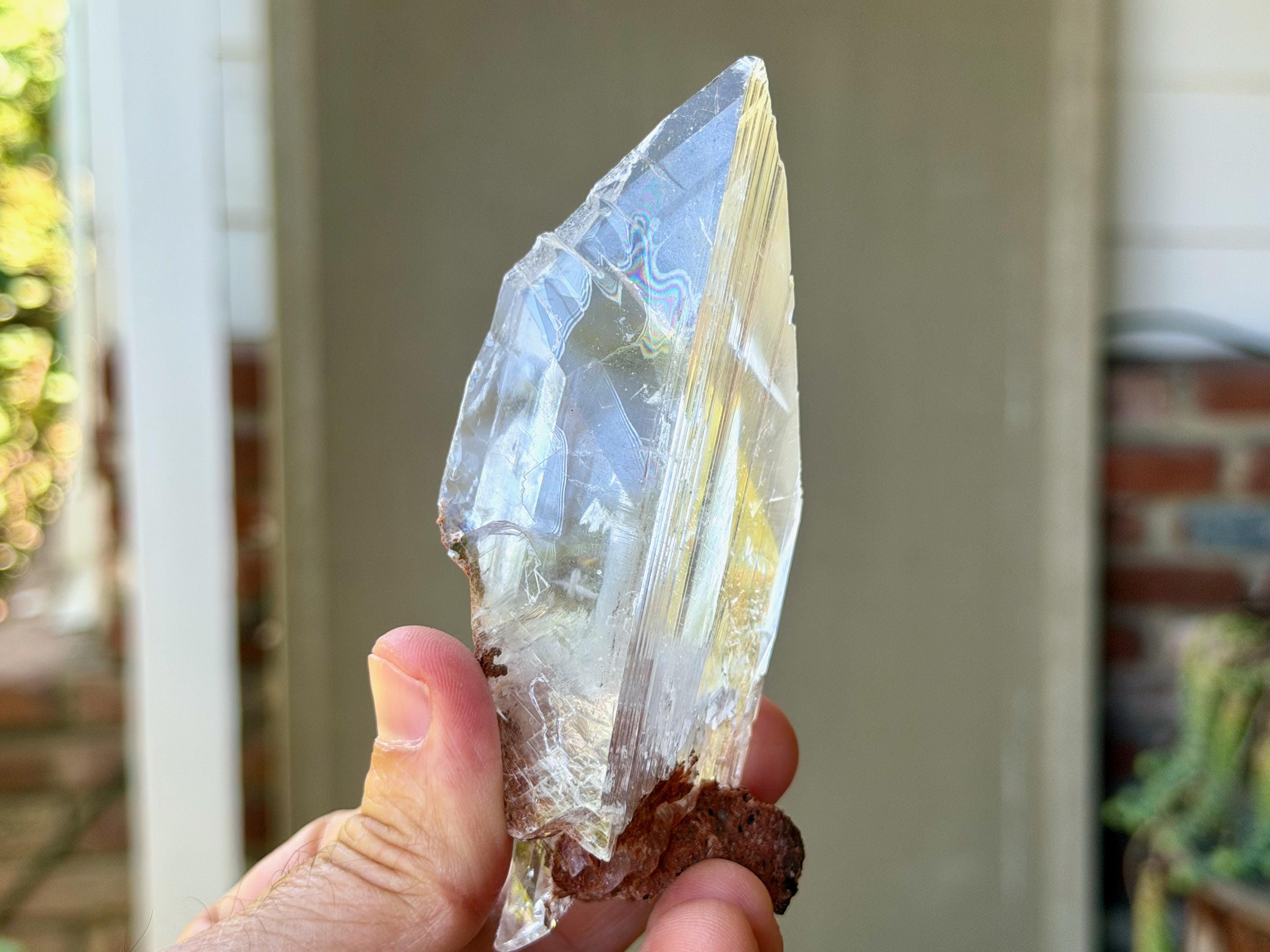 *Please note this crystal is clear and colorless. Any yellow hues in the photos are from the natural sunlight and surrounding greenery reflecting off the crystal.