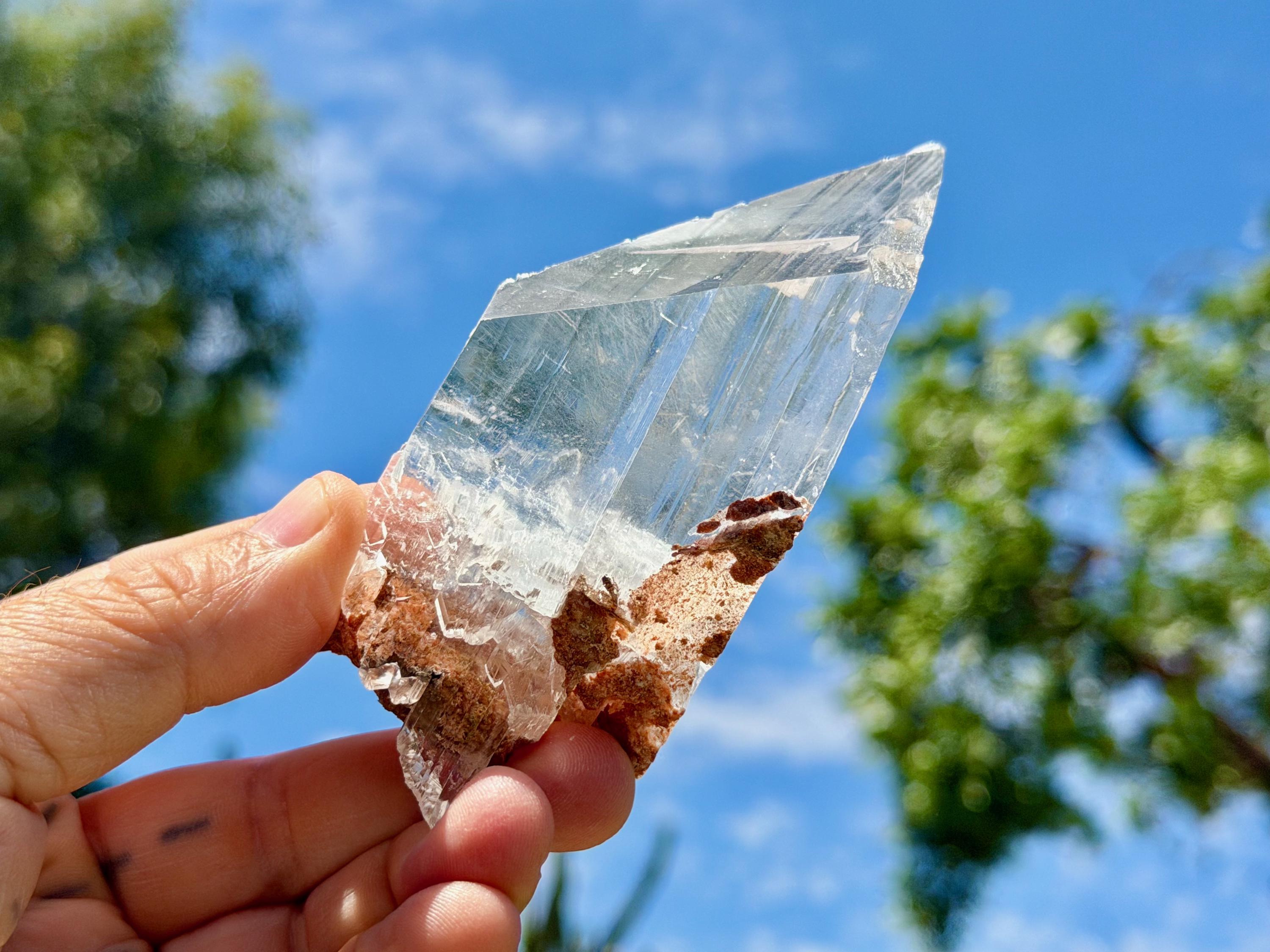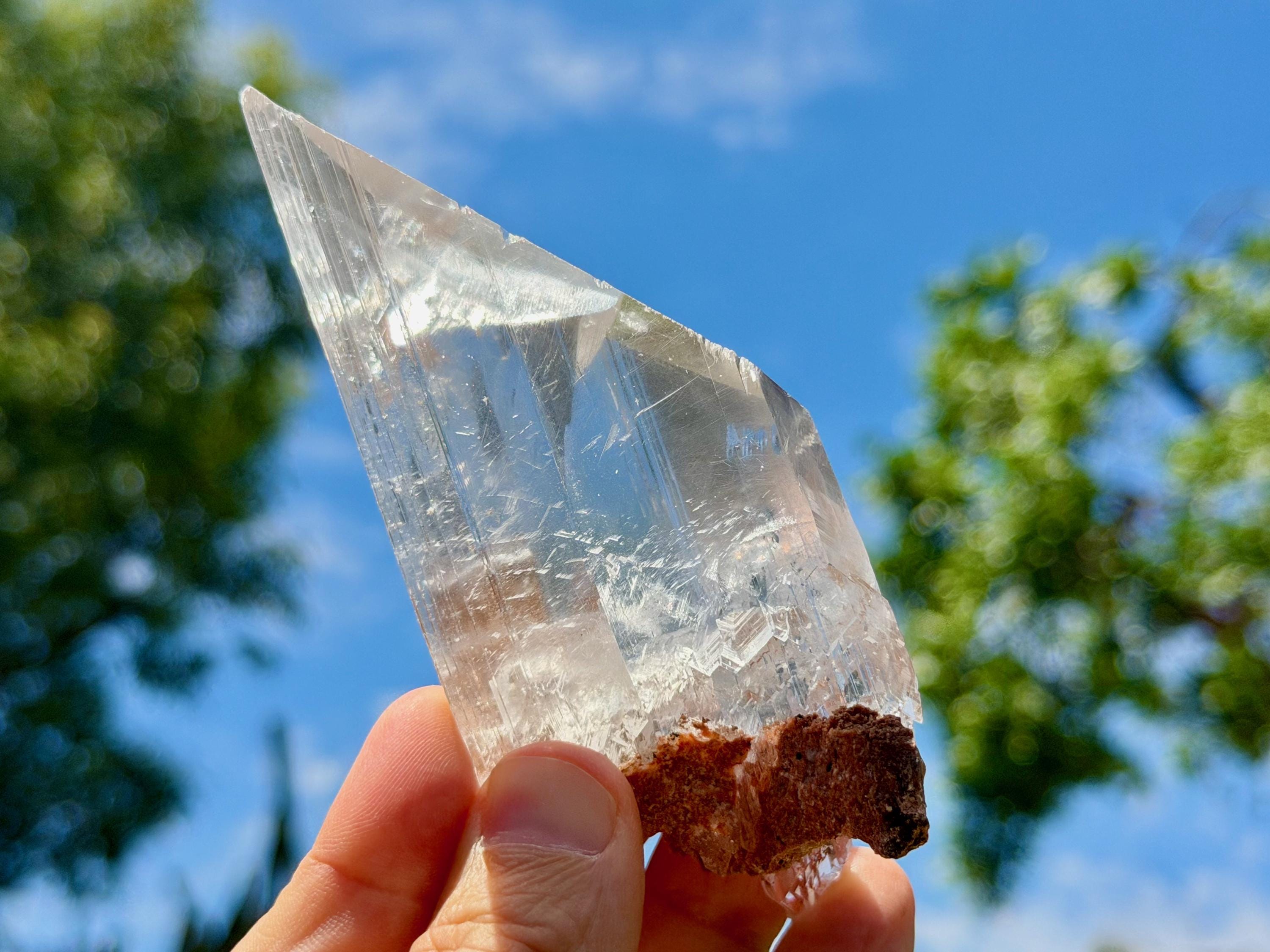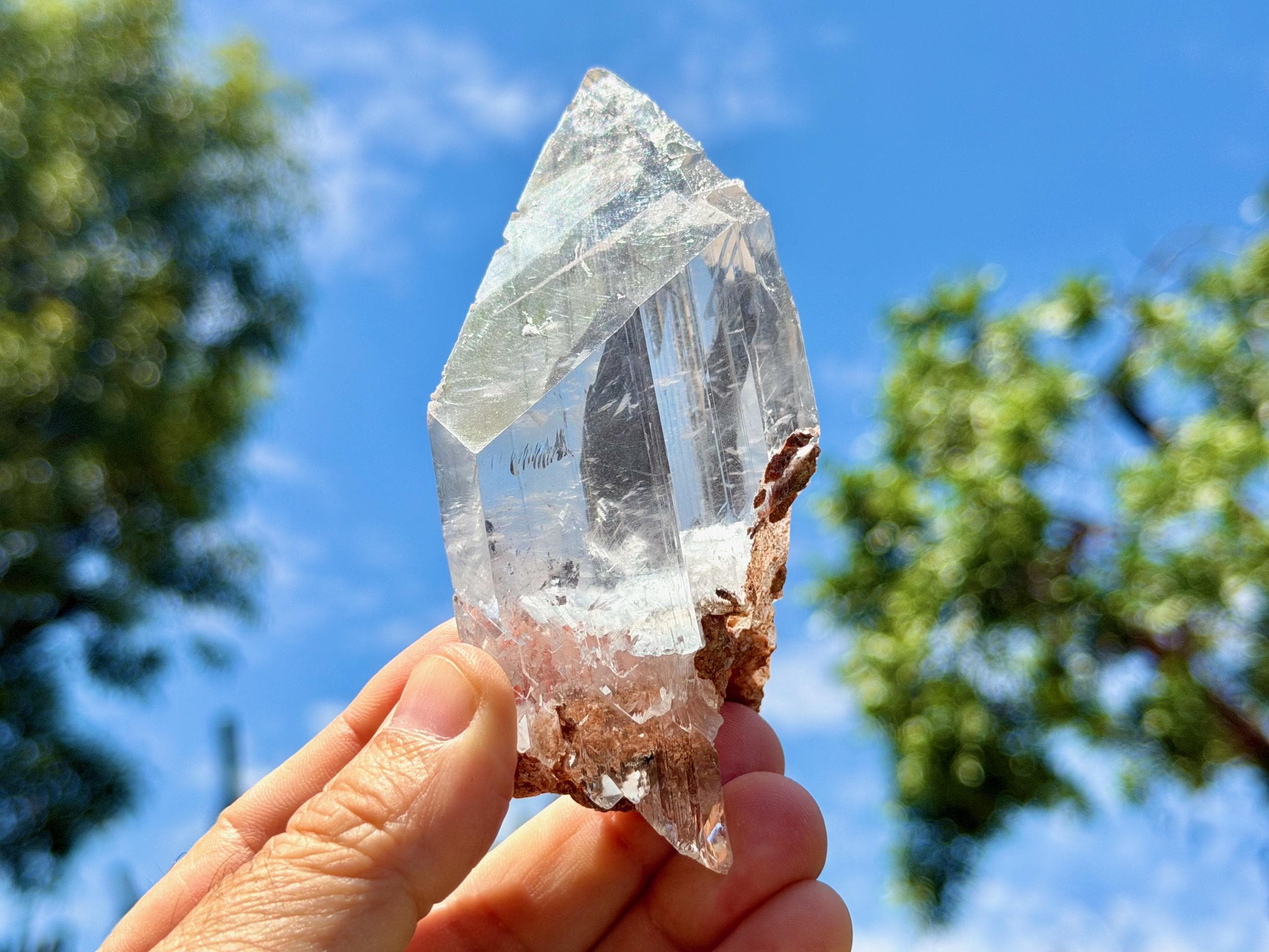 *Please note this crystal is clear and colorless. Any yellow hues in the photos are from the natural sunlight and surrounding greenery reflecting off the crystal.
