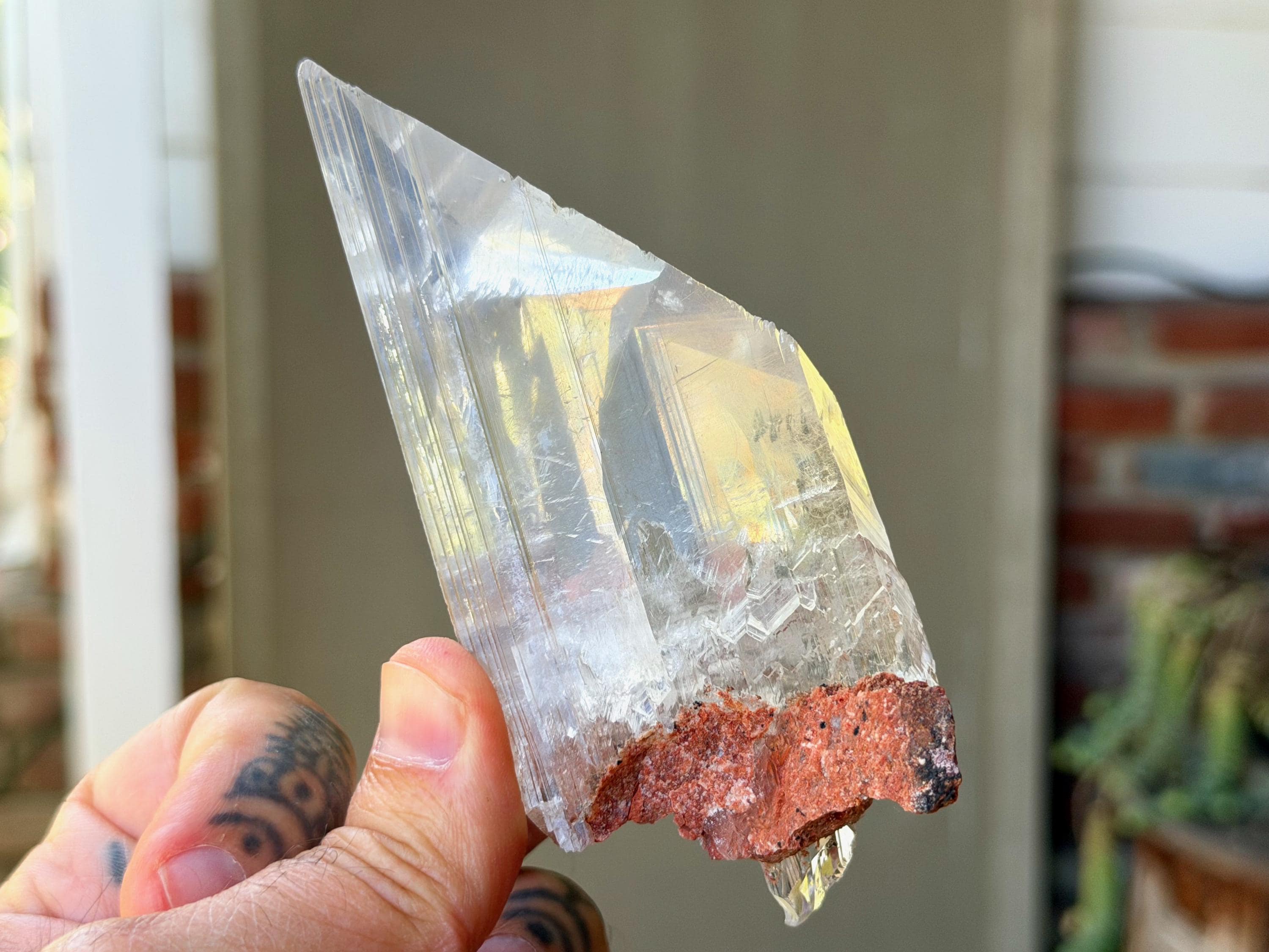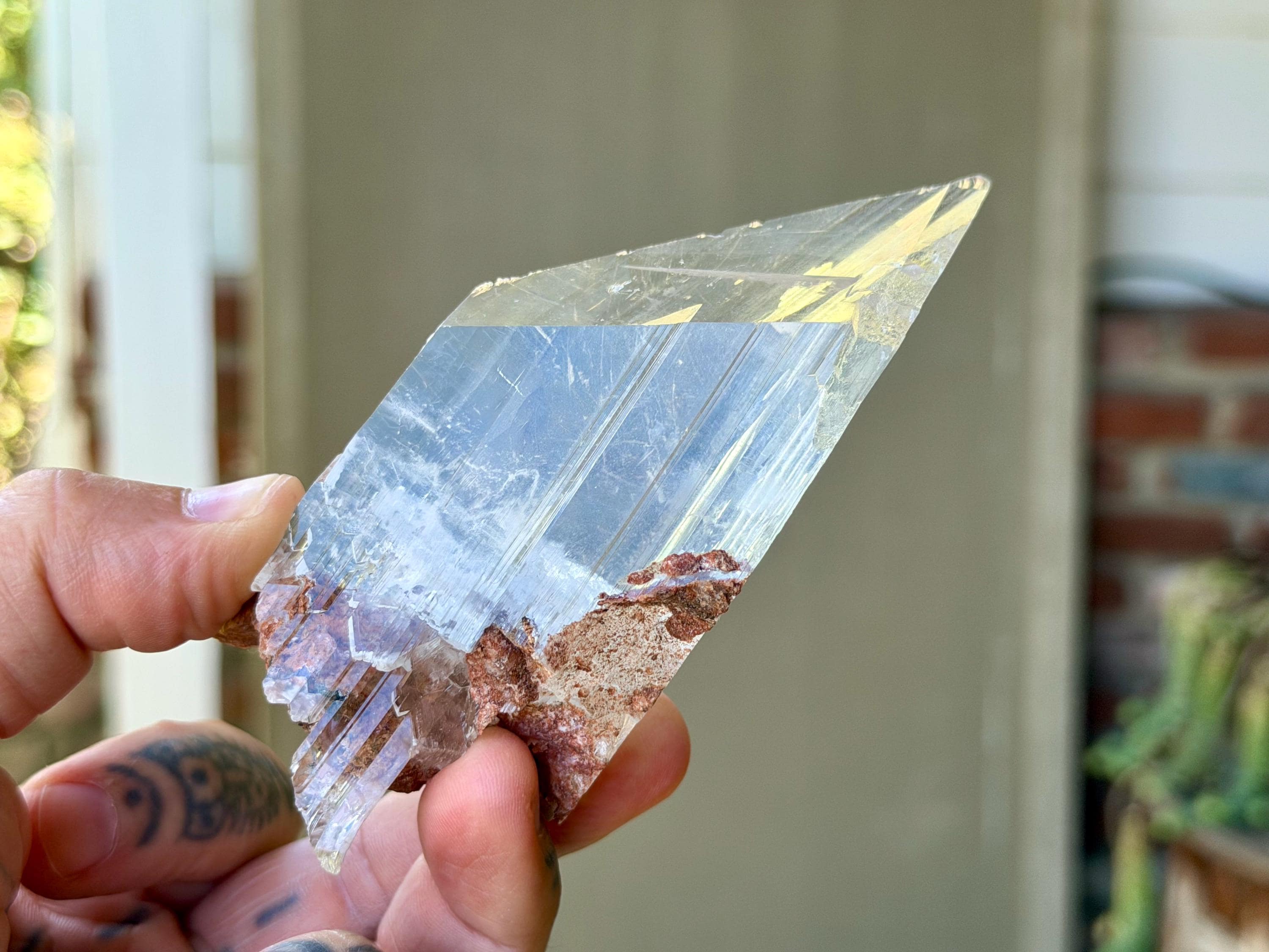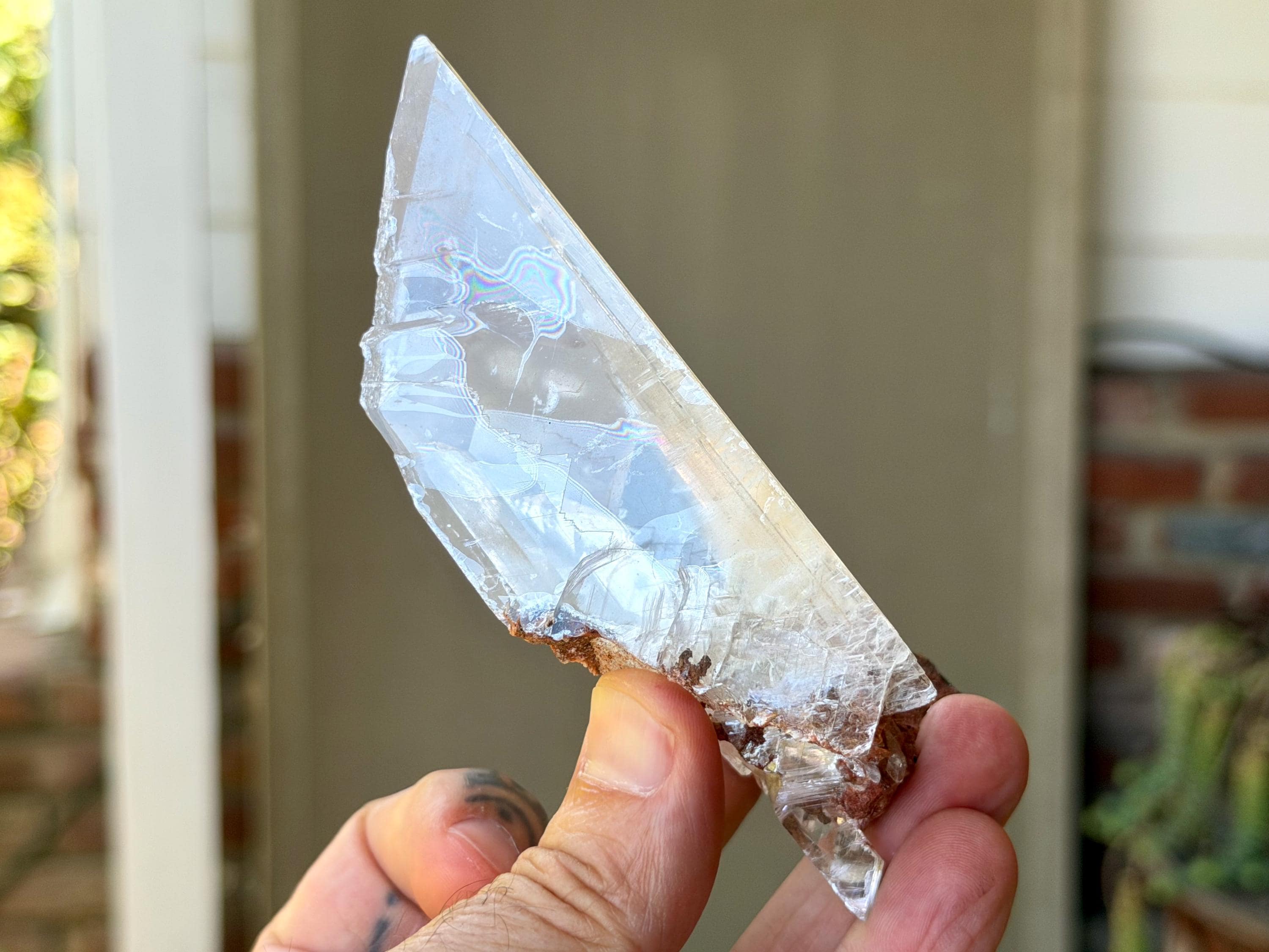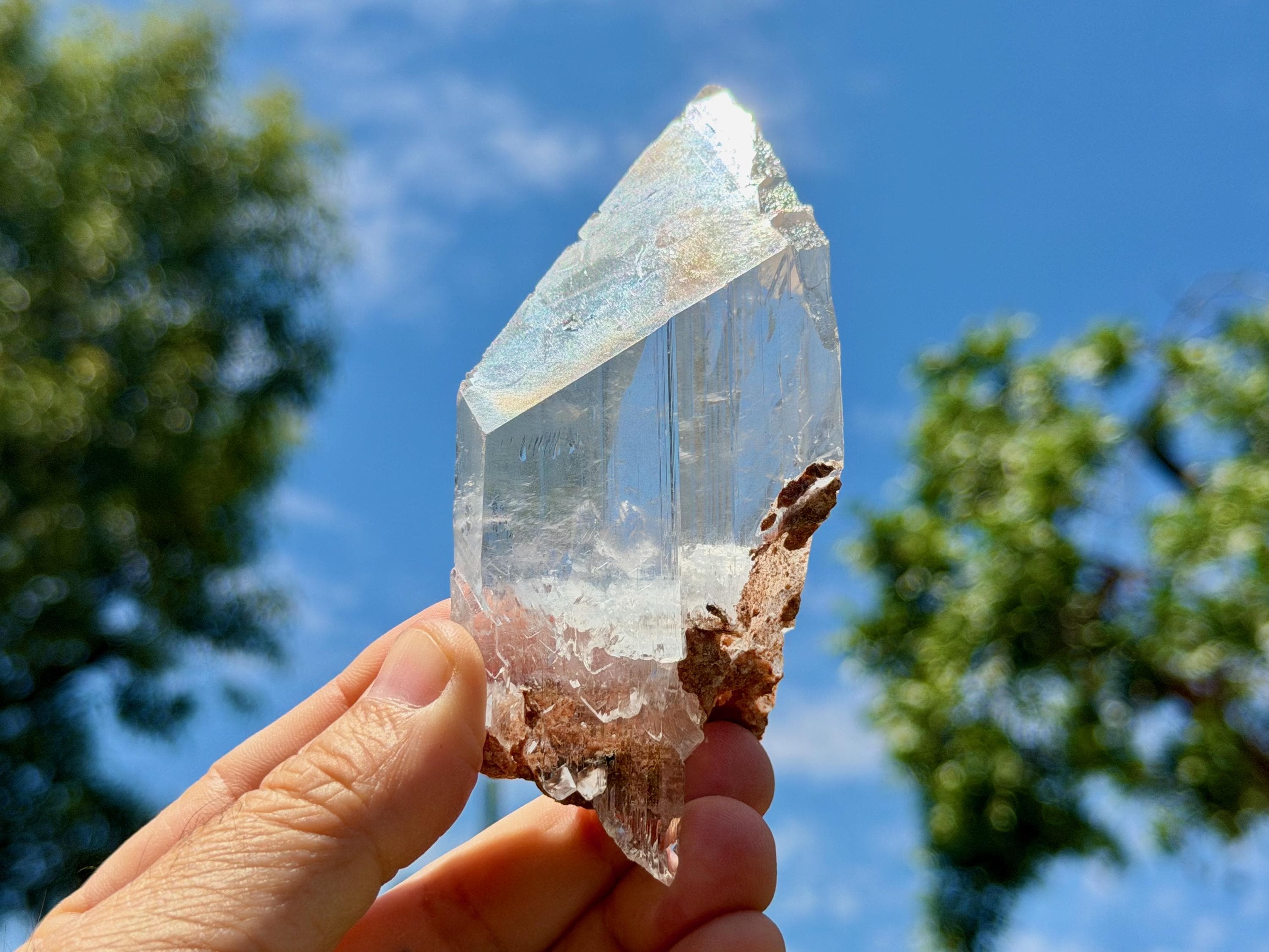 *Please note this crystal is clear and colorless. Any yellow hues in the photos are from the natural sunlight and surrounding greenery reflecting off the crystal.