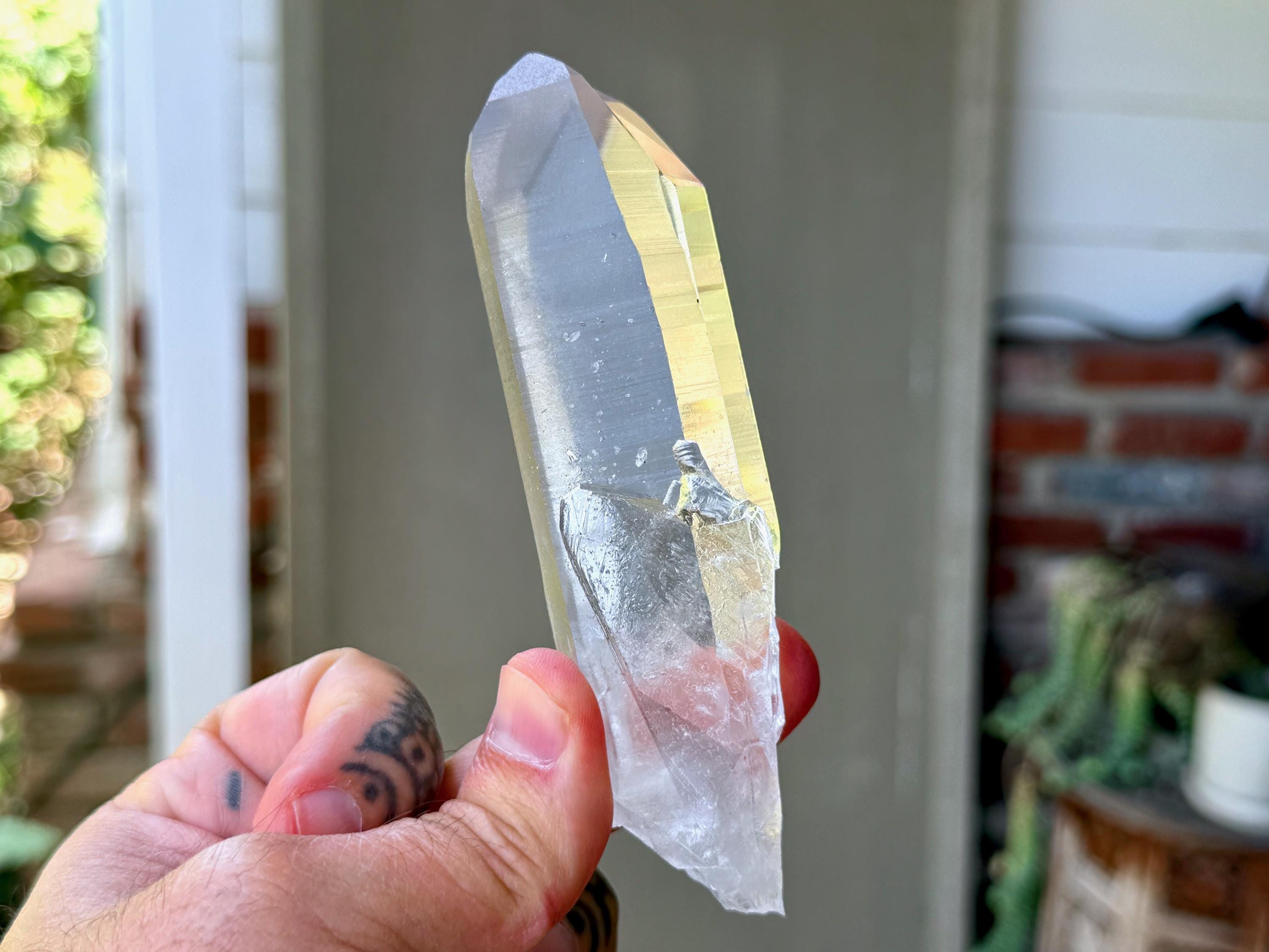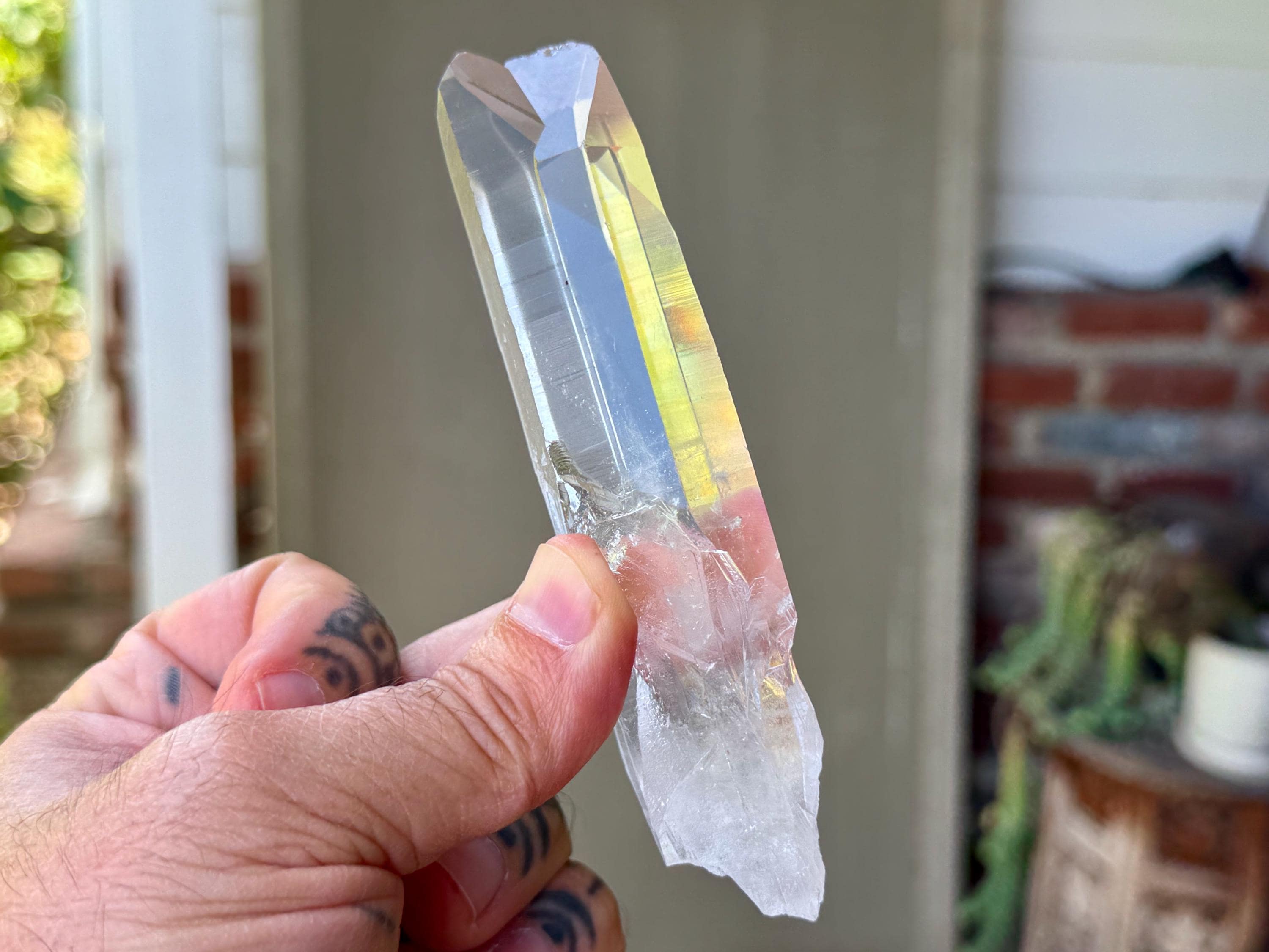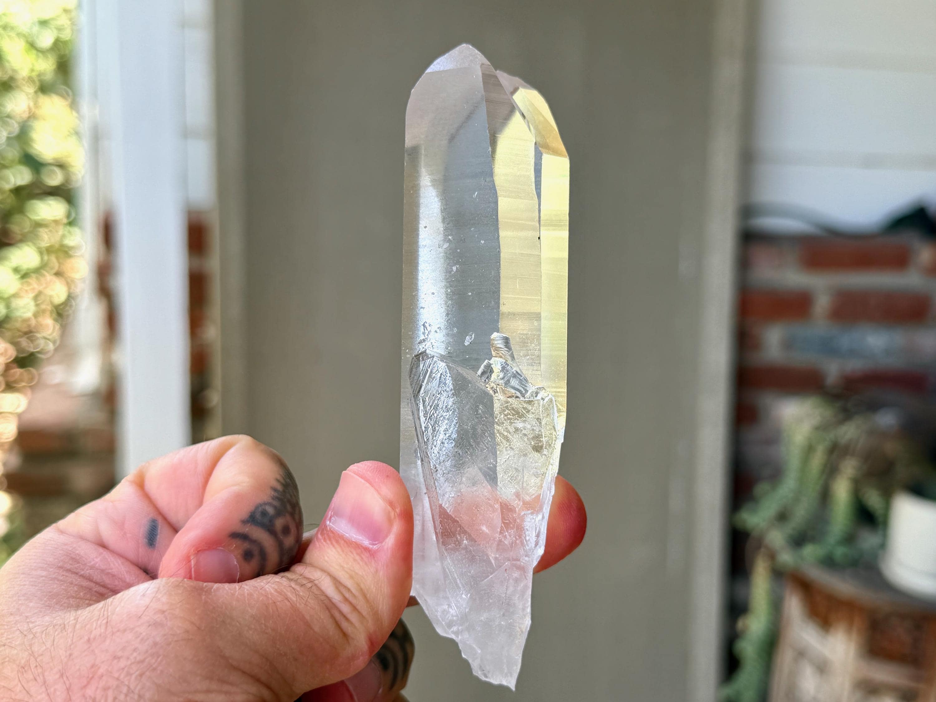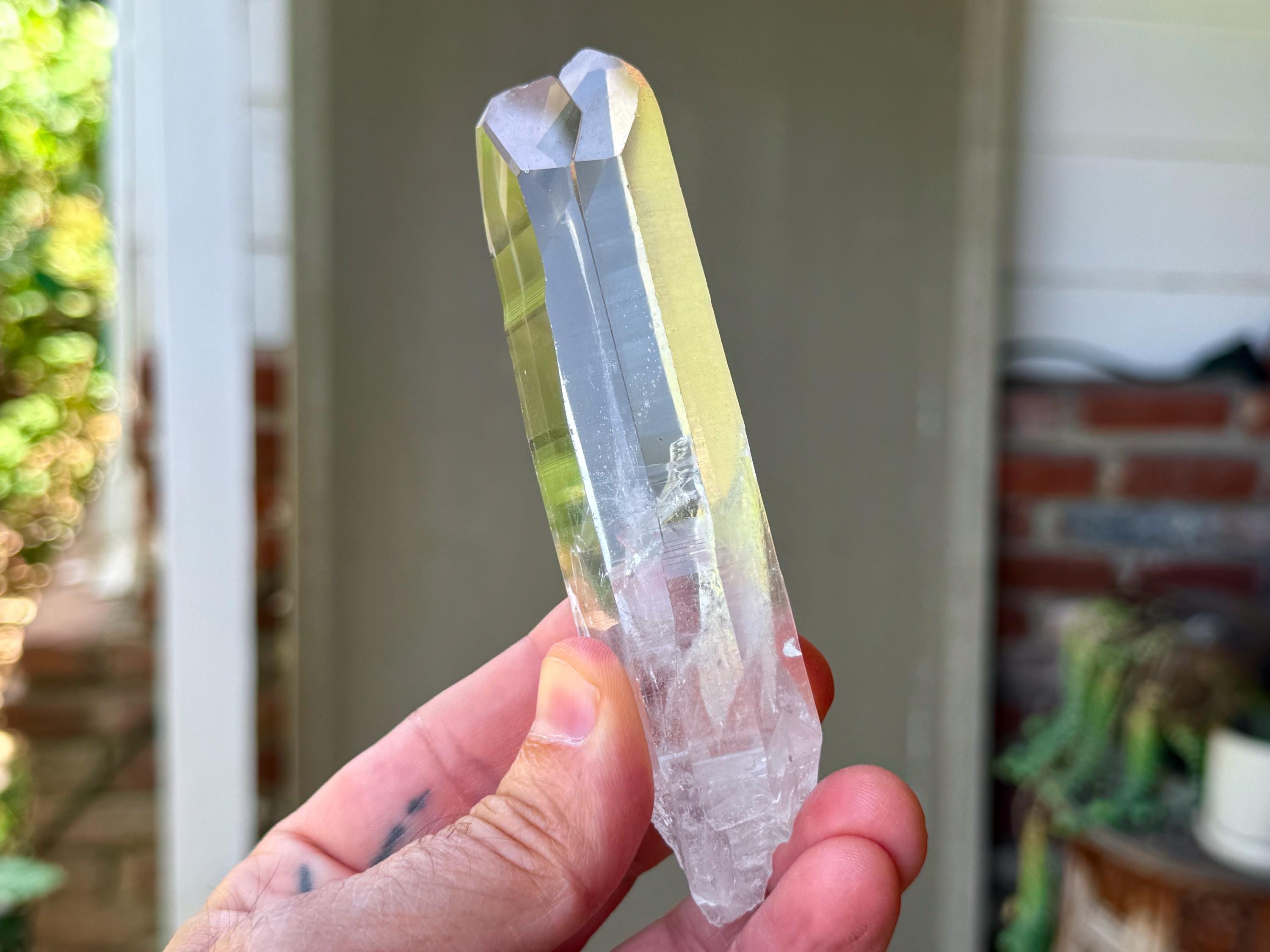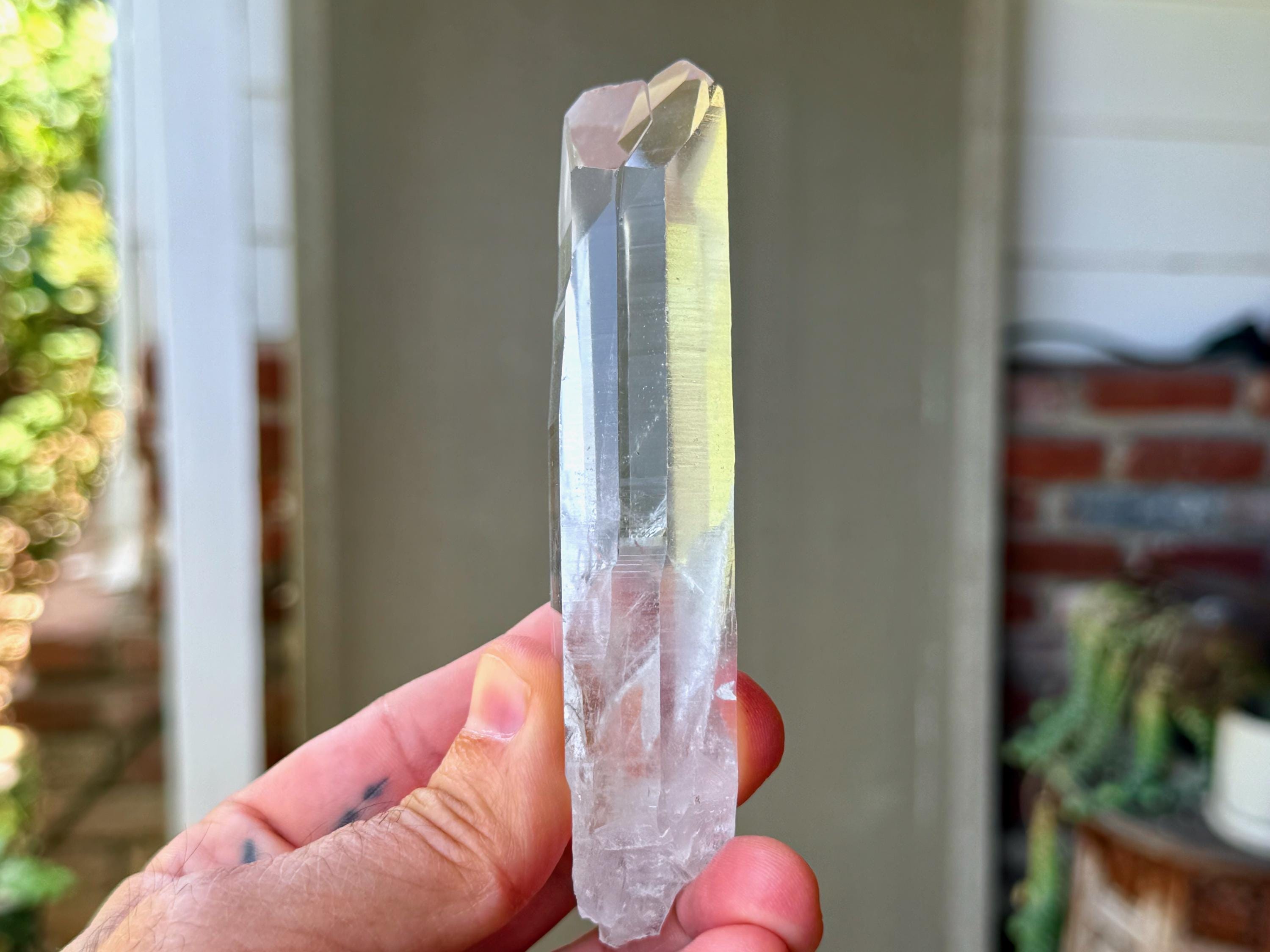 *Please note this crystal is clear and colorless. Any yellow hues in the photos are from the natural sunlight and surrounding environment reflecting off the crystal.