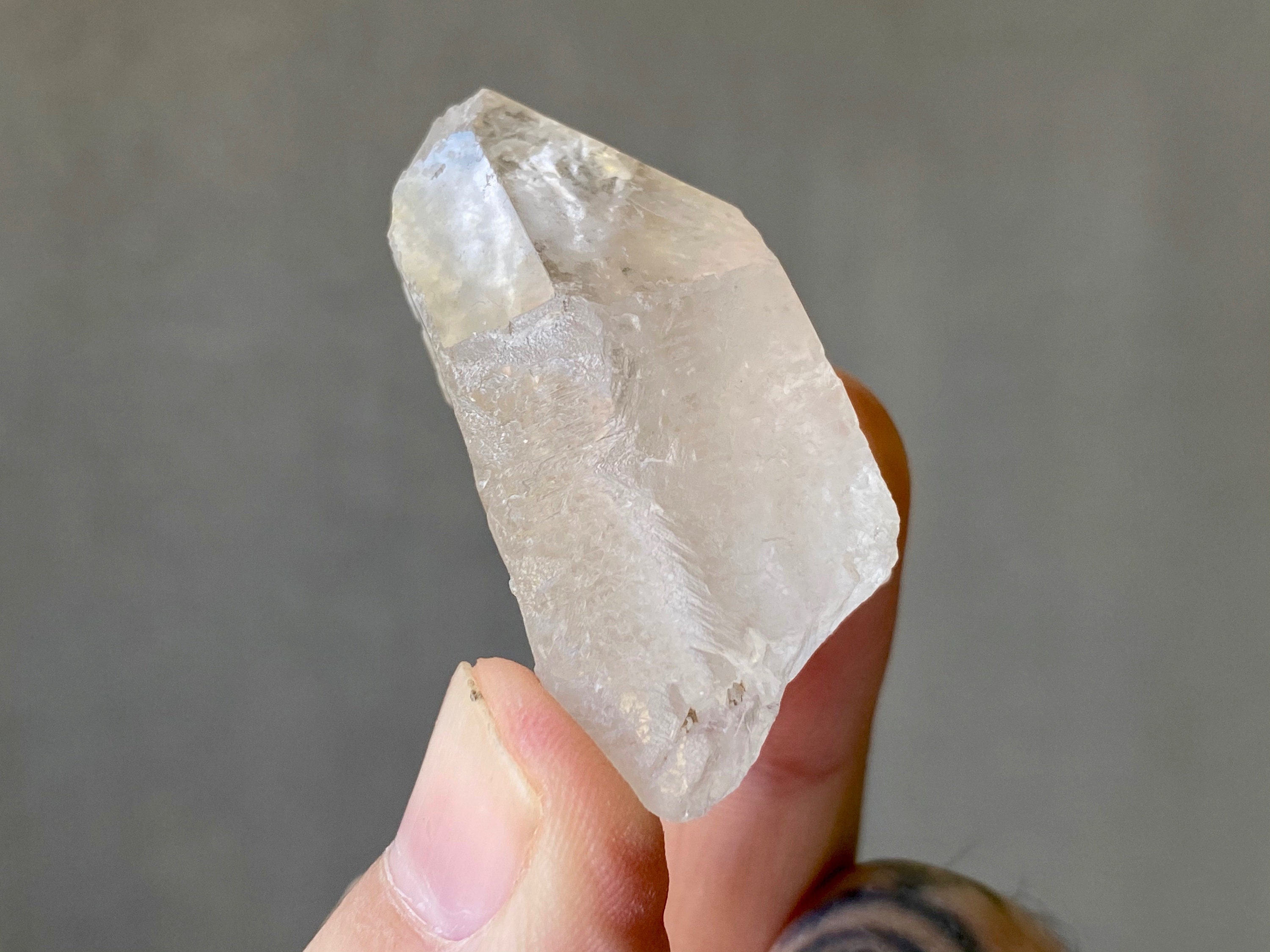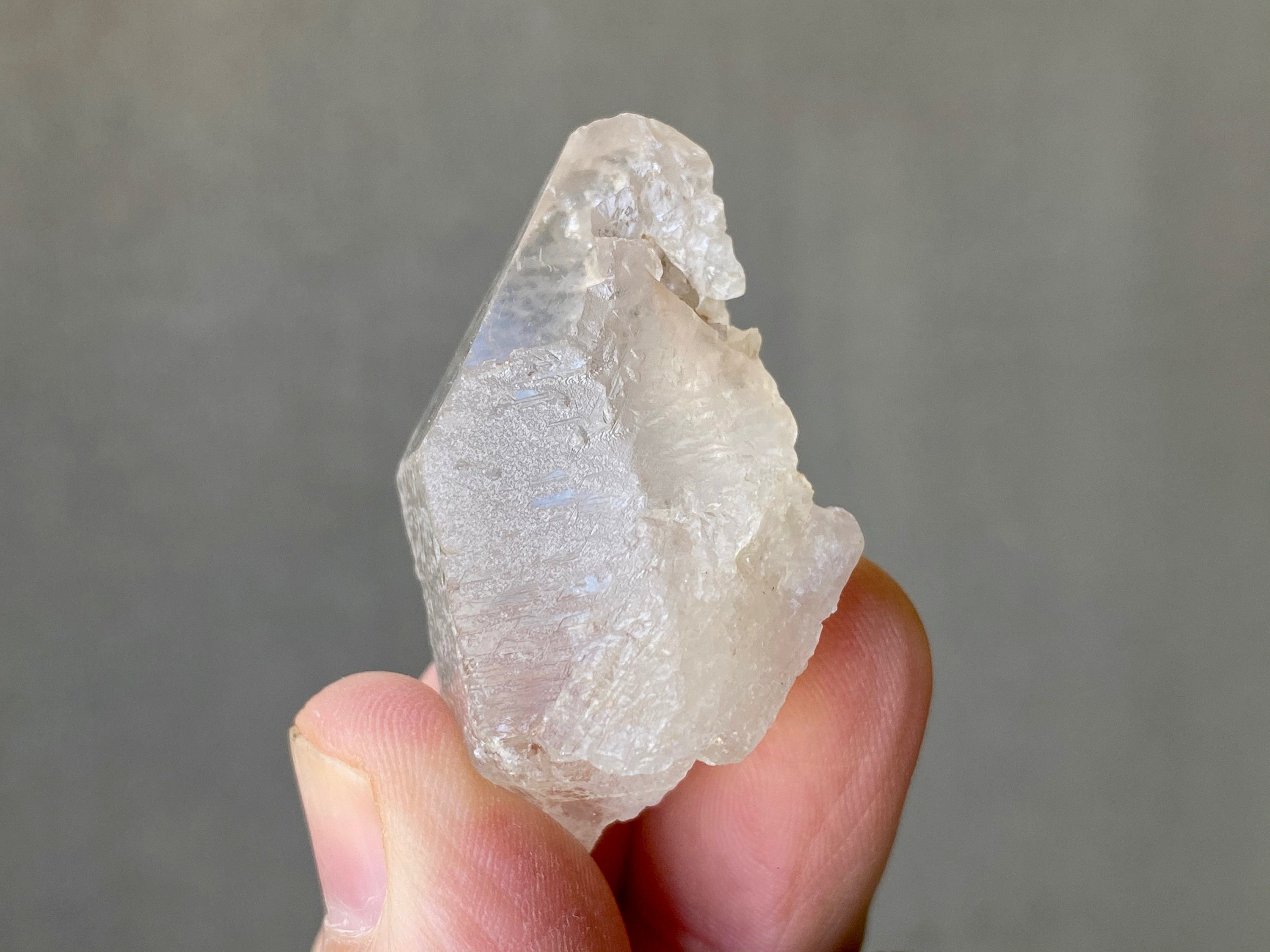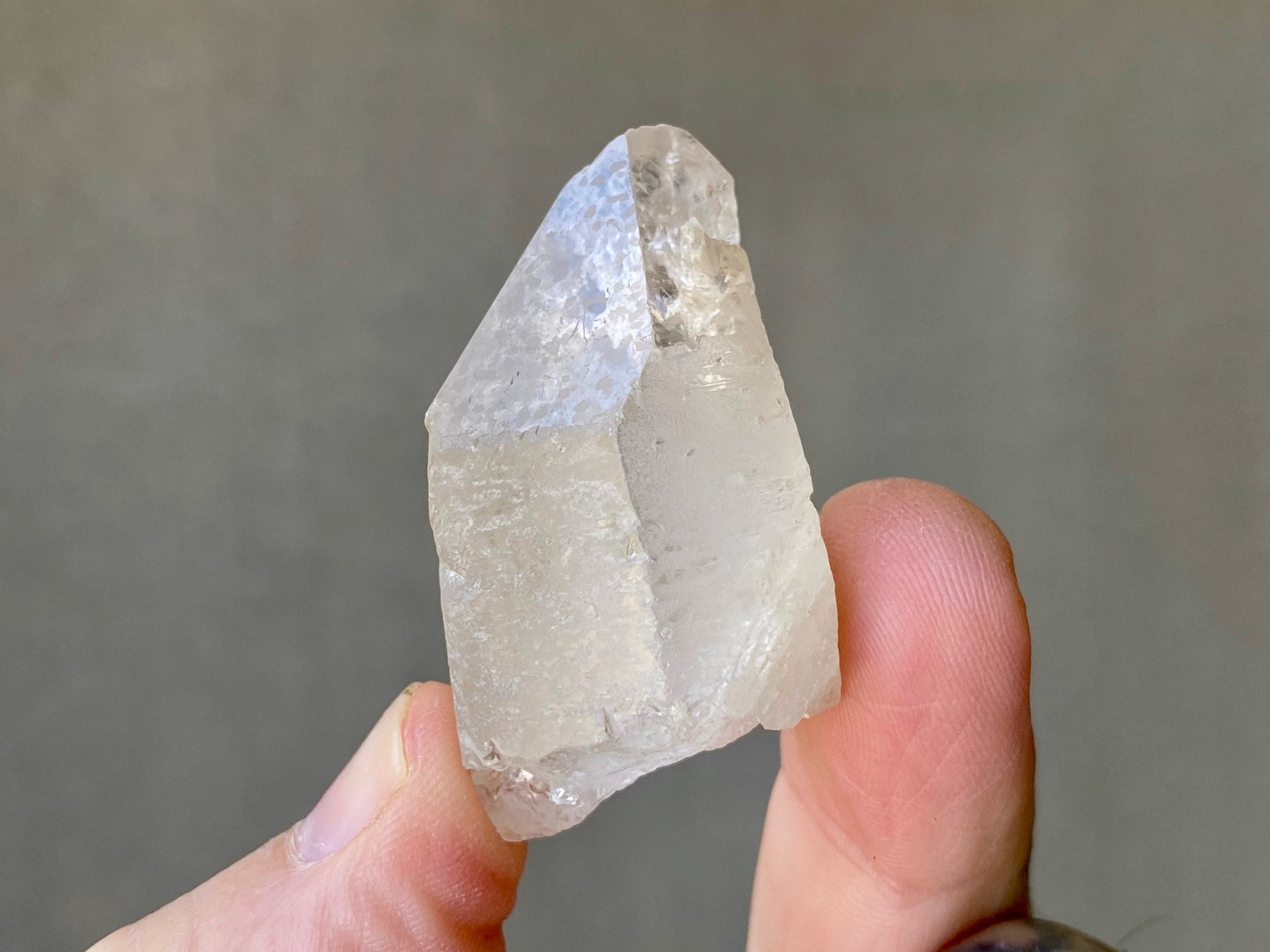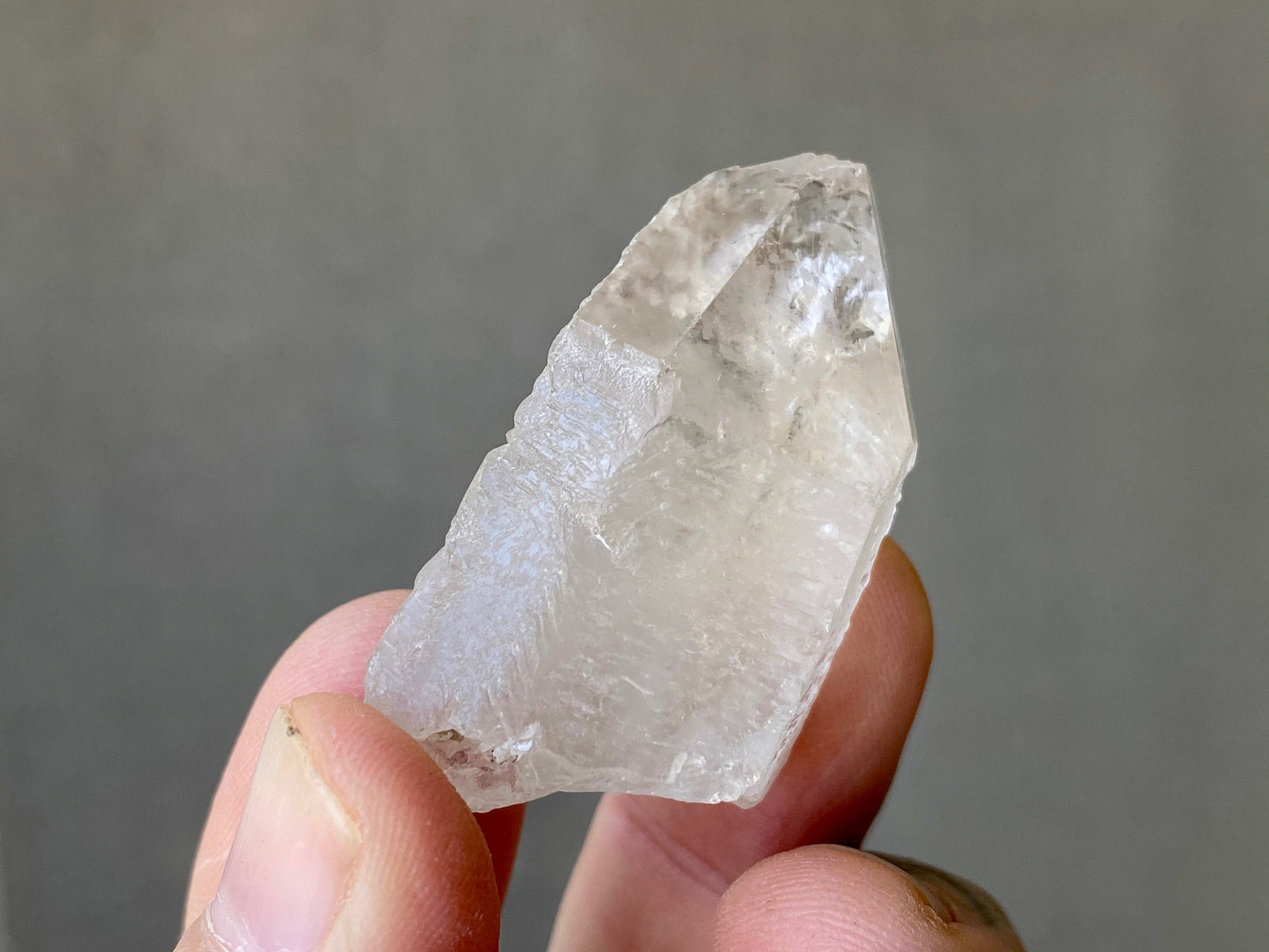Mildly frosted exterior looks a bit like sea-glass, with wonderful textures on the sides and a very clear sloping main facet. Excellent termination.
