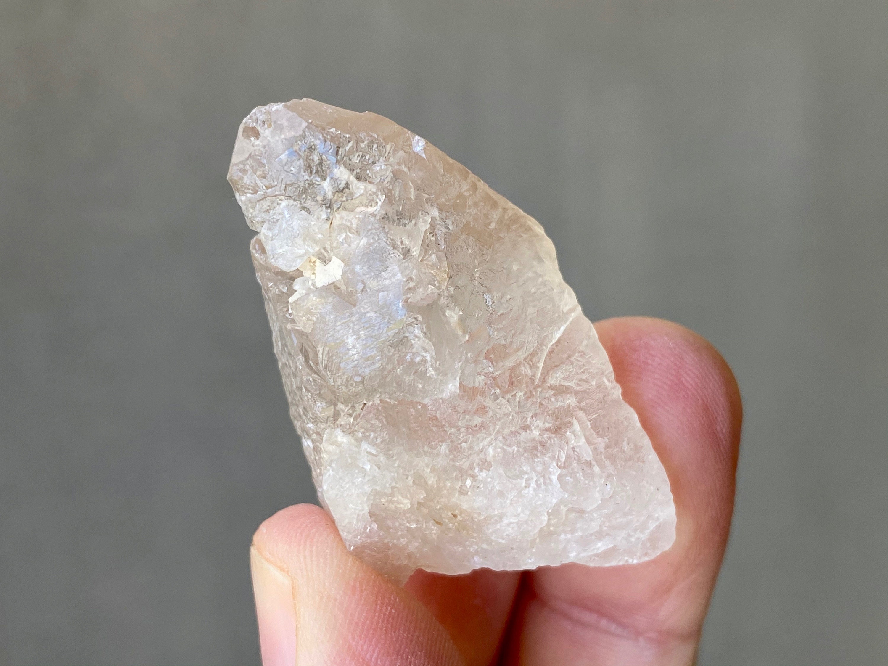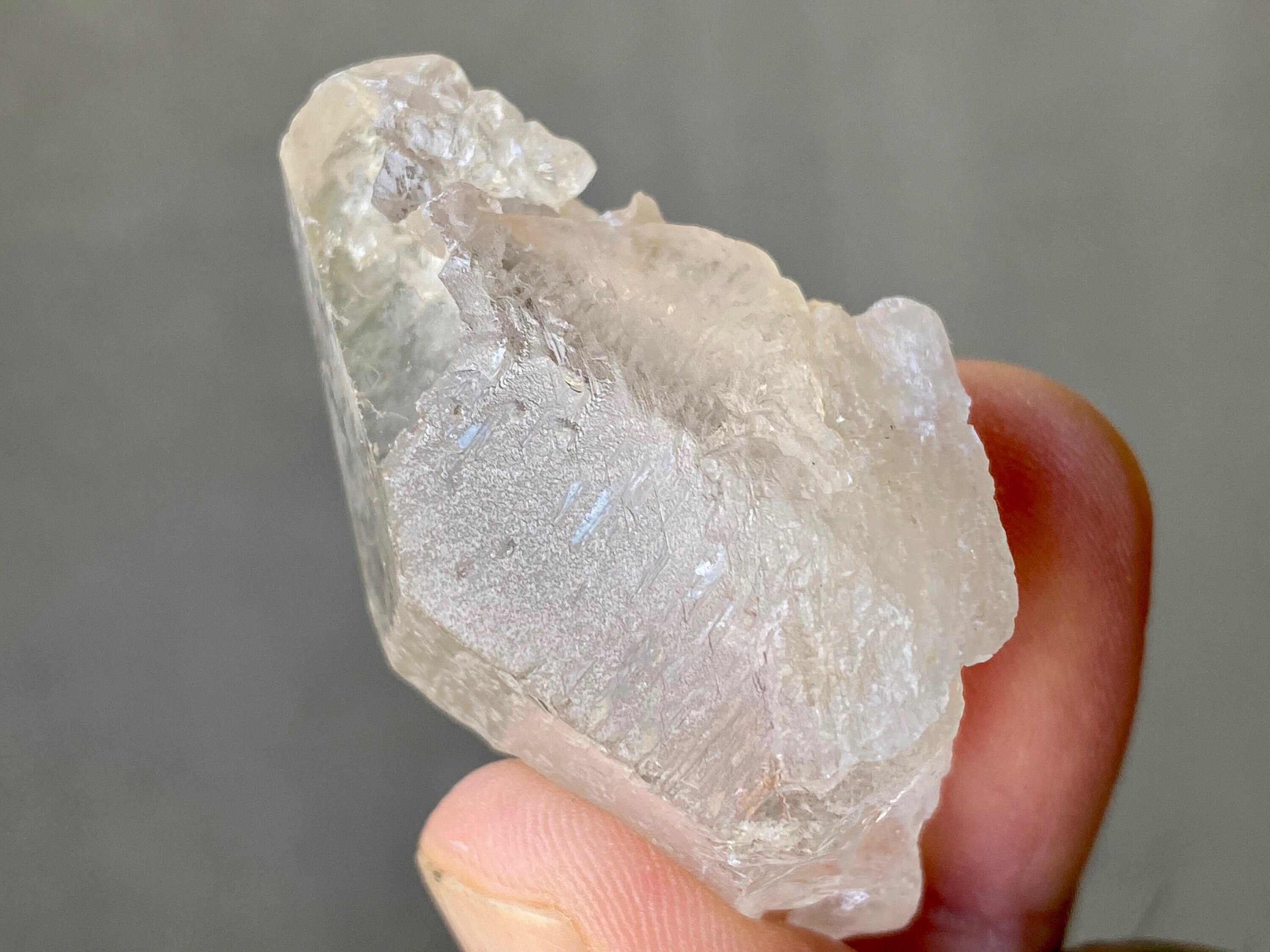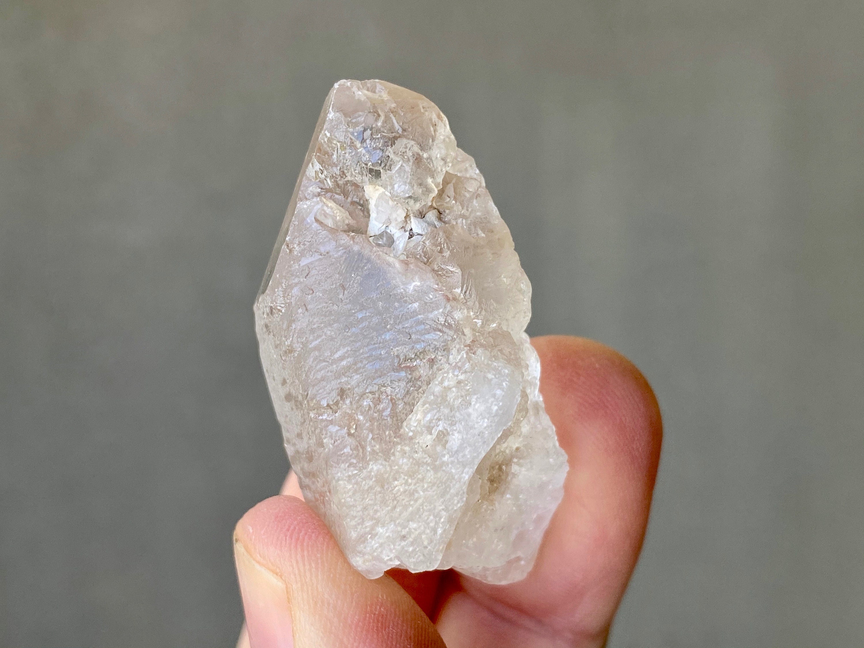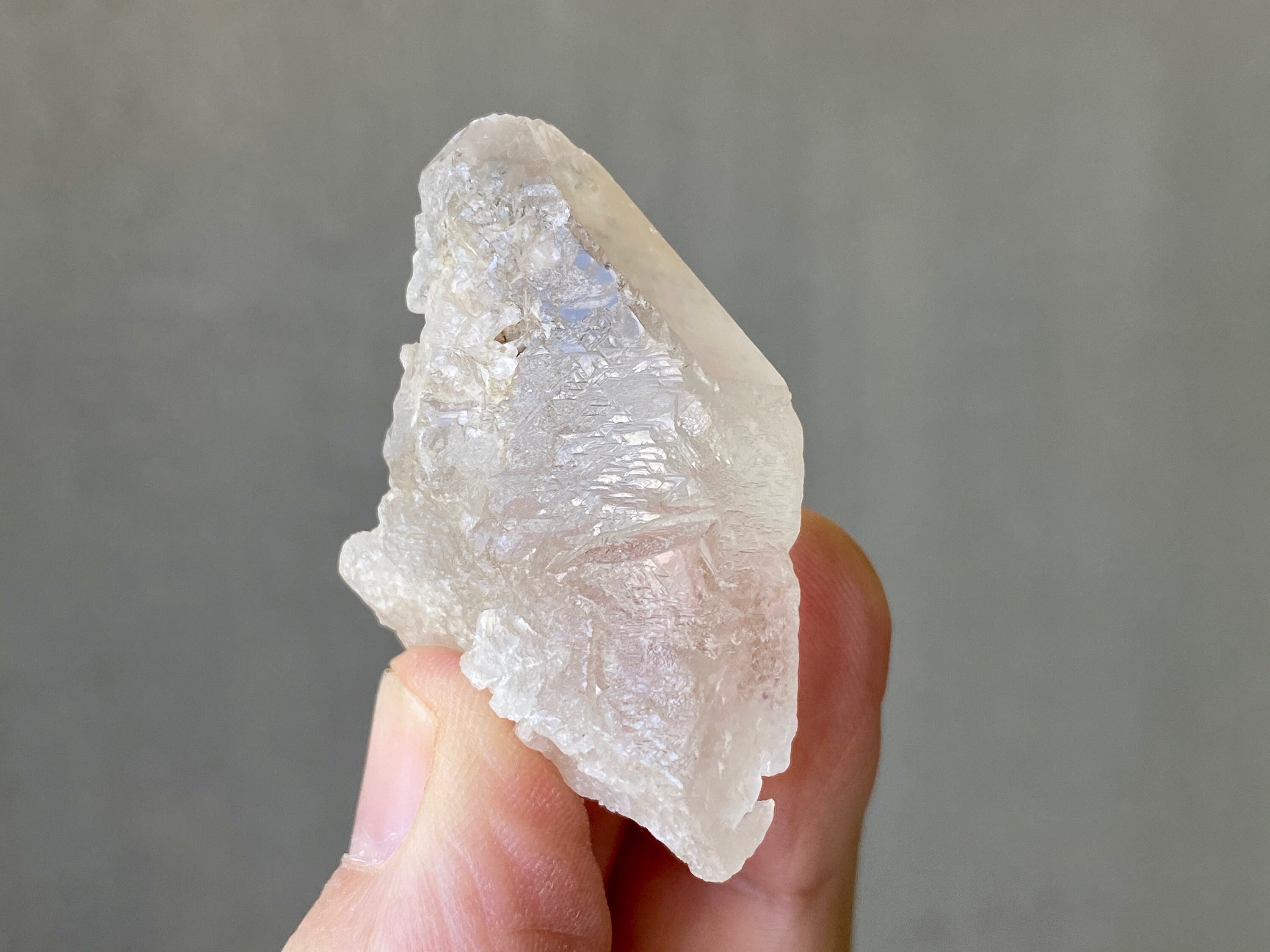 Mildly frosted exterior looks a bit like sea-glass, with wonderful textures on the sides and a very clear sloping main facet. Excellent termination.
